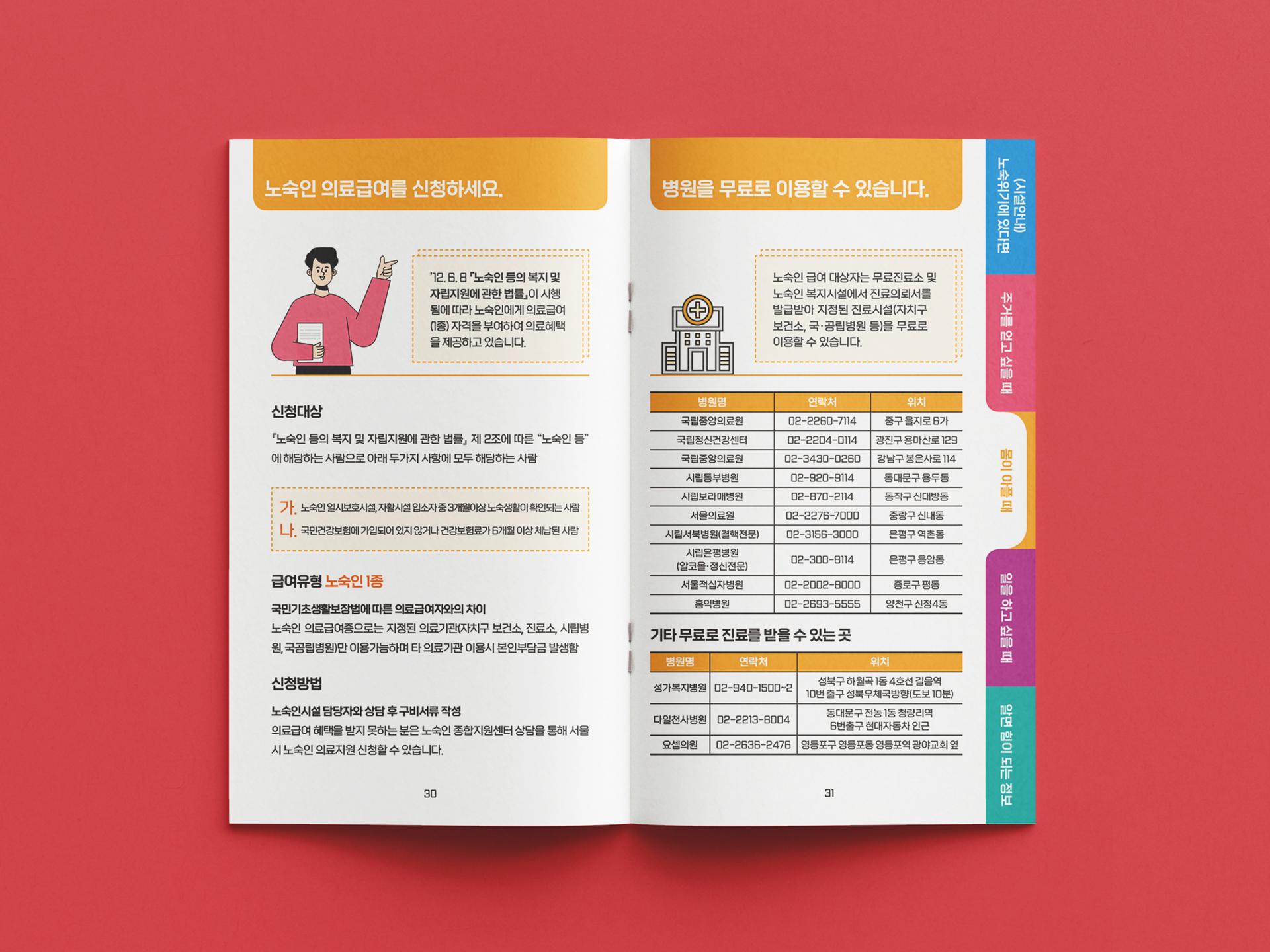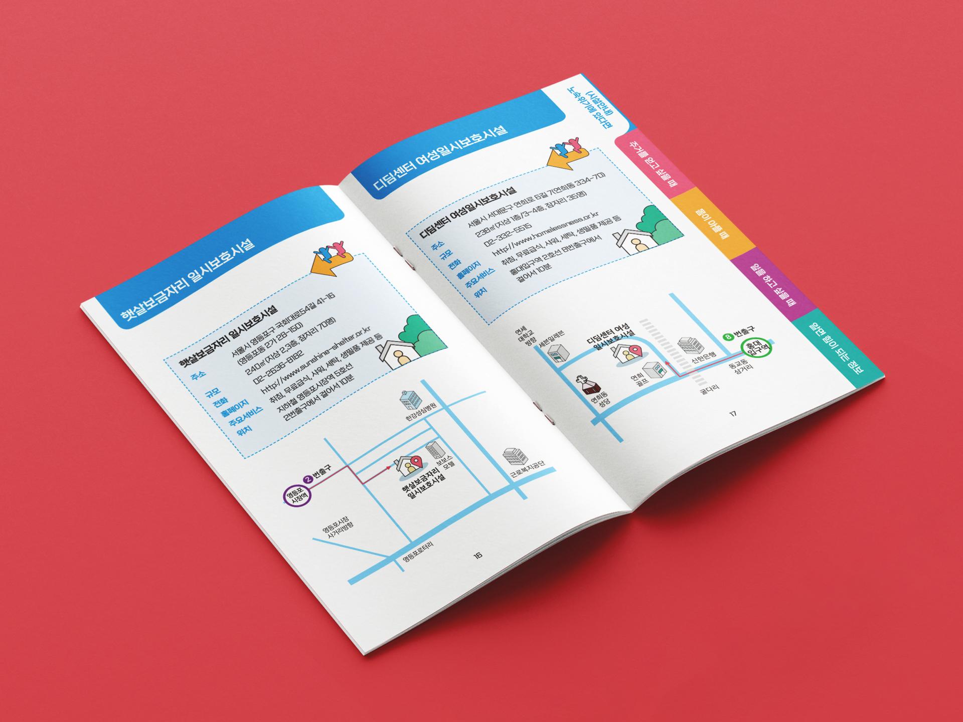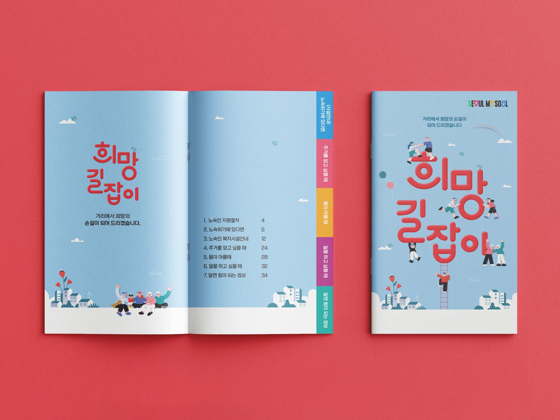 노숙인 지원 정보를 안내하는 소책자 브로셔입니다. 높은 연령대가 주 사용층임을 고려하여, 챕터별로 내용을 쉽게 찾을 수 있게 사이드 탭지를 크게 배치하고 컬러로 포인트를 주었습니다. 표지엔 둥근 모양의 타이포와 일러스트 소스를 사용하여 부드럽고 경쾌한 느낌을 내고, 내지는 페이지 별로 핵심 내용을 박스로 강조하여 가독성을 높였습니다.