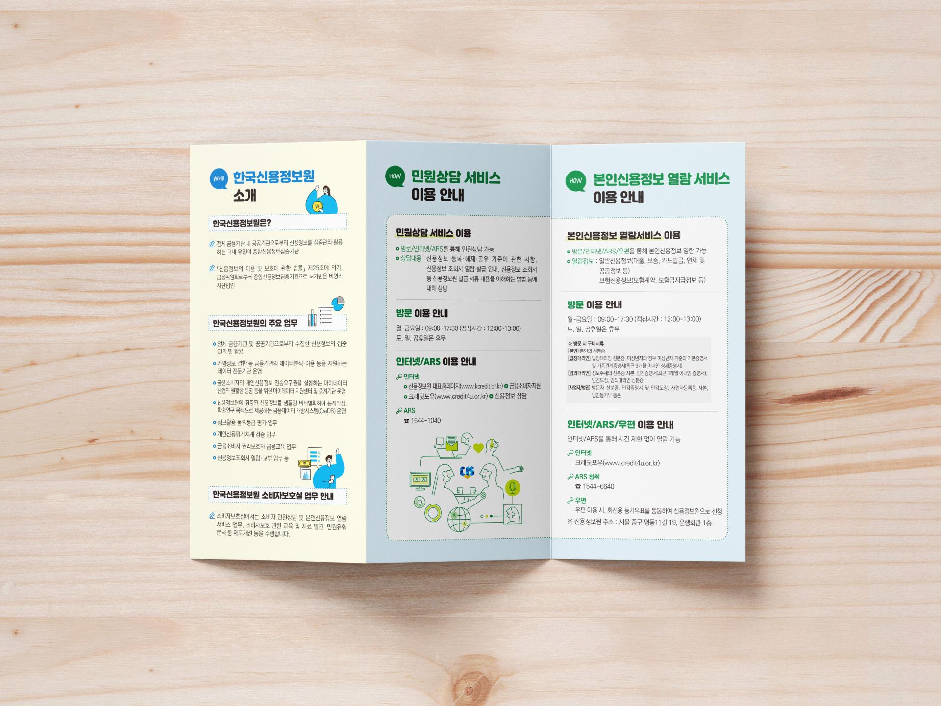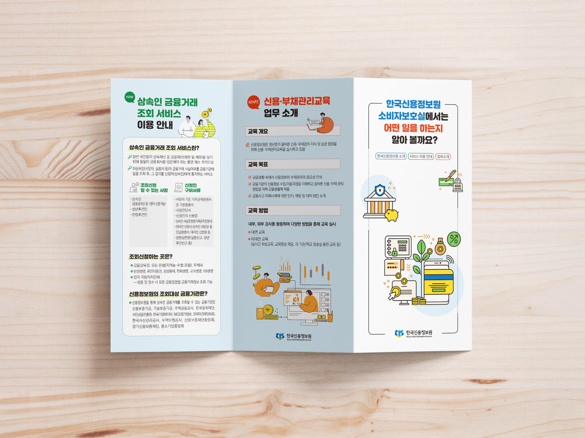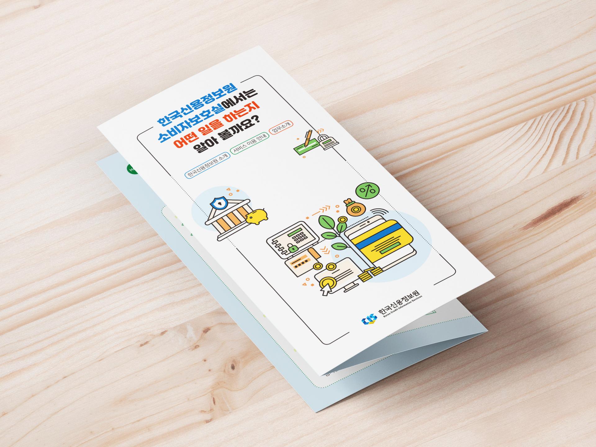 한국신용정보원의 소비자보호실 소개 및 이용안내에 대한 홍보물로 라인 아이콘과 다양한 일러스트로 주목도와 이해도를 높인 리플렛 디자인입니다. 중요 정보 분량이 많아 공간 분배와 배치를 우선적으로 고려하였고, 제목과 본문의 볼륨에 대비를 주고 글머리 기호를 적절하게 활용해 가독성을 높였습니다.