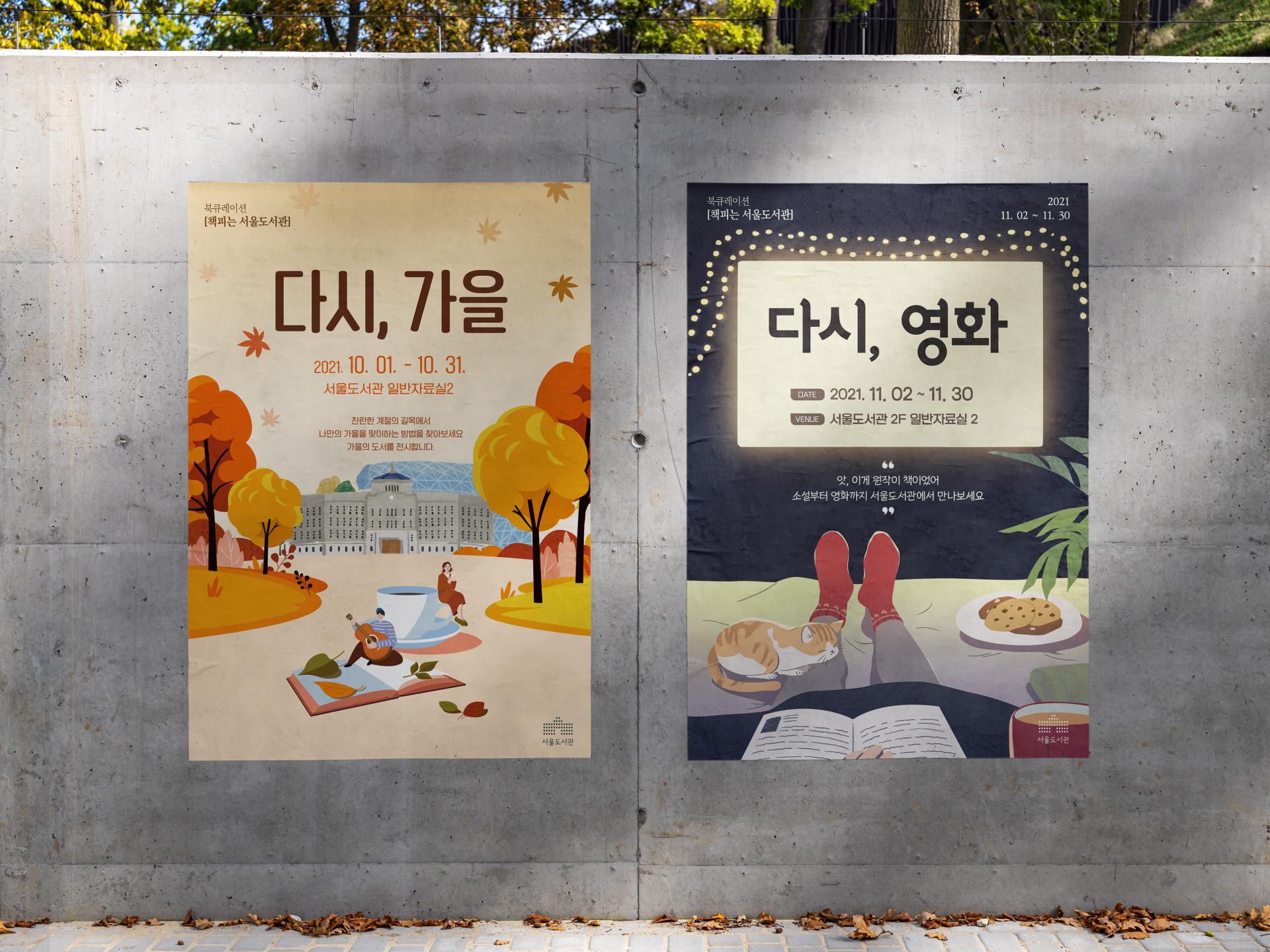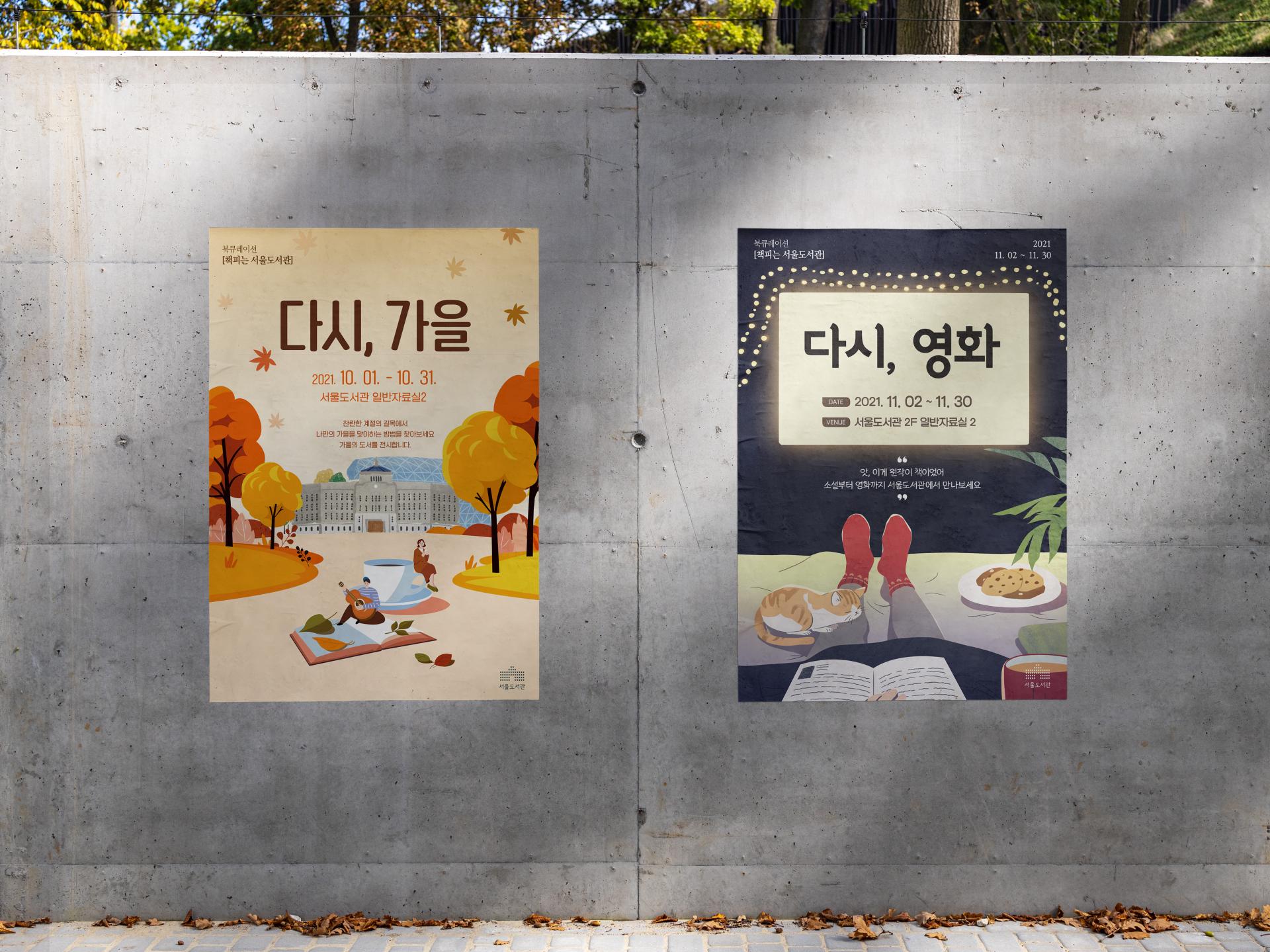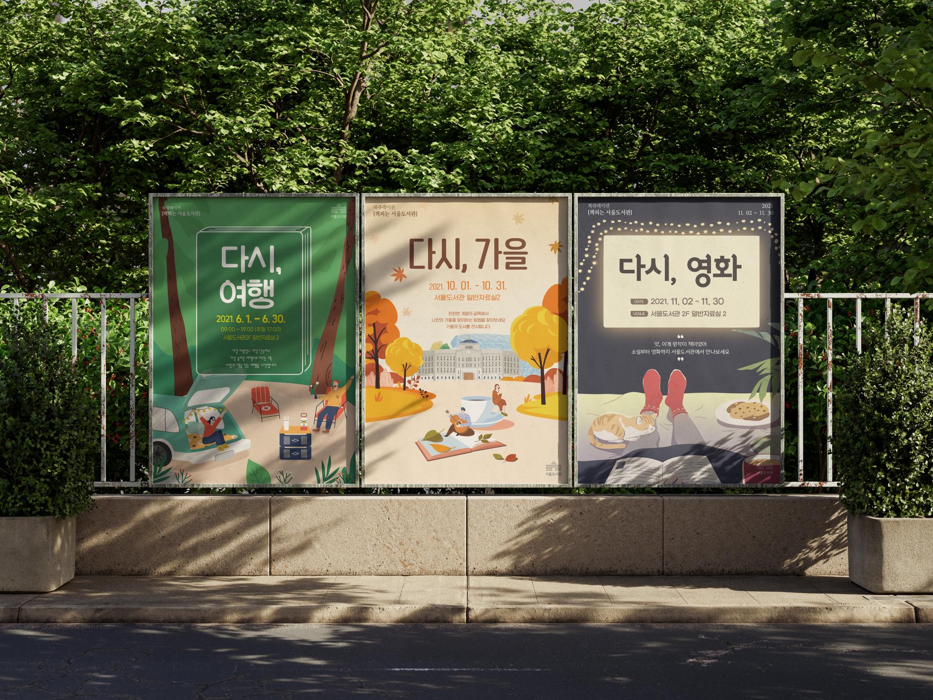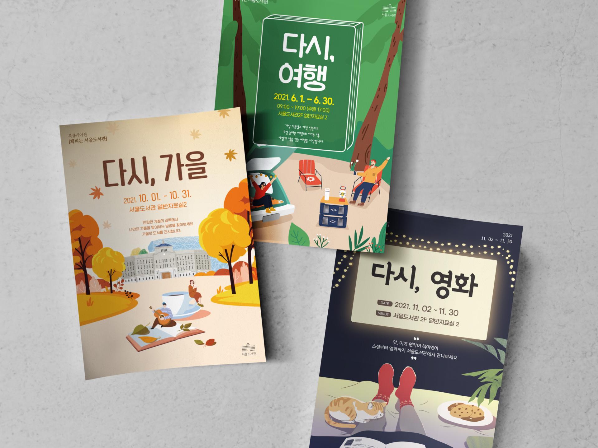 매월 진행되는 서울도서관의 테마전시 시리즈 중 6, 10, 11월 포스터입니다. 텍스트보다는 다양한 이미지와 산뜻한 색감 위주로 한 눈에 들어오는 디자인을 요청한 클라이언트의 기호를 반영했습니다. 주제와 계절감에 맞는 따뜻한 이미지를 배경에 크게 활용해 답답한 느낌 없이 어느 곳에 게시해도 잘 어울리는 포스터 디자인입니다.