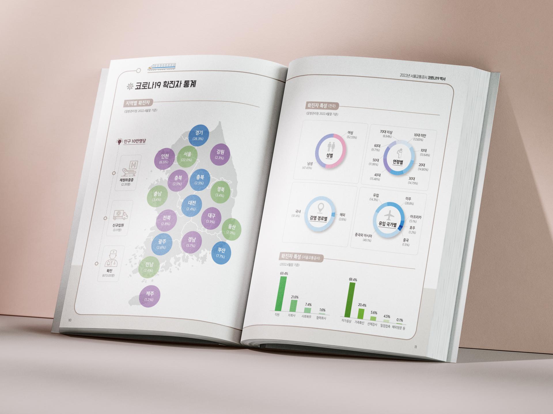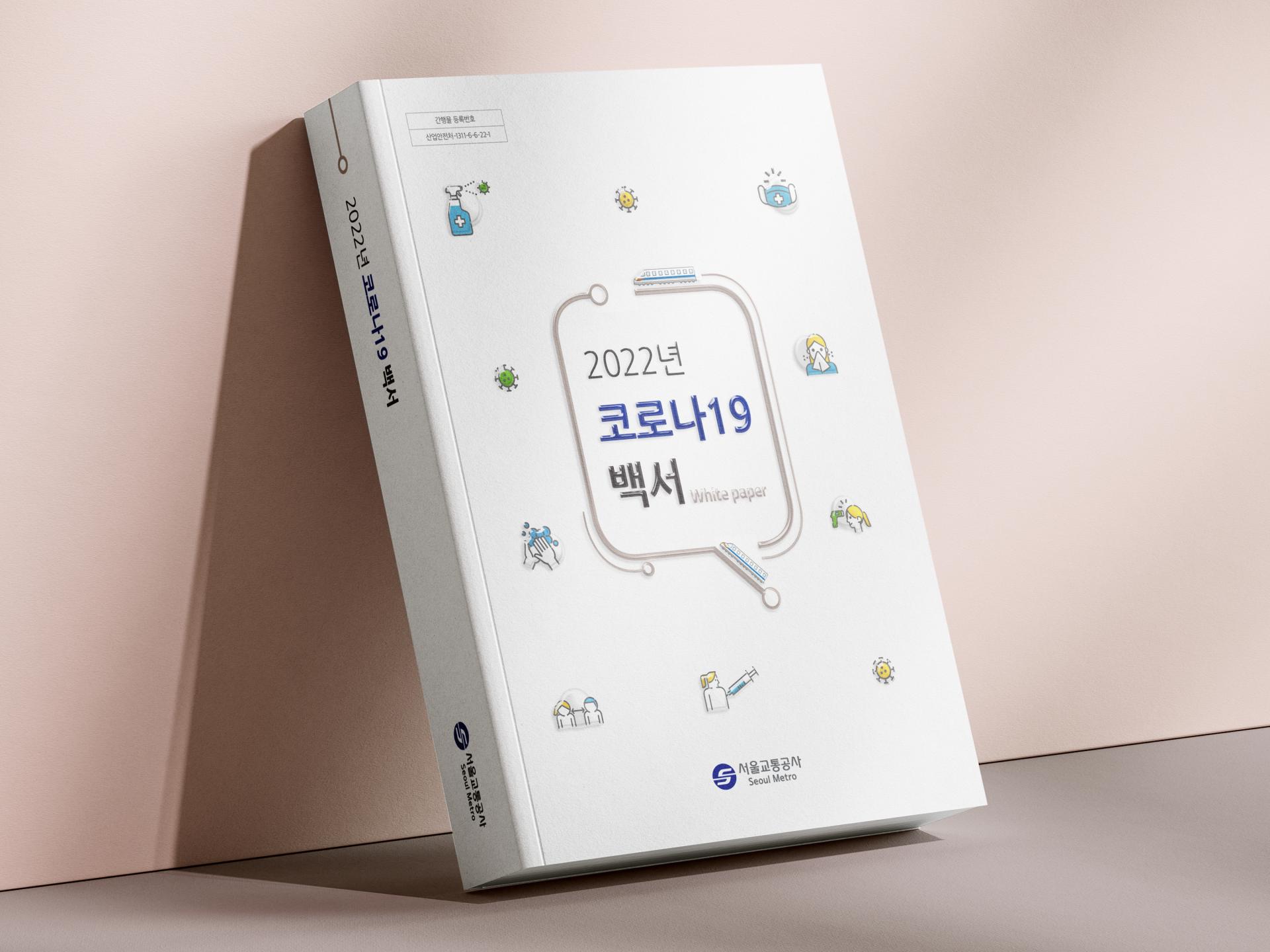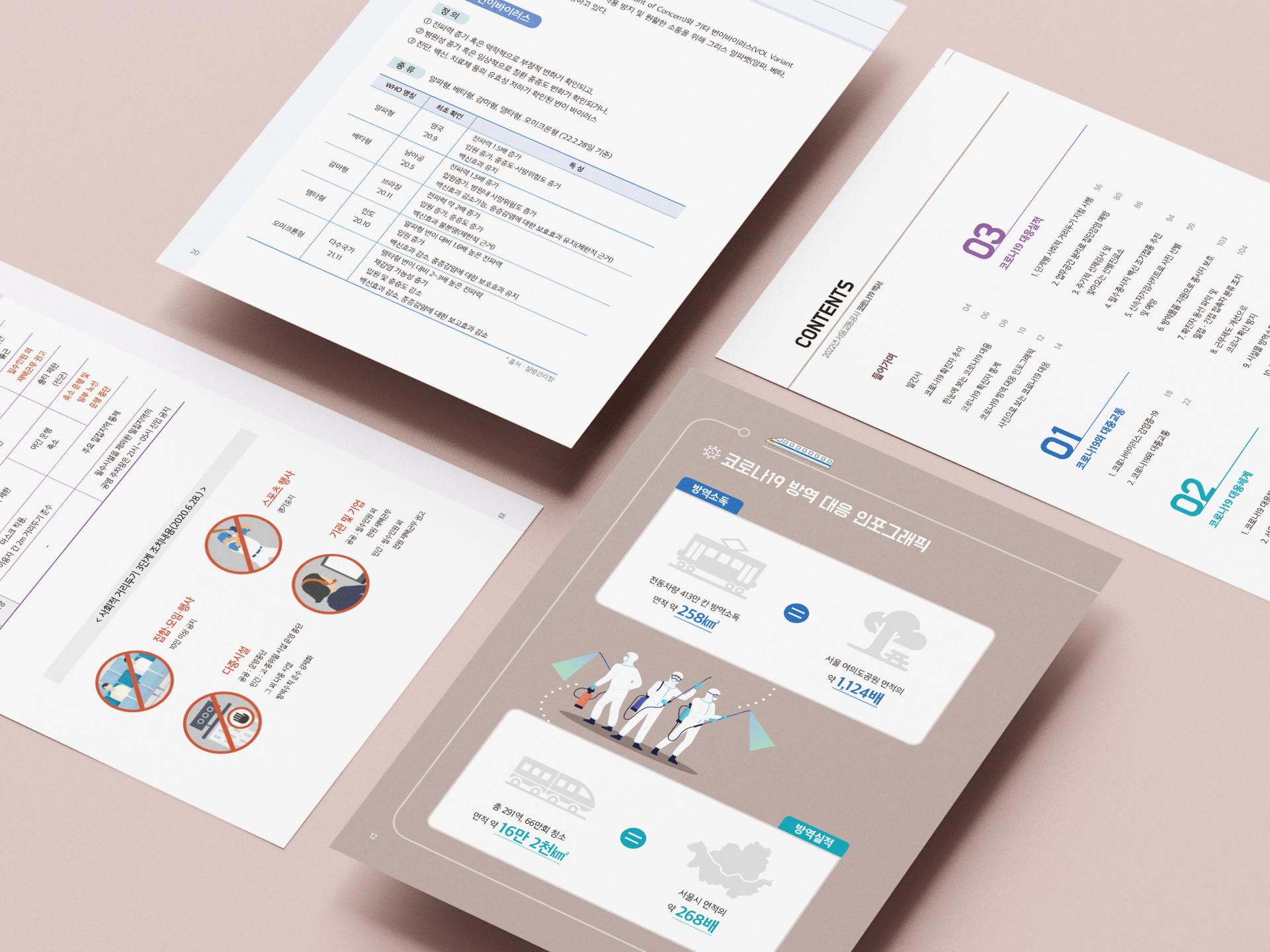 지하철·방역 관련 아이콘의 조합으로 코로나19 백서라는 주제를 표현한 책자 디자인입니다. 전체적으로 지하철 노선과 정거장을 상징하는 라인과 원형 그래픽을 사용하여 메트로라는 아이덴티티를 표현하고 통일감을 주었으며, 다양한 일러스트와 인포그래픽을 활용하여 코로나19 팬데믹 관련 정보를 가독성 좋게 정리했습니다.