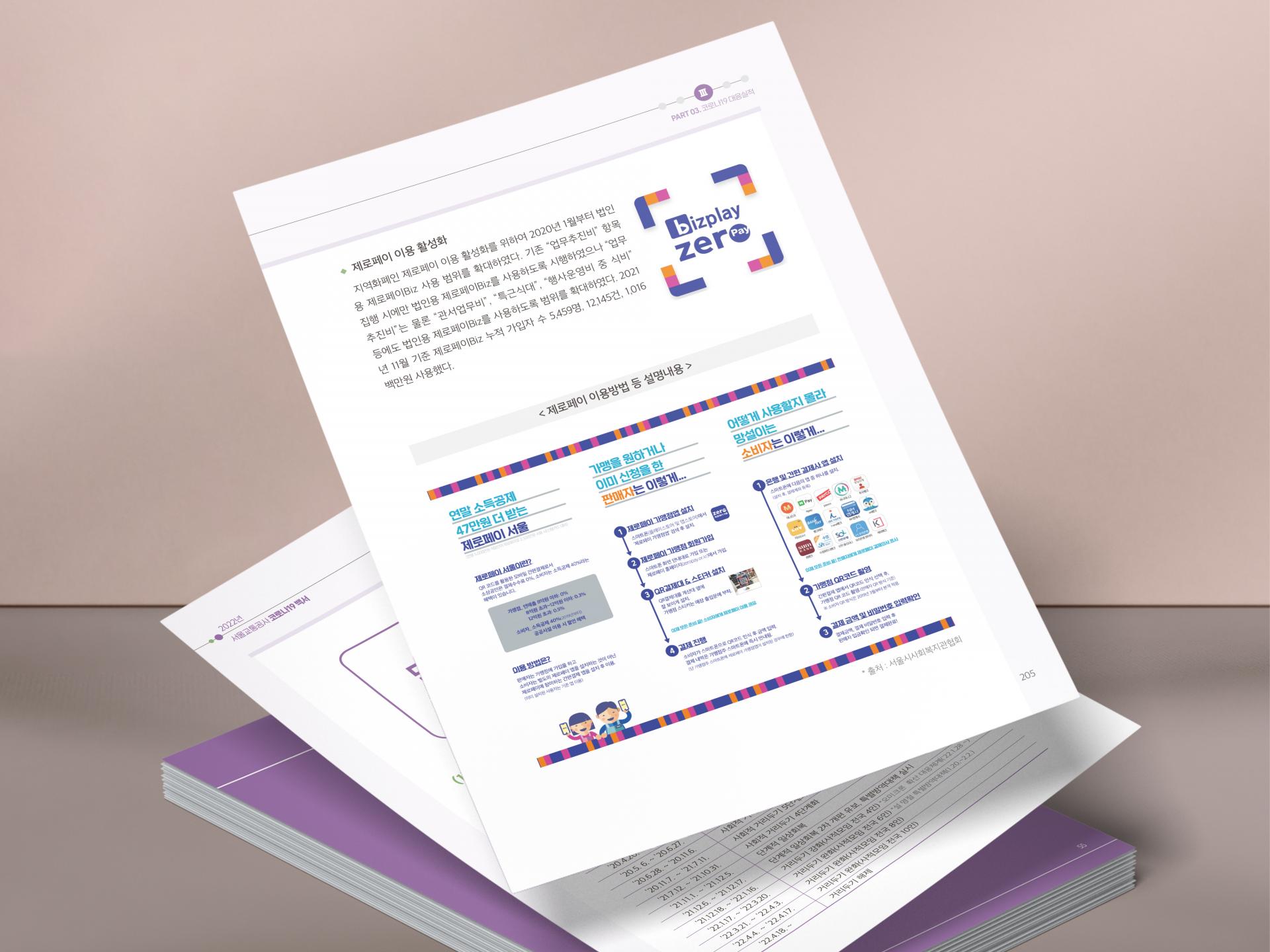 클라이언트 서울교통공사 | 지하철·방역 관련 아이콘의 조합으로 코로나19 백서라는 주제를 표현한 책자 디자인입니다. 전체적으로 지하철 노선과 정거장을 상징하는 라인과 원형 그래픽을 사용하여 메트로라는 아이덴티티를 표현하고 통일감을 주었으며, 다양한 일러스트와 인포그래픽을 활용하여 코로나19 팬데믹 관련 정보를 가독성 좋게 정리했습니다. ![]() ![]() ![]() ![]() |