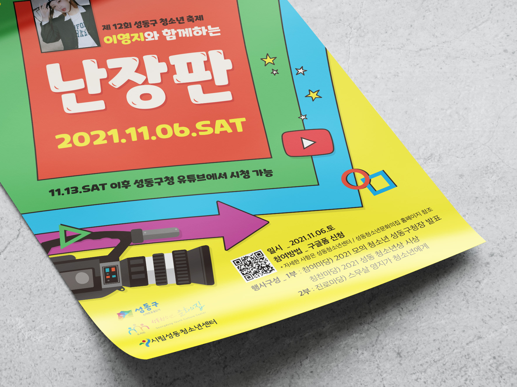 클라이언트 시립성동청소년센터 디자인품목 포스터, 웹포스터 제작연도 2021 | 메인 타겟인 청소년들의 관심도를 높이기 위해 화려하면서도 귀여운 느낌으로 디자인한 공연 홍보 포스터입니다. 사선 배치로 액티브한 느낌을 살린 키비주얼과 타이틀을 큼직하게 삽입하고 채도 높은 색상을 사용해 공연의 경쾌하고 신나는 분위기를 표현했습니다. ![]() ![]() ![]() |