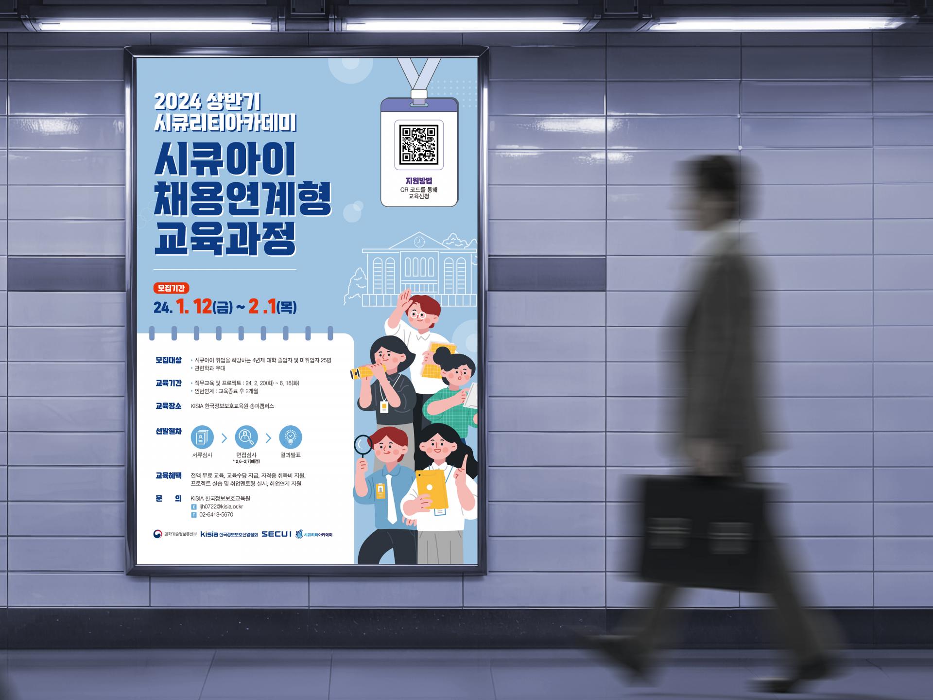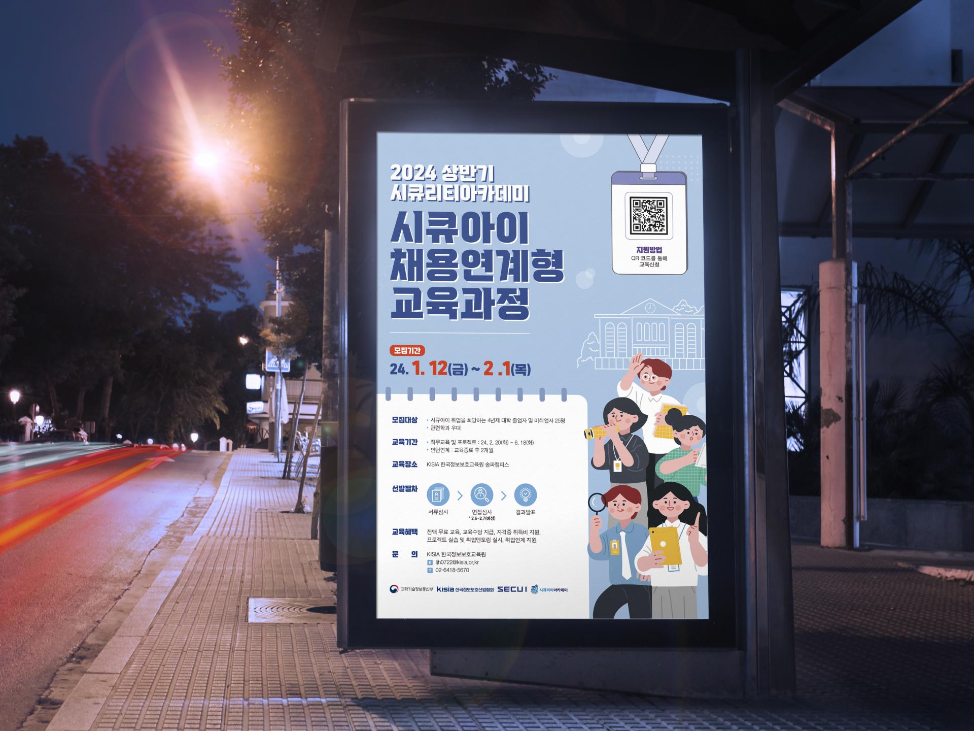 클라이언트 한국정보보호산업협회 | 취업을 희망하는 취준생들을 모집하는 채용연계형 교육과정 홍보 포스터입니다. 청년의 배움, 취업, 교육 주제와 어울리는 대학생 일러스트를 메인으로 활용하고, 정보 내용은 노트 모양으로 분리된 느낌을 주어 가시성을 높였습니다. ![]() ![]() ![]() |