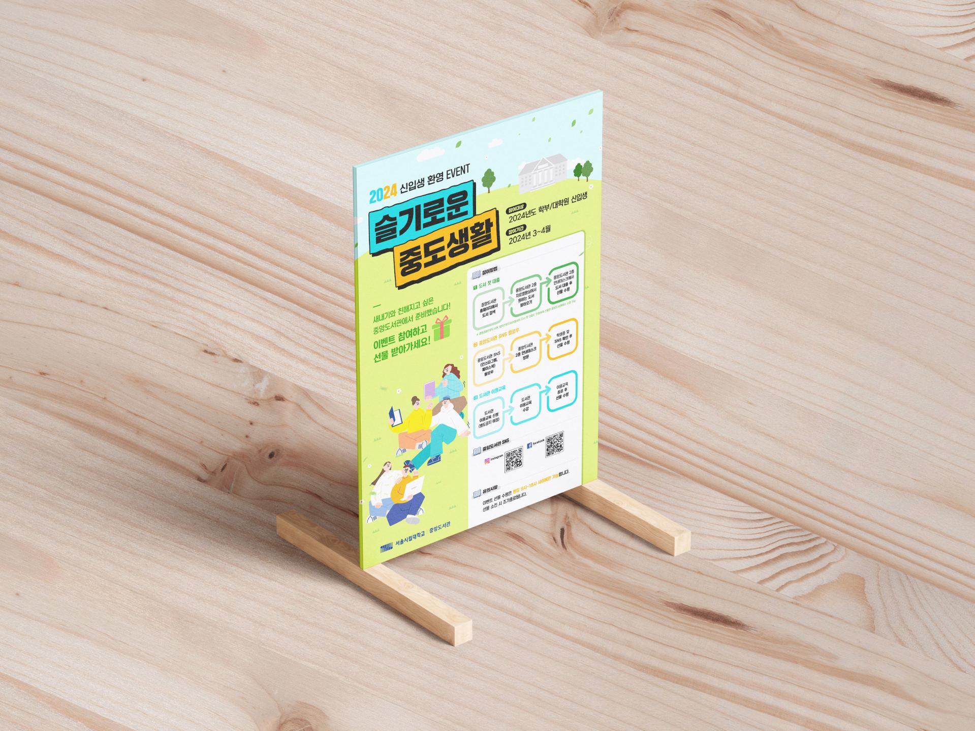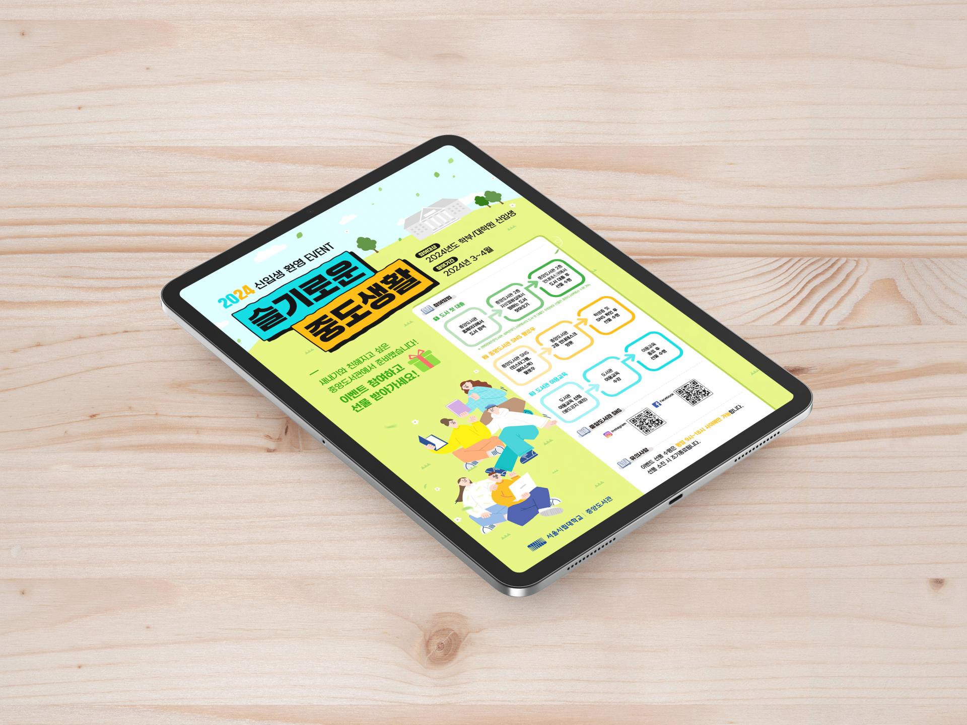 클라이언트 서울시립대학교 | 참여를 독려하는 포스터의 취지에 맞게 타이틀을 강조해 주목도를 높이고 캠퍼스 라이프 일러스트로 포스터의 산뜻한 느낌을 더했습니다. 인포그래픽을 적절히 활용한 정보란은 내용 확인에 용이해 더 많은 참여를 기대할 수 있는 요소입니다. ![]() ![]()