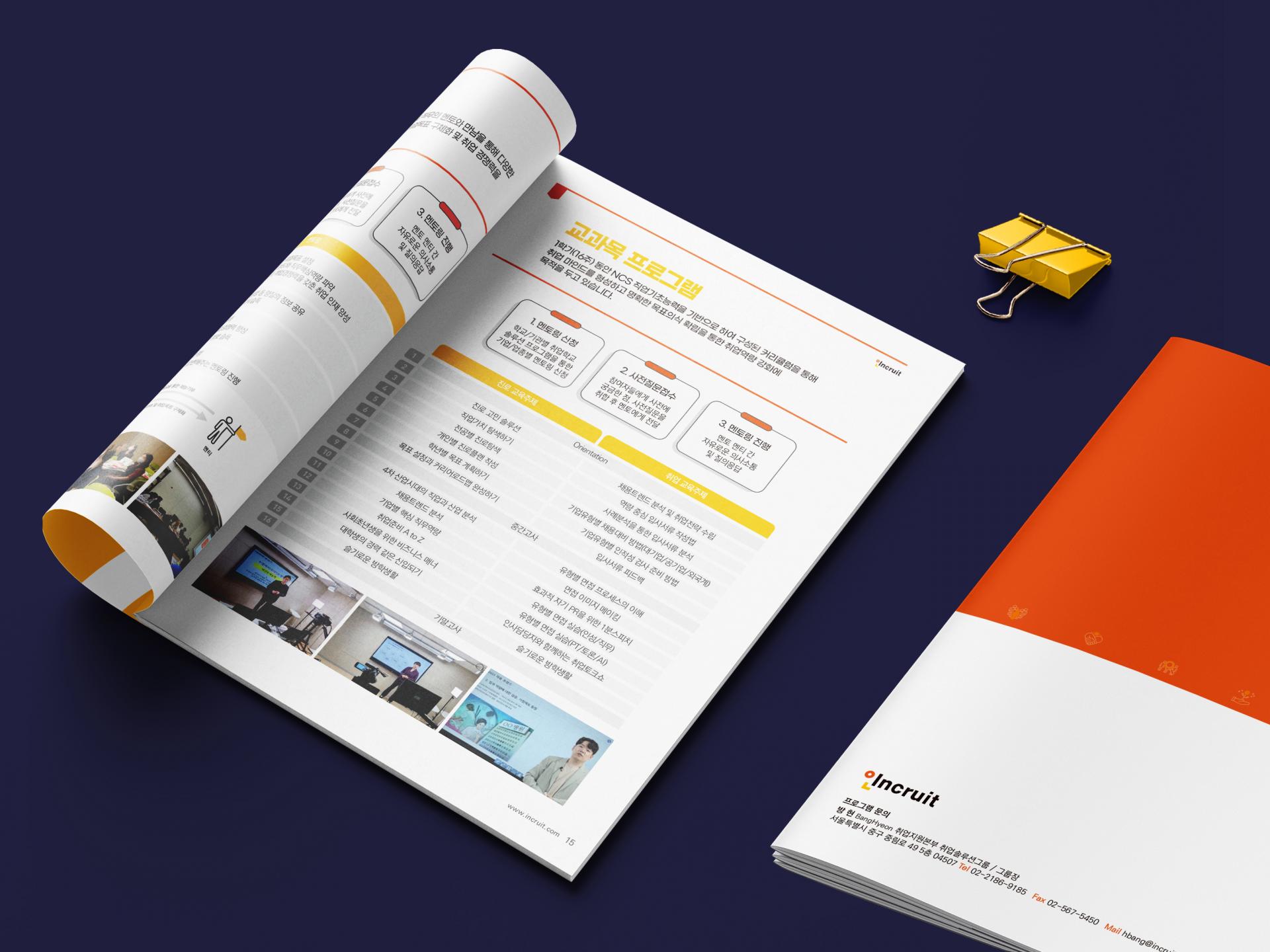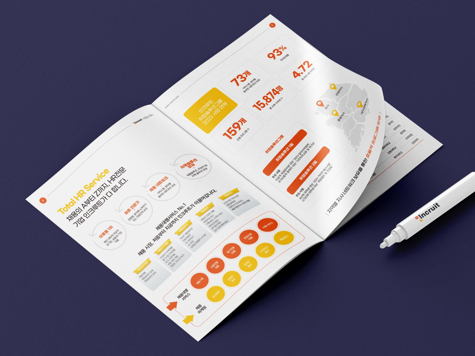 인크루트 취업솔루션그룹 사업을 기하학 도형과 아이콘을 활용하여 감각적으로 표현한 브로셔입니다. CI의 메인 컬러인 오렌지, 옐로우 조합으로 브랜드 아이덴티티를 강조했고, 내지는 다양한 레이아웃과 인포그래픽, 일러스트 요소를 사용하여 다채로운 느낌으로 디자인했습니다.