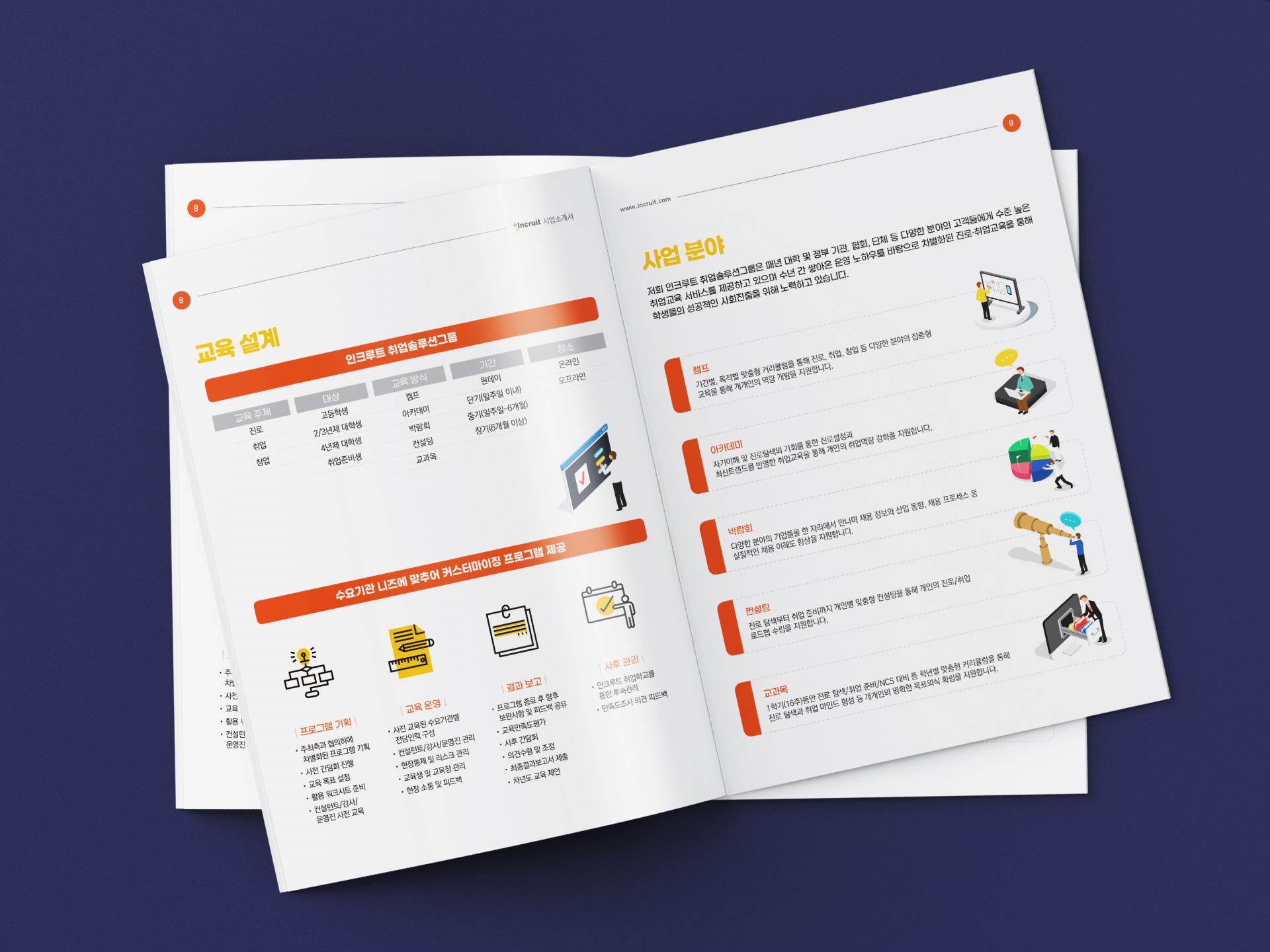 클라이언트 인크루트(주) | 인크루트 취업솔루션그룹 사업을 기하학 도형과 아이콘을 활용하여 감각적으로 표현한 브로셔입니다. CI의 메인 컬러인 오렌지, 옐로우 조합으로 브랜드 아이덴티티를 강조했고, 내지는 다양한 레이아웃과 인포그래픽, 일러스트 요소를 사용하여 다채로운 느낌으로 디자인했습니다. ![]() ![]() ![]() ![]() |