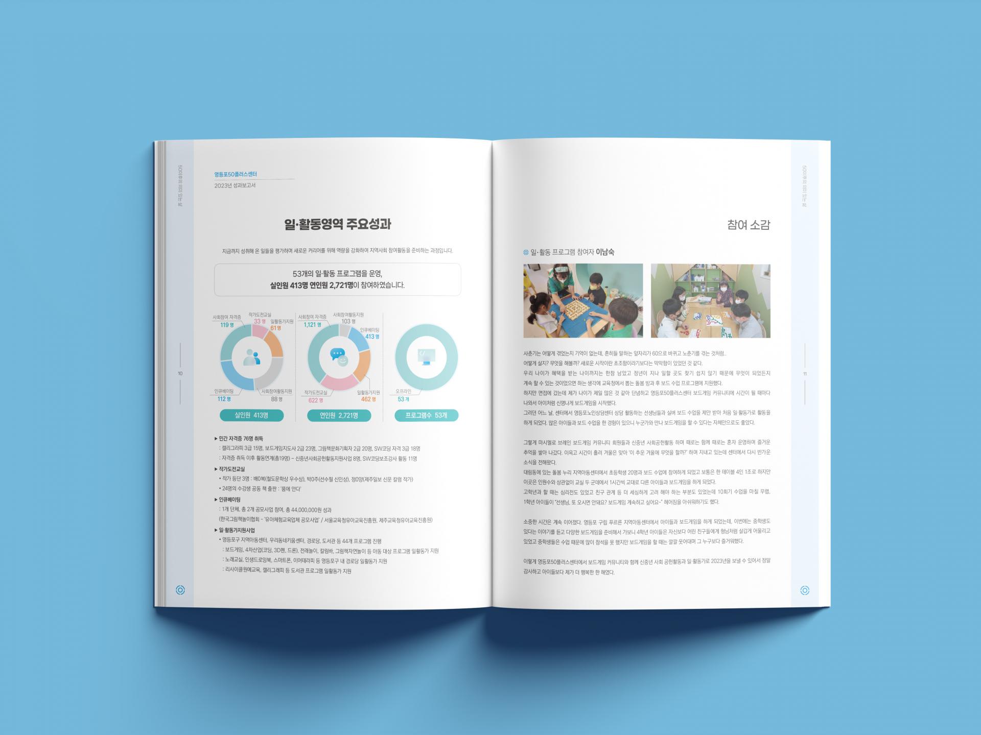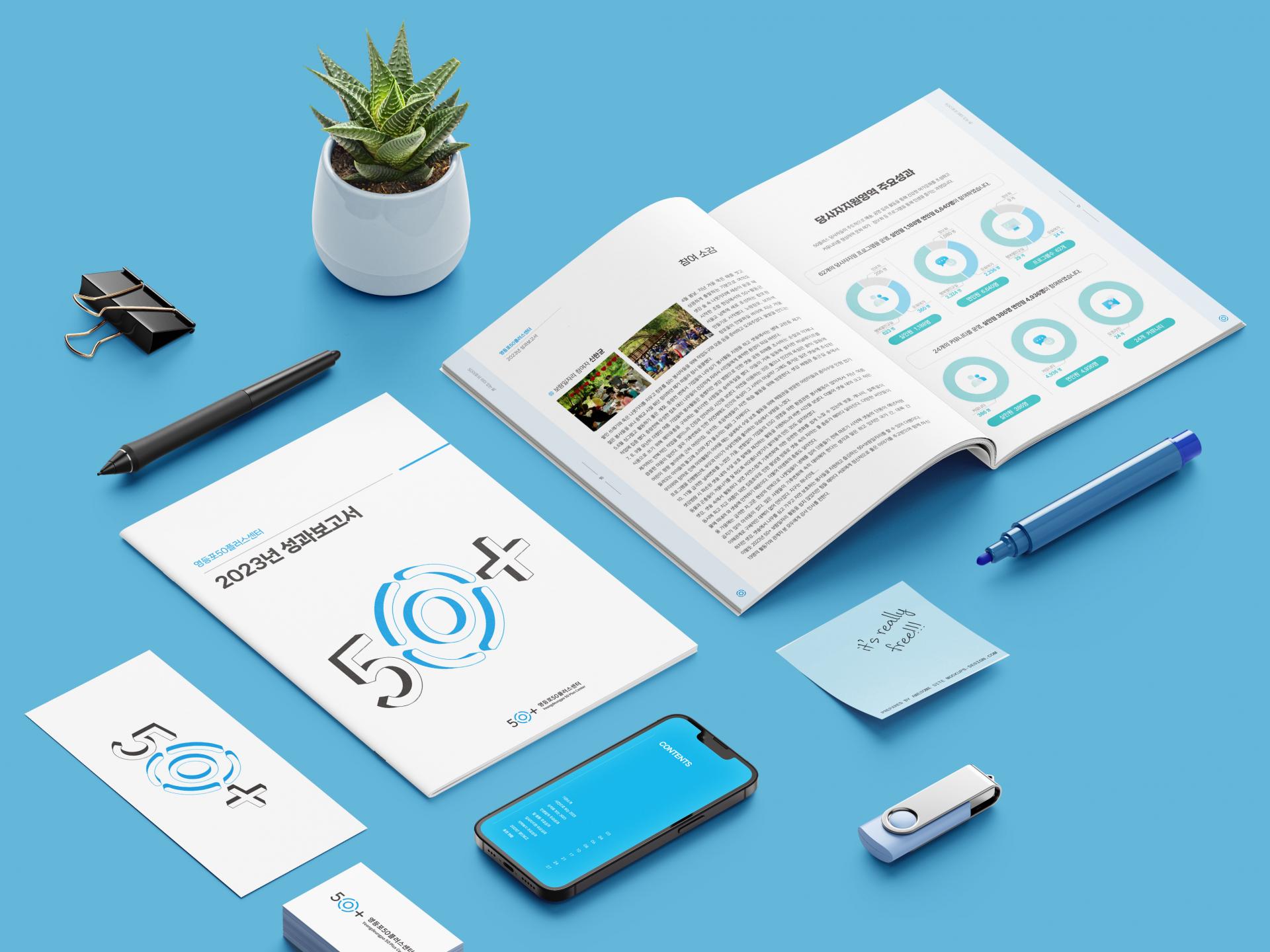 클라이언트 영등포50플러스센터 | BI와 고유 컬러를 활용한 심플한 표지와 다양한 레이아웃을 적용한 내지의 조합이 돋보이는 보고서 디자인입니다. 파스텔 컬러의 적절한 사용으로 통계자료 등 수치화된 컨텐츠가 주는 경직된 분위기를 이완시켰습니다. ![]() ![]() ![]() ![]() |