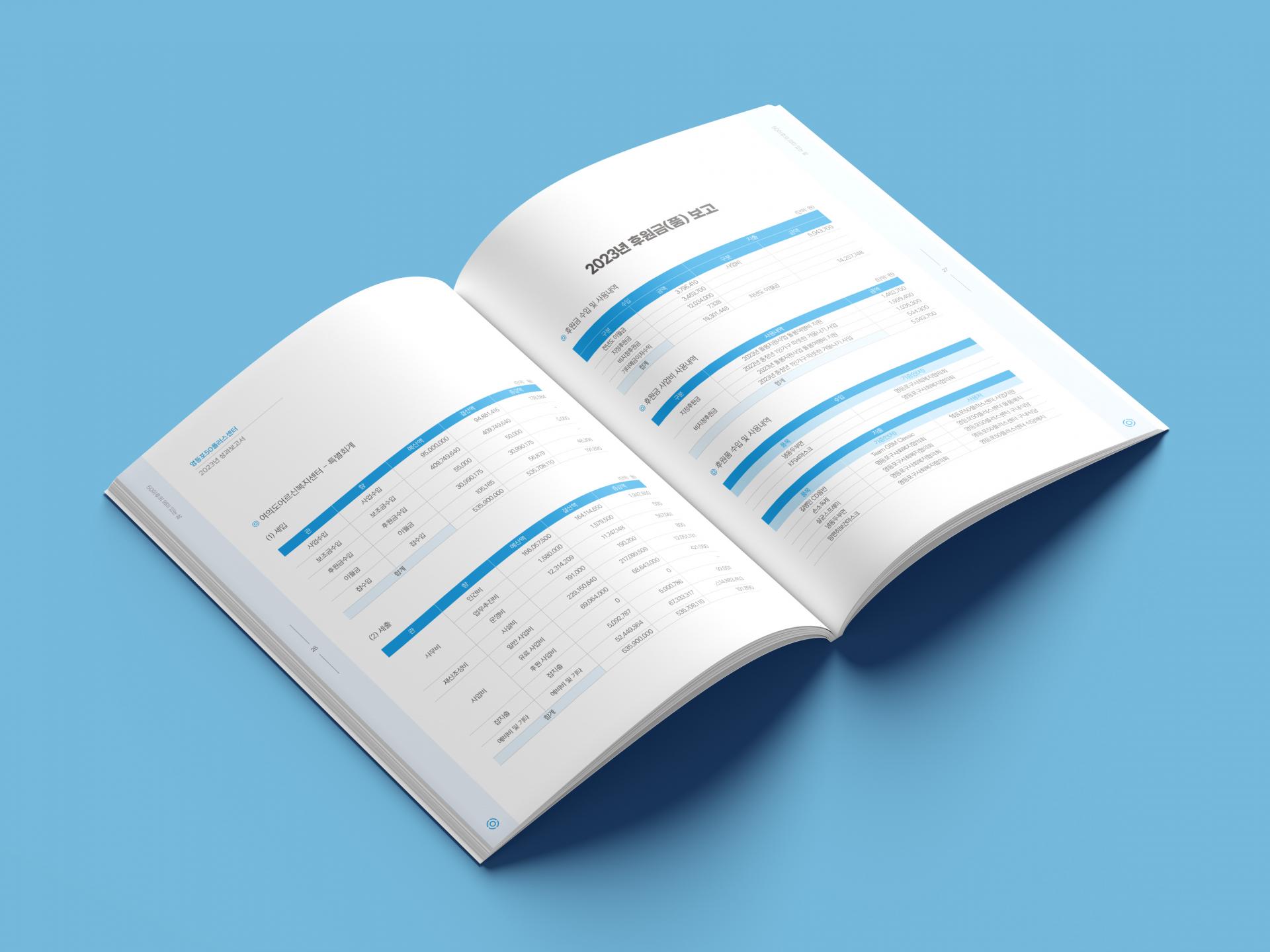 BI와 고유 컬러를 활용한 심플한 표지와 다양한 레이아웃을 적용한 내지의 조합이 돋보이는 보고서 디자인입니다. 파스텔 컬러의 적절한 사용으로 통계자료 등 수치화된 컨텐츠가 주는 경직된 분위기를 이완시켰습니다.