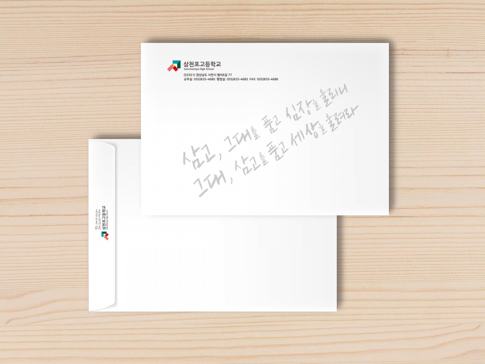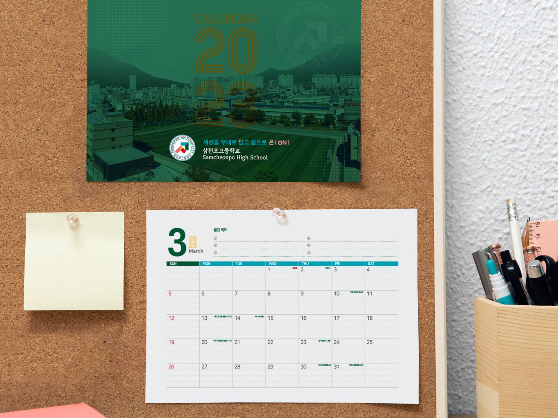 클라이언트 삼천포고등학교 디자인품목 탁상캘린더, 봉투 제작연도 2022 | 학교 심볼 마크의 고유 컬러를 사용하여 삼천포고등학교의 정체성을 표현한 탁상용 캘린더입니다. 뒷면에는 졸업생 인터뷰, 동아리 활동, 교육 과정 등의 각종 학교 안내 정보를 담은 홍보용 캘린더 디자인입니다.