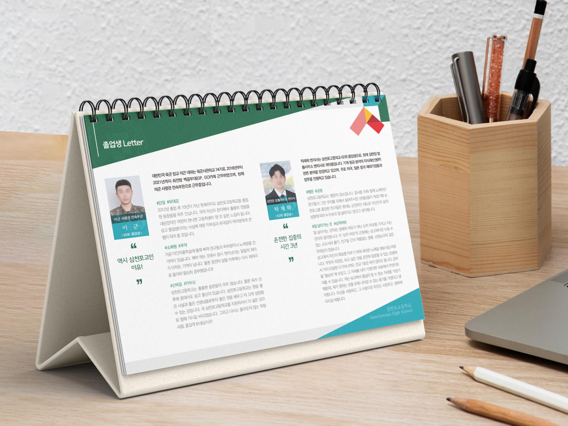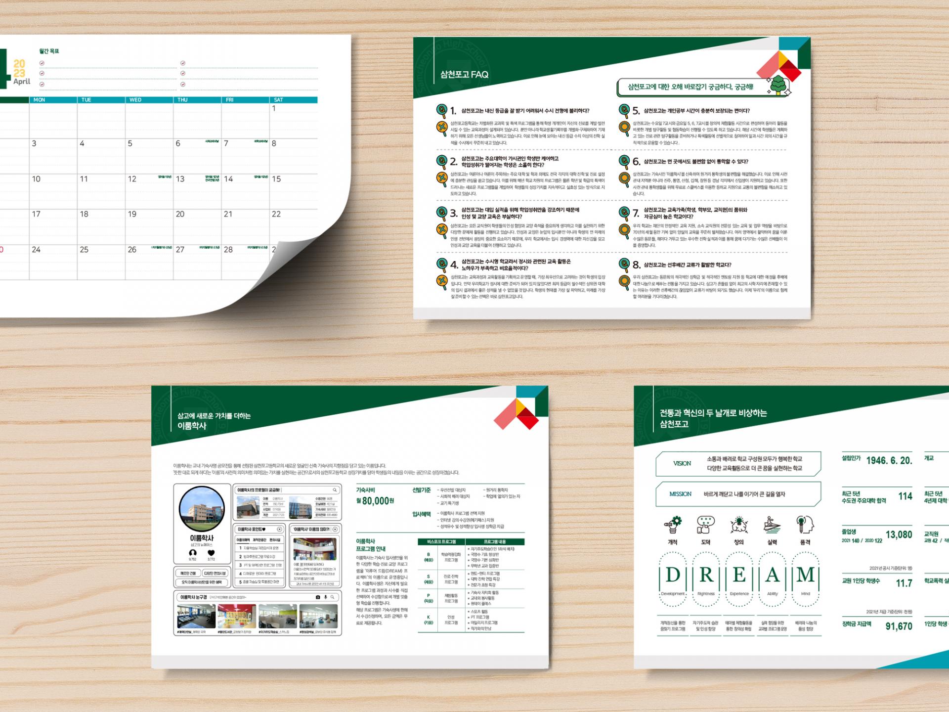 학교 심볼 마크의 고유 컬러를 사용하여 삼천포고등학교의 정체성을 표현한 탁상용 캘린더입니다. 뒷면에는 졸업생 인터뷰, 동아리 활동, 교육 과정 등의 각종 학교 안내 정보를 담아 마치 브로셔를 접목한 홍보용 캘린더 디자인입니다.