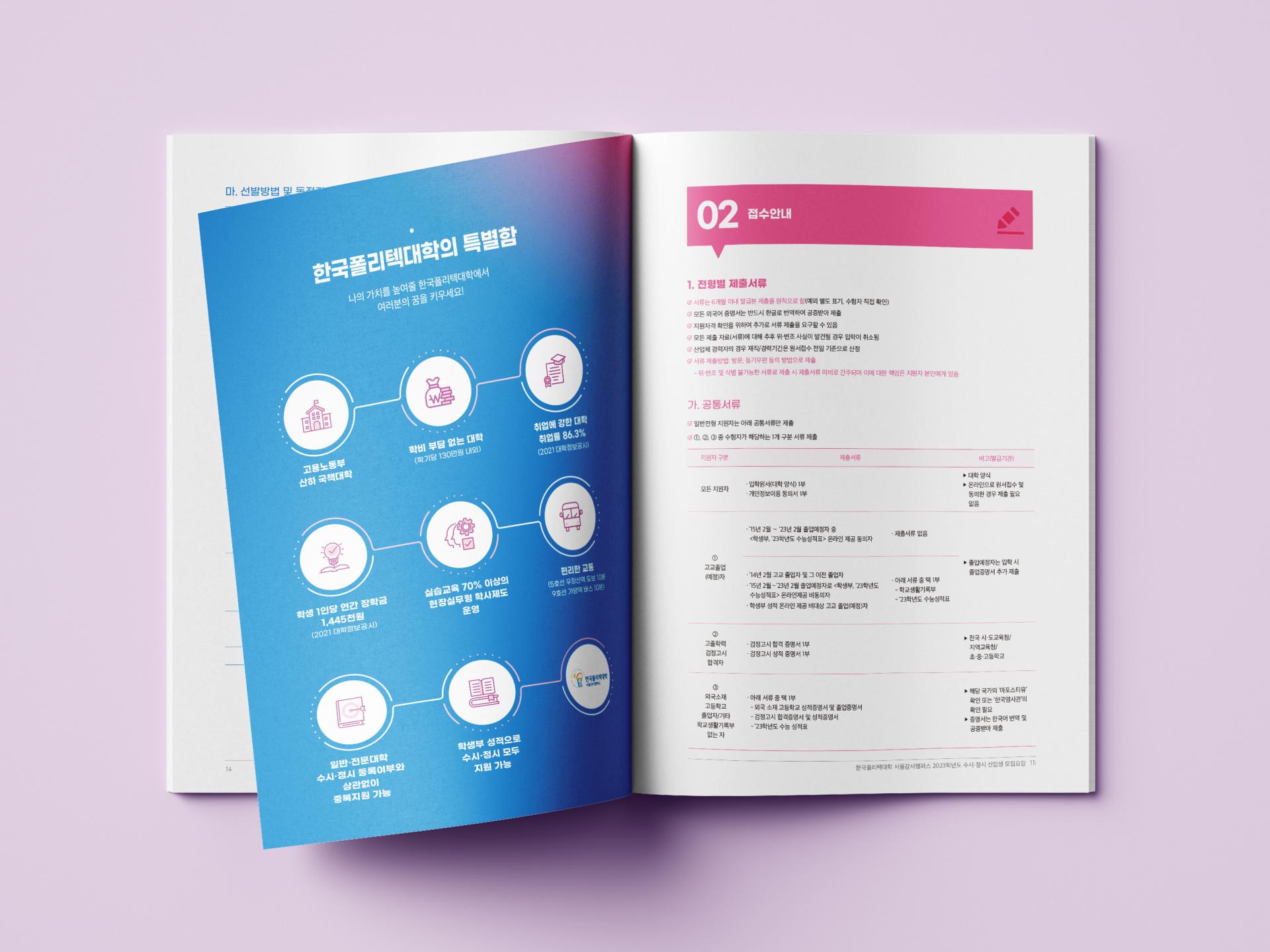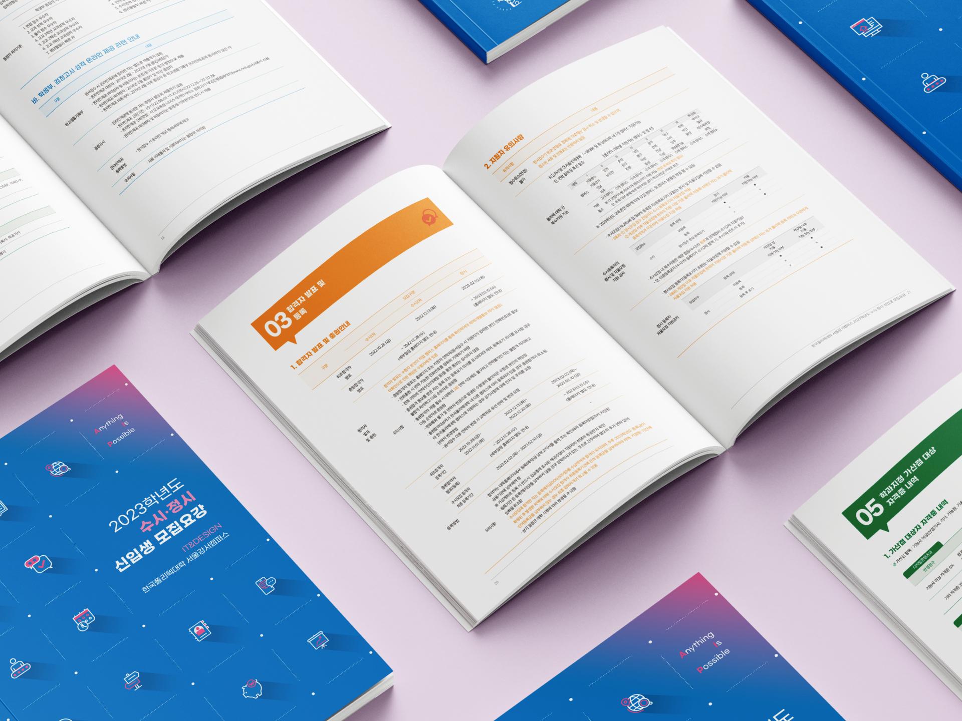 클라이언트 한국폴리텍대학 강서캠퍼스 | 교육 아이콘으로 모집 요강을 표현하고 그라데이션으로 은은하게 포인트를 준 책자 디자인입니다. 투톤 그라데이션으로 카테고리를 구분하고, 아이콘과 표를 활용한 깔끔하고 정돈된 내지 디자인으로 가독성을 높였습니다. ![]() ![]() ![]() ![]() |