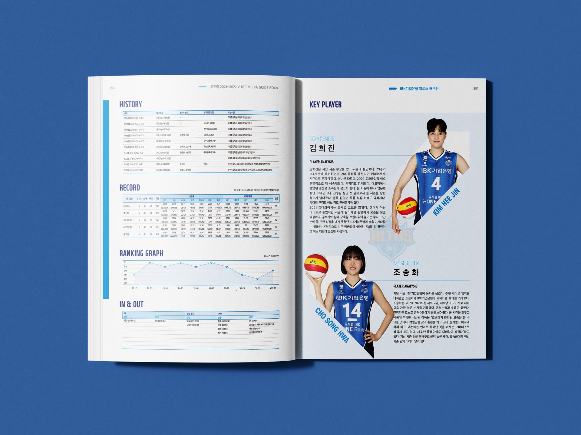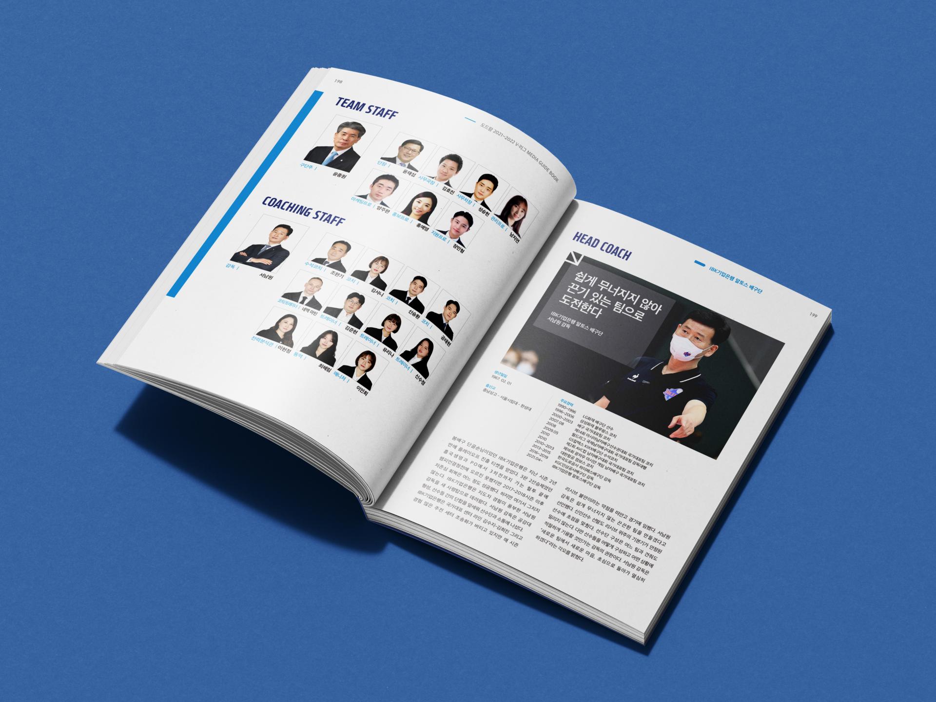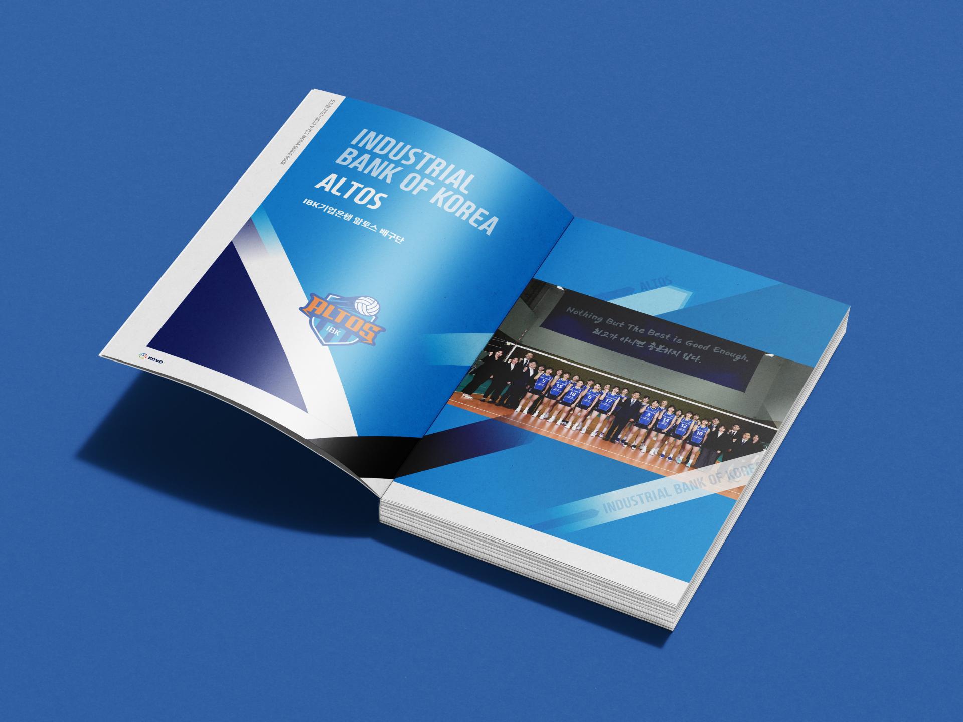 기존 실사 위주의 표지 디자인에서 차별성을 부여하기 위해 삽화와 배경 컬러, 제목 타이포를 조합해 입체적인 형태의 메인 그래픽을 디자인헀습니다. 내지는 사선 오브젝트를 주된 요소로 활용해 공이 튀는 모습과 선수들의 역동성을 표현했습니다. 또한 많은 텍스트와 표를 통일성 있게 정리해 가이드북에 적절한 가독성을 갖추었습니다.