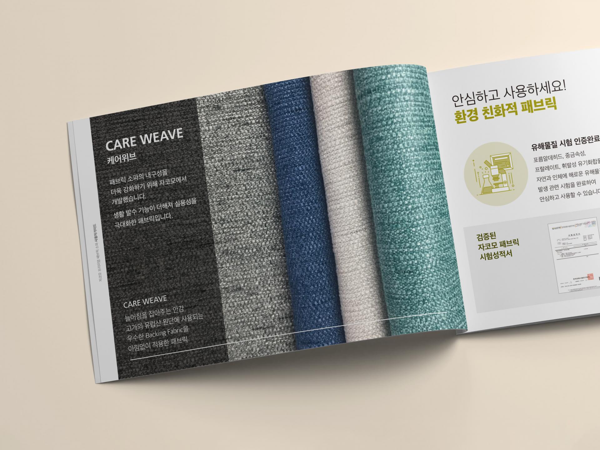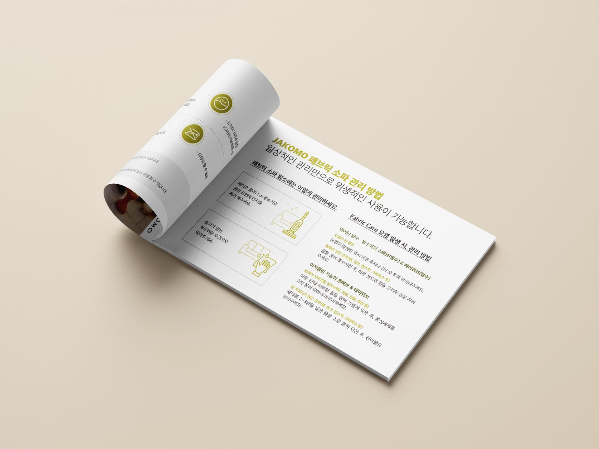 자코모 브랜드 포인트 컬러인 그린을 활용하여 고급스러운 감성을 담은 기능성 패브릭 소재 설명 가이드북입니다. 확대 컷 위주의 사진을 전면에 크게 배치하여 패브릭 원단의 재질감을 강조하였으며, 단색의 일러스트 라인 아이콘을 이용하여 핵심 정보를 가시적으로 전달하였습니다.