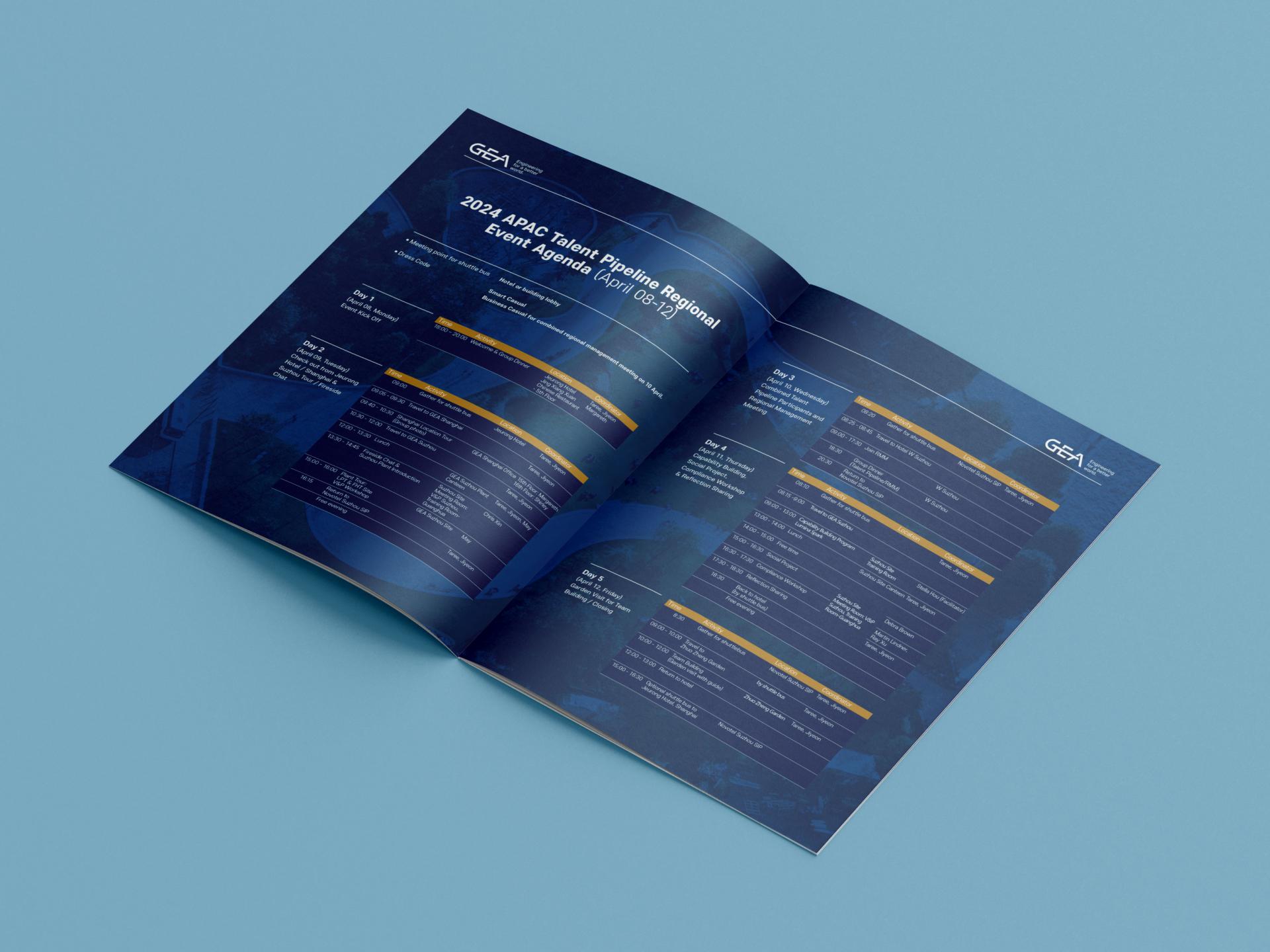 클라이언트 GEA코리아 | 협동을 연상시키는 사진 이미지를 표지에 크게 삽입해 다국적 행사의 정체성을 표현한 영문 책자입니다. 내지는 전체 대지에 어두운 네이비톤을 적용해 무게감을 더했으며, 밝은 색 텍스트와 배경색의 중심을 잡아주는 차분한 브라운 컬러 포인트를 베이스로 볼륨이 큰 컨텐츠에 적합한 다양한 레이아웃을 구성했습니다. ![]() ![]() ![]() ![]()
