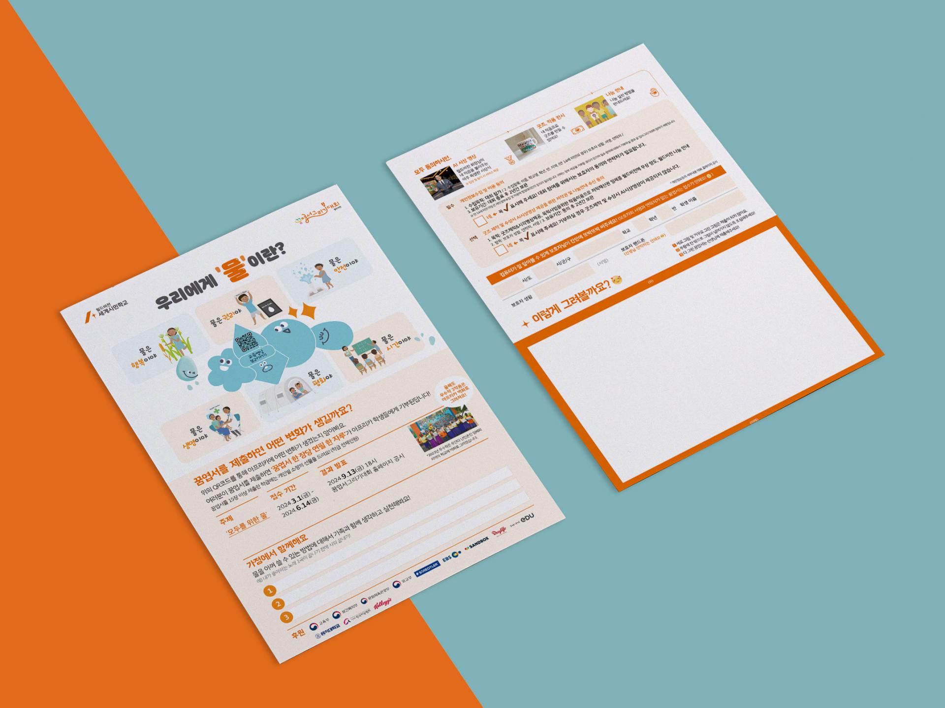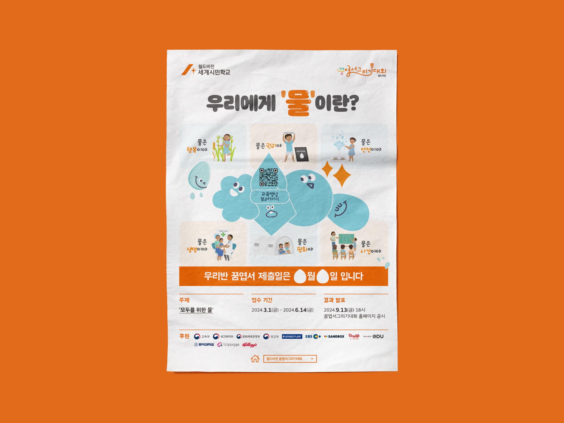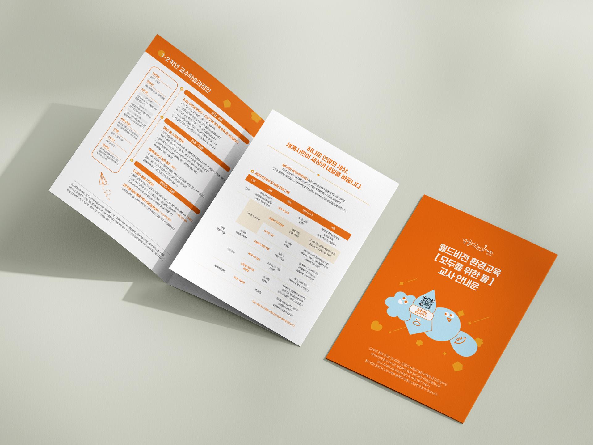 '물의 의미'가 주제인 그림 엽서 공모 홍보에 주 목적을 둔 제작물 세트입니다. 키비주얼을 다양한 표정과 형태를 가진 물방울로 표현해 월드비전의 메인 주황 컬러와 대비를 주고, 각종 서브 그래픽과 호흡이 긴 내용들을 안정적인 레이아웃으로 정리했습니다. 제작물을 담는 배송용 카톤박스에도 각종 정보를 이미지화해 삽입, 프로젝트의 접근성을 높이고 배송 시에도 주의할 수 있도록 디자인했습니다. 제작 후 전국 초등학교에 배포되어 교사들에게 프로젝트의 의미를 알리고 아이들의 참여를 독려했습니다.