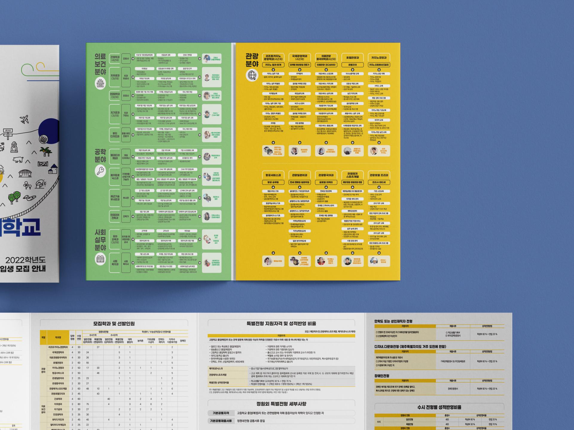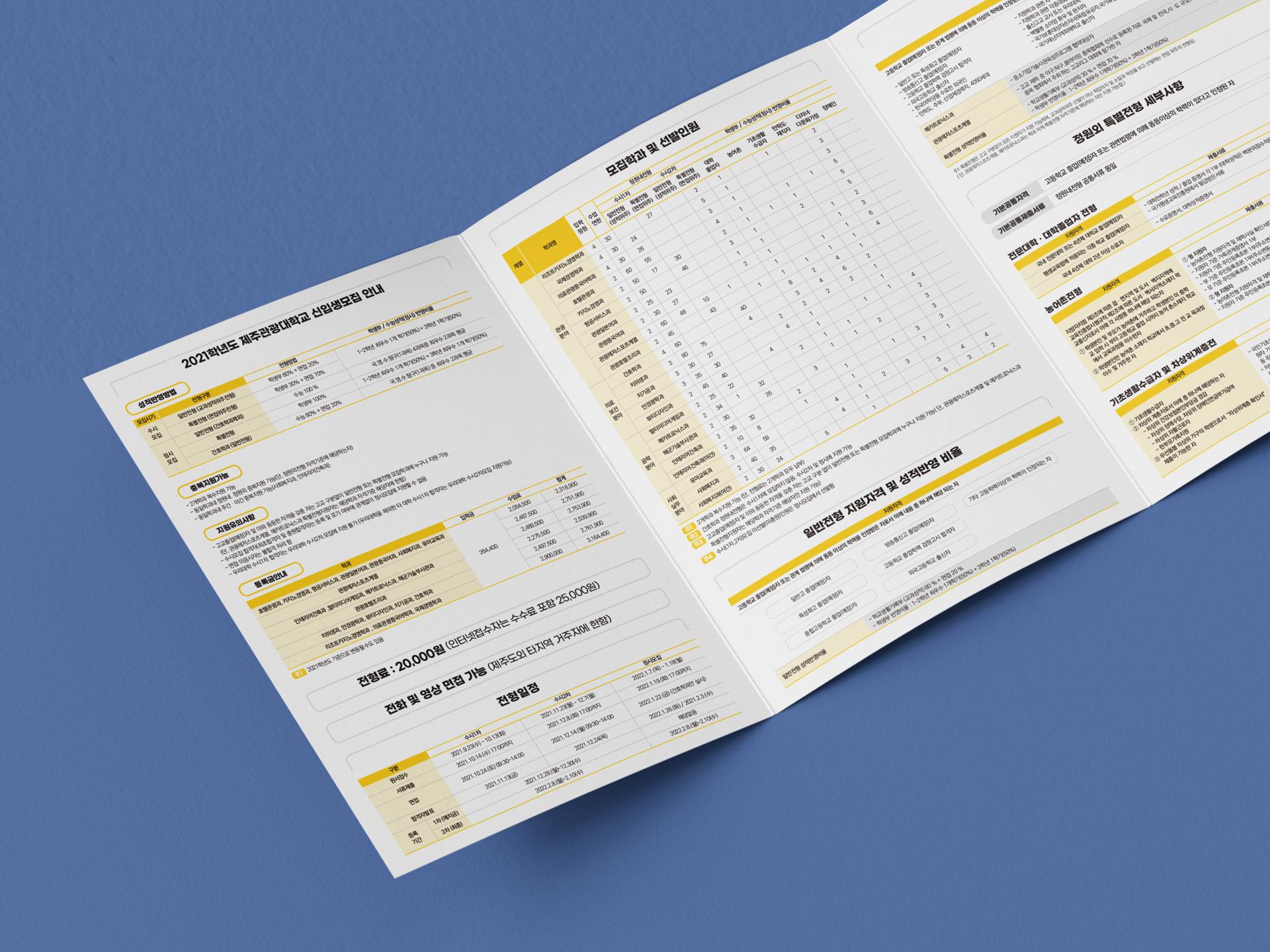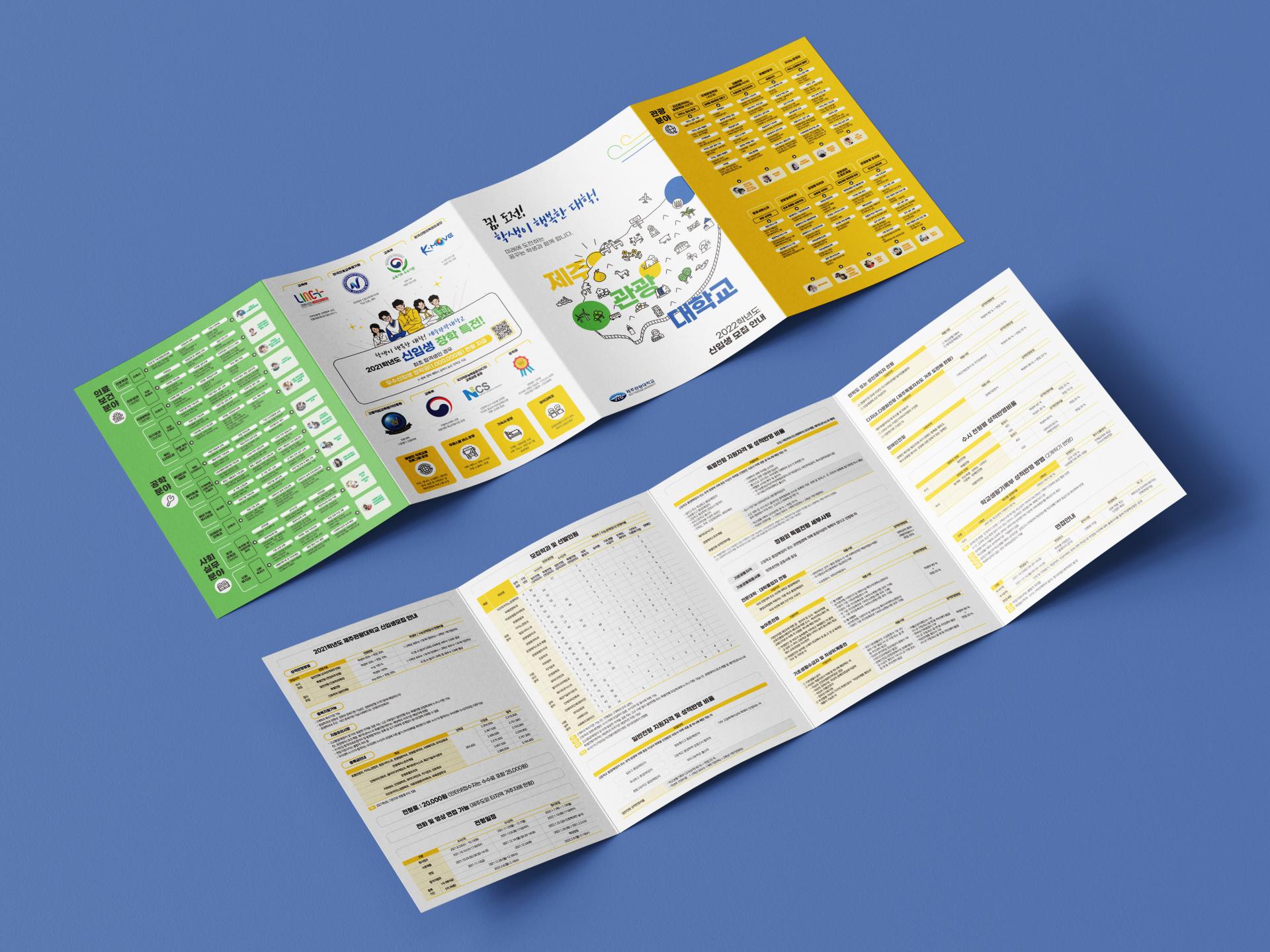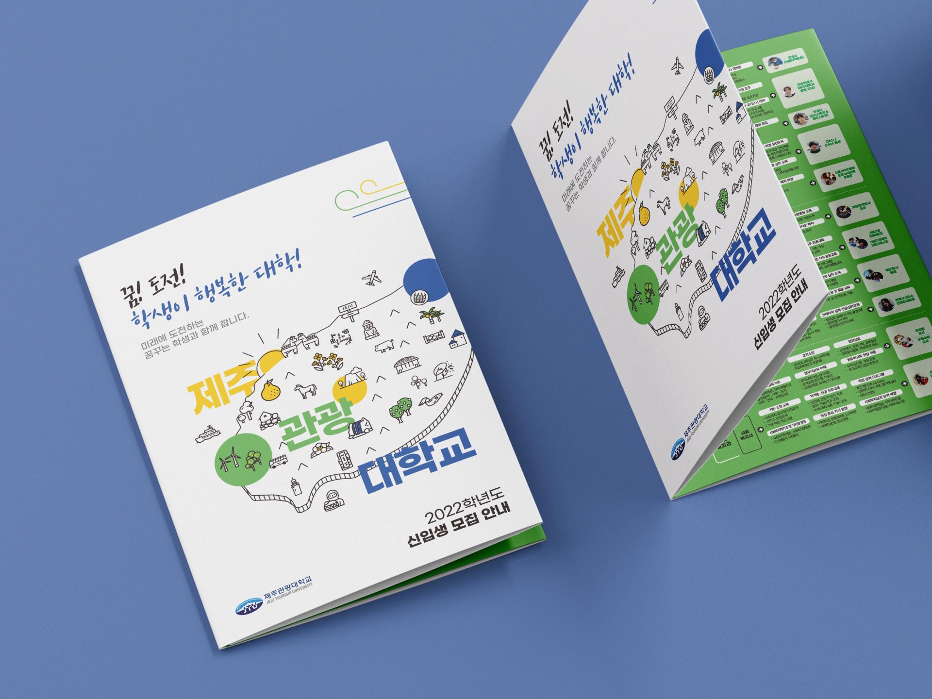 '제주'와 관련된 아기자기한 일러스트로 지역적 특성을 담아낸 신입생 모집요강 리플렛입니다. 해,산,바다와 같은 자연이 떠오르는 3색 컬러를 포인트로 대문이 열리는 페이지 부분에 컬러 대비감을 주었으며, 안쪽 내지는 단색 위주로 도표를 활용하여 정보 전달에 중점을 두었습니다.