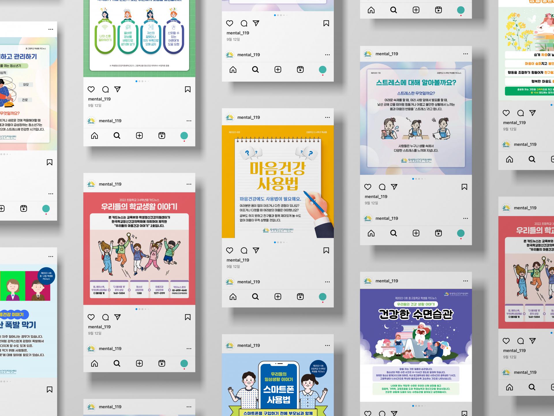 클라이언트 학생정신건강지원센터 | 발행 대상인 초중고 학생들의 눈높이에 맞춰 제작한 정방형 SNS 카드뉴스 디자인입니다. 개별 게시물과 전체 피드 모두 시선을 끌 수 있도록 계절감을 반영한 산뜻한 색감과 귀여운 일러스트를 활용했습니다. ![]() ![]() |