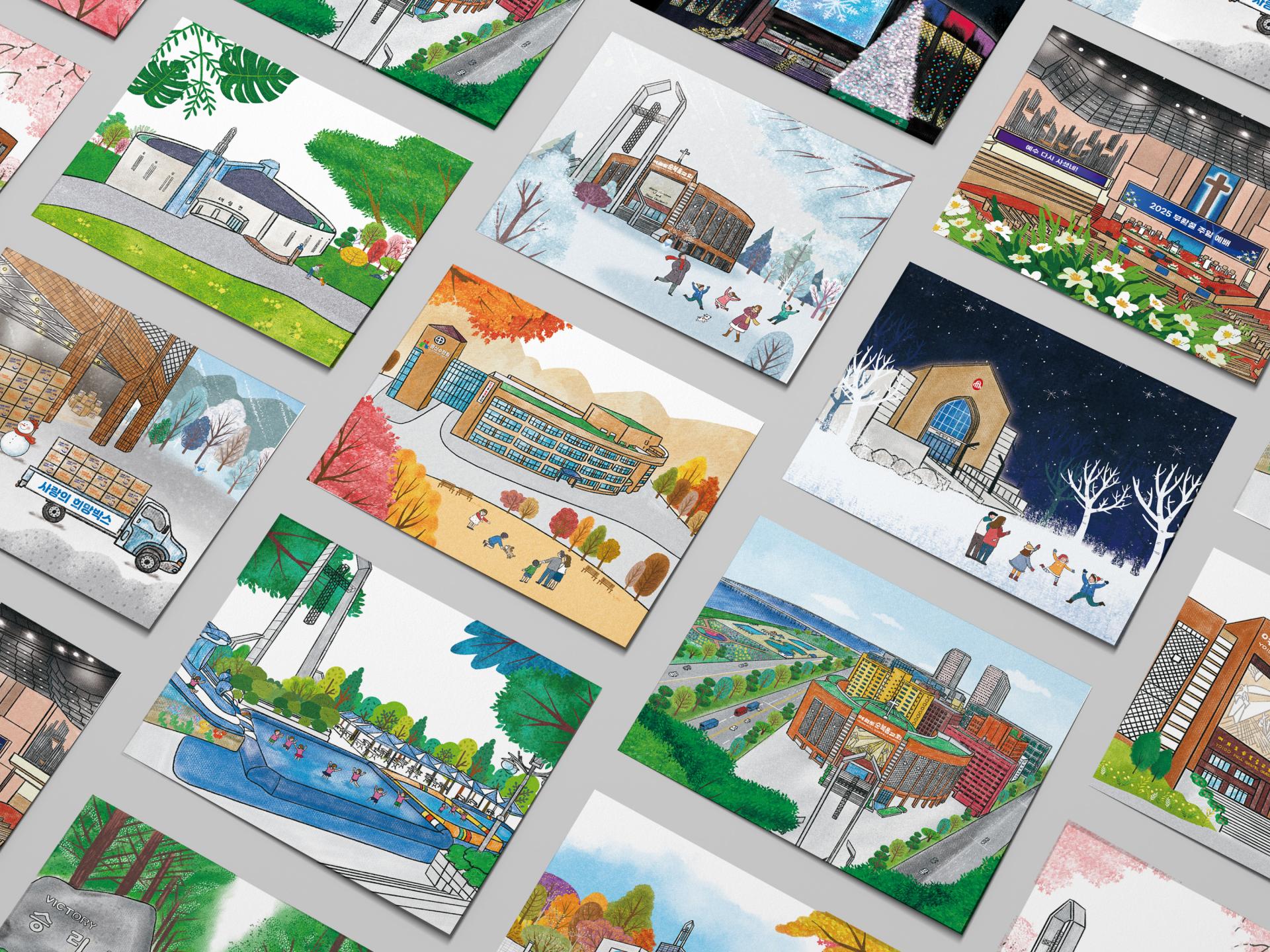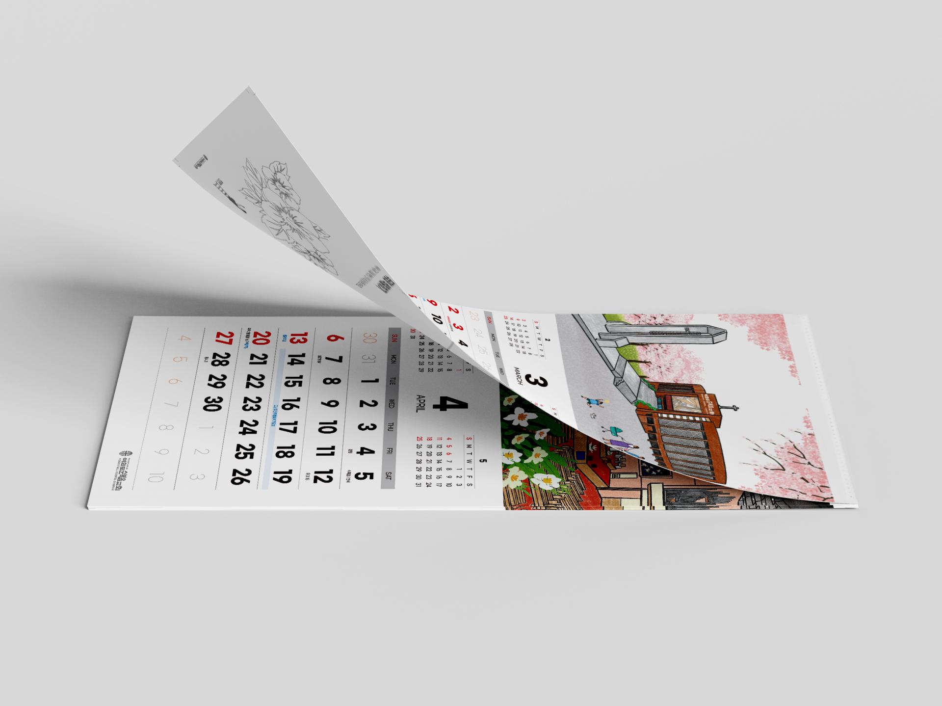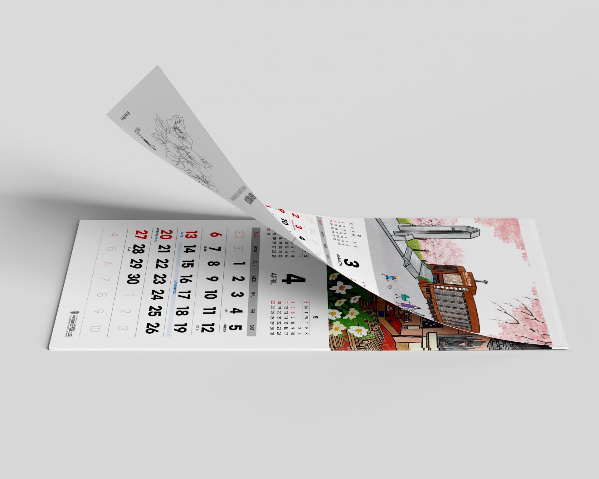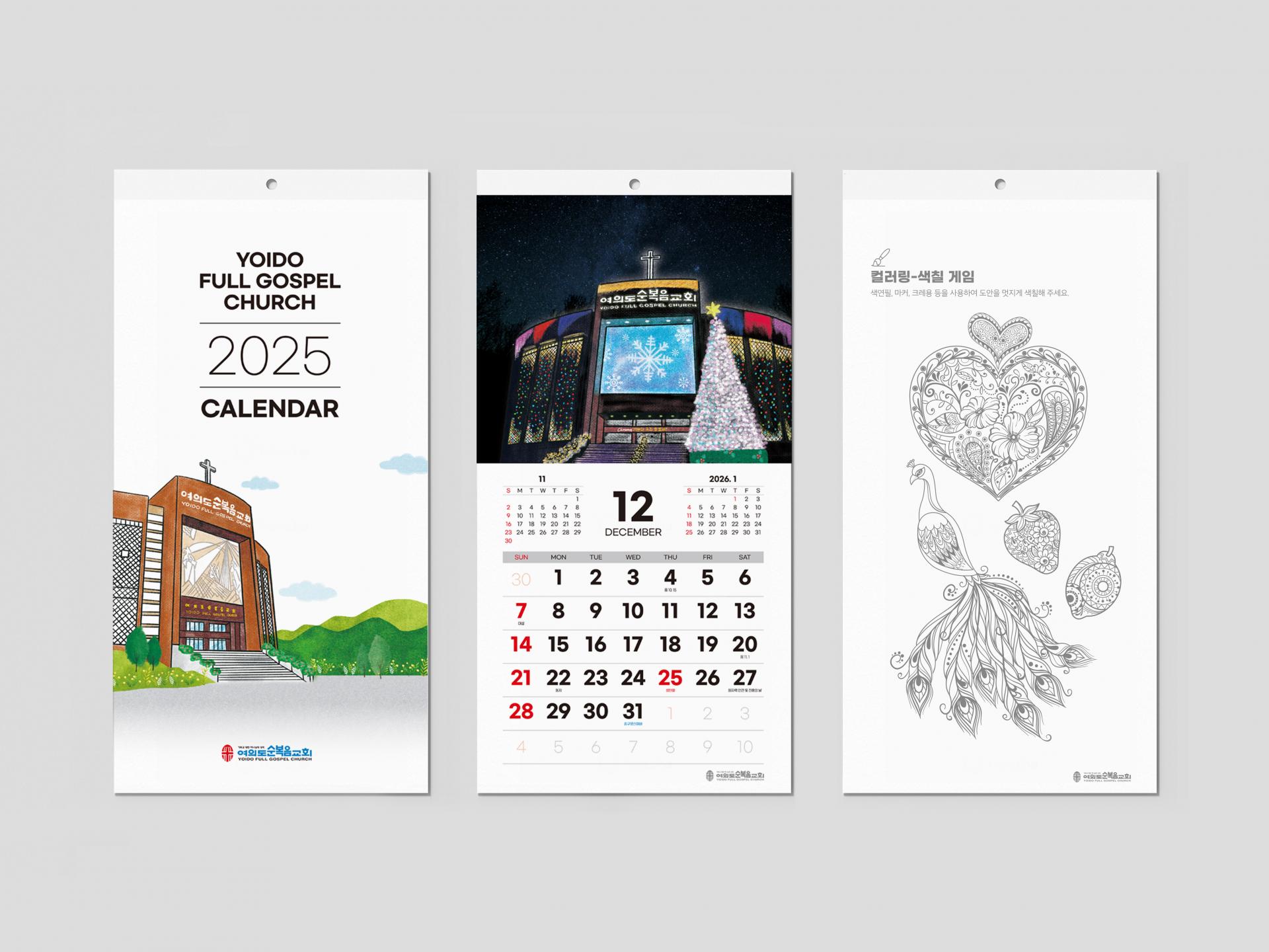 교회, 유관기관 전경, 주요 행사 등에 계절감을 살린 자체제작 디지털 드로잉으로 디자인한 일러스트 캘린더입니다. 손으로 직접 그린듯한 질감으로 드로잉에 포인트를 주었고, 월력은 전월 마지막주와 내월 첫주를 함께 반영해 실사용 시 편의성을 높였습니다. 벽걸이 달력의 뒷면을 활용하여 교회와 관련된 게임 컨텐츠를 매월 다르게 삽입하여 다음월로 넘어갈 때 활용할 수 있도록 재미를 주었습니다.