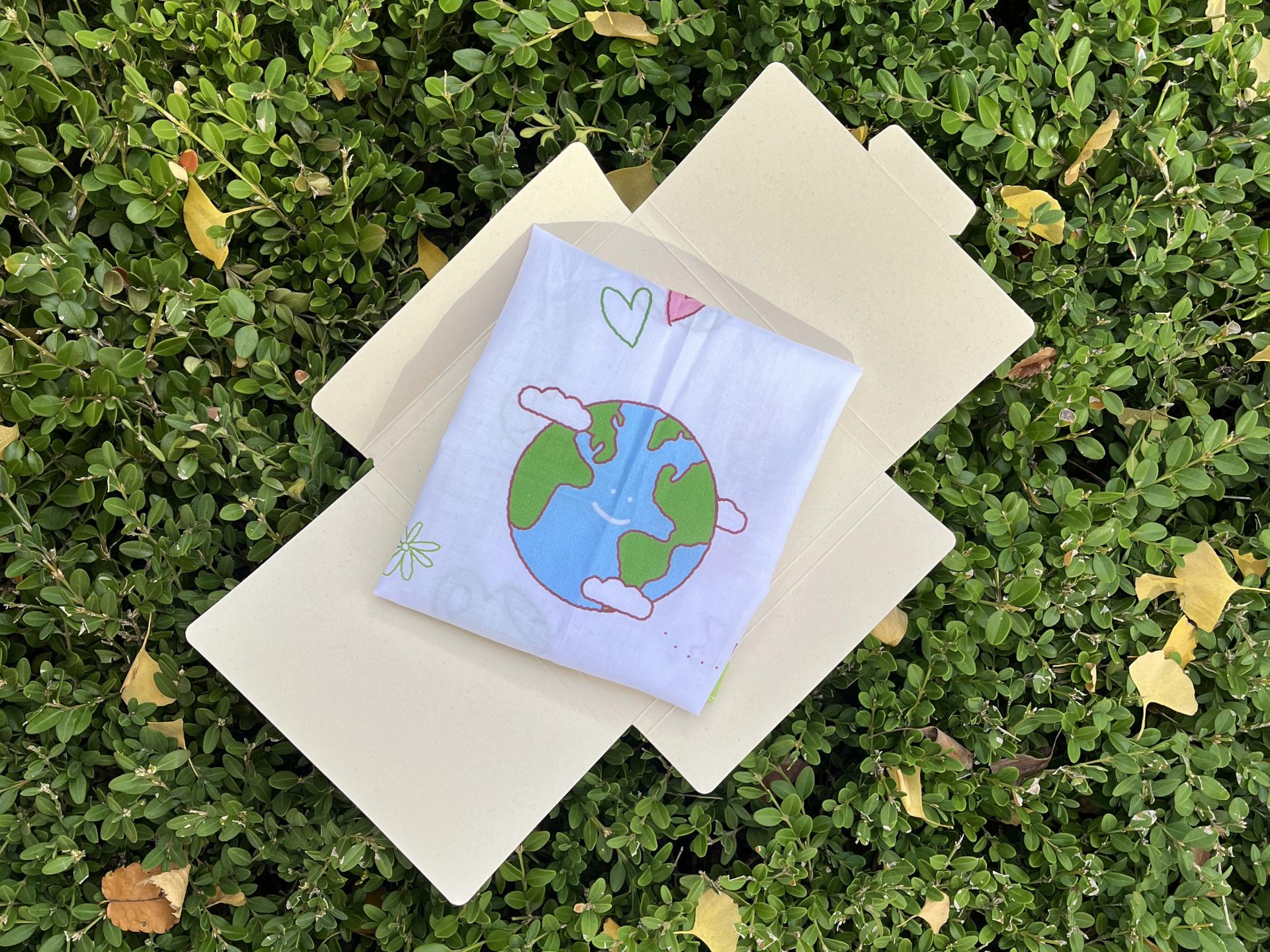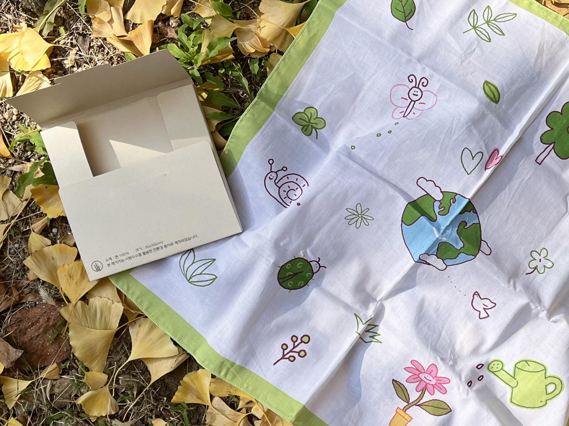 환경의 날 행사 증정용 친환경 순면 굿즈 디자인입니다. 어린이, 가족 단위의 참가자를 고려해 어린 아이가 그린 듯한 귀엽고 포근한 일러스트를 활용했으며, 전체적인 그림 톤과 테두리를 풀무원 로고의 연두색으로 지정해 기업 아이덴티티를 일부 반영했습니다. 패키지는 사탕수수 재생지를 이용해 접착제 없이 접어 완성하는 형태로 제작되었습니다.