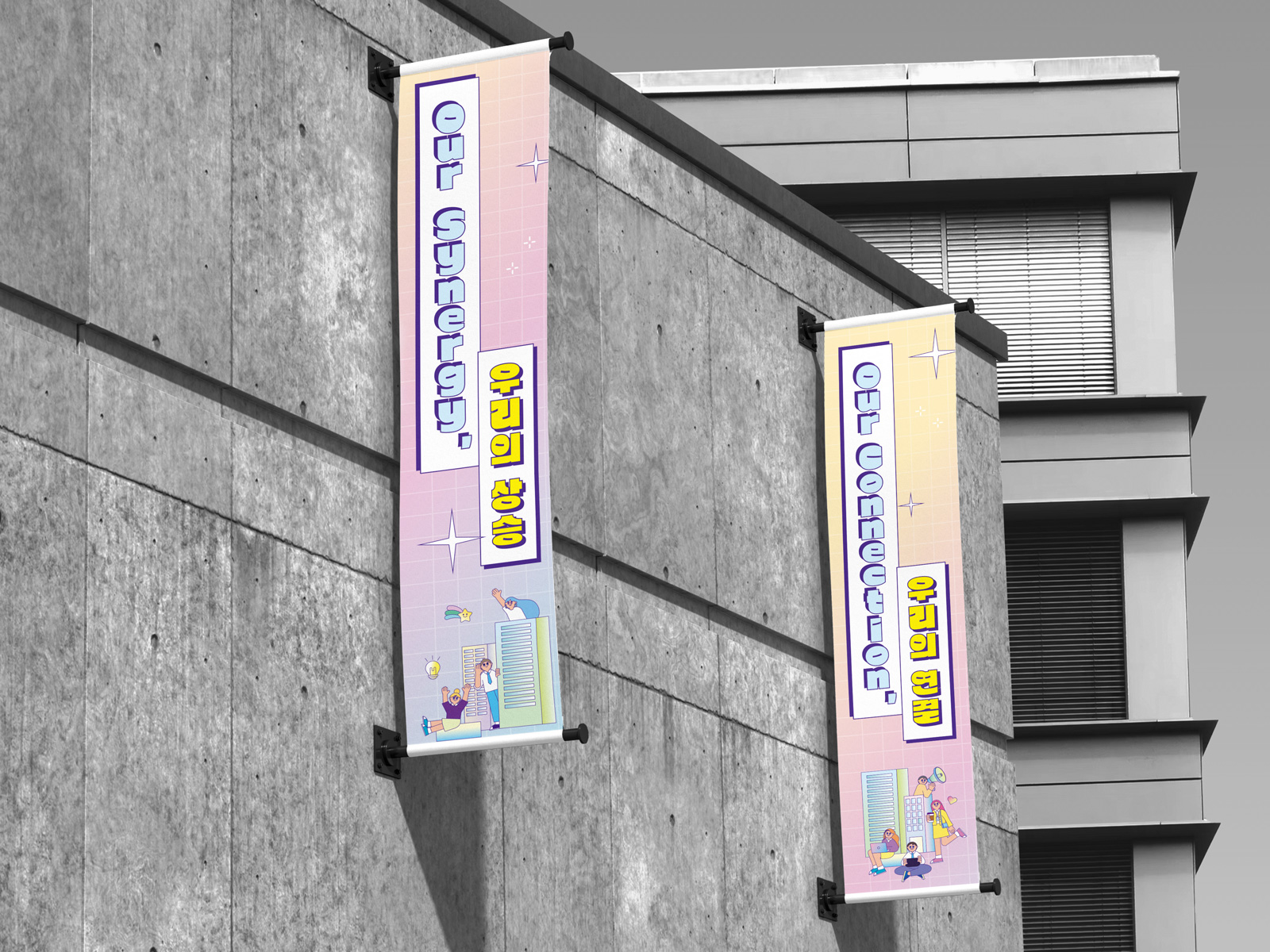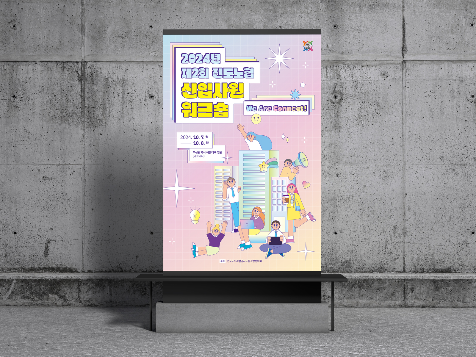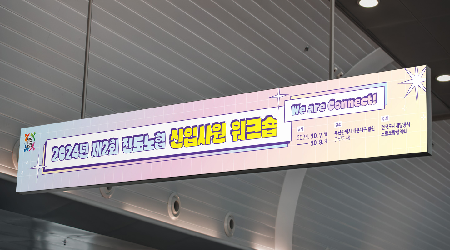 다양한 컬러와 재미있는 폰트, 레트로풍 일러스트를 균형감 있게 배치하여 신입사원의 밝고 활기찬 느낌을 표현한 워크샵 행사 홍보물입니다. 파스텔톤 그라데이션 배경으로 첫만남의 즐거움과 기대감을 효과적으로 표현해줬으며, 키치한 라인 아이콘을 포인트로 사용하여 친근함과 경쾌함을 강조합니다.