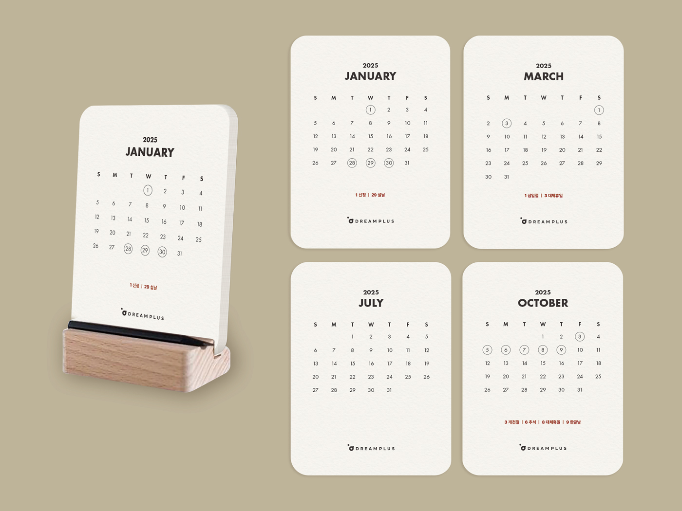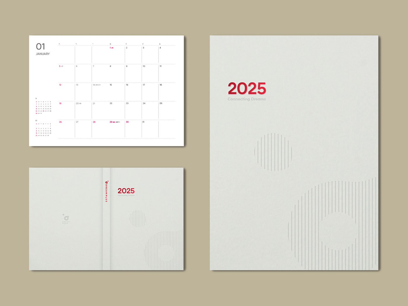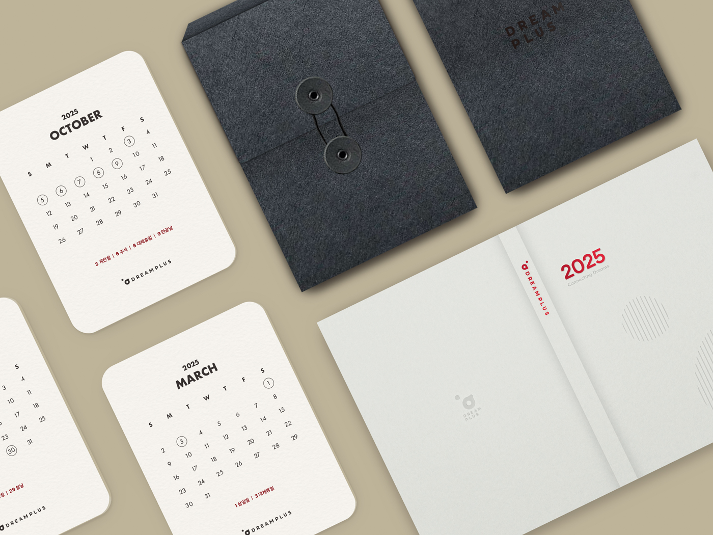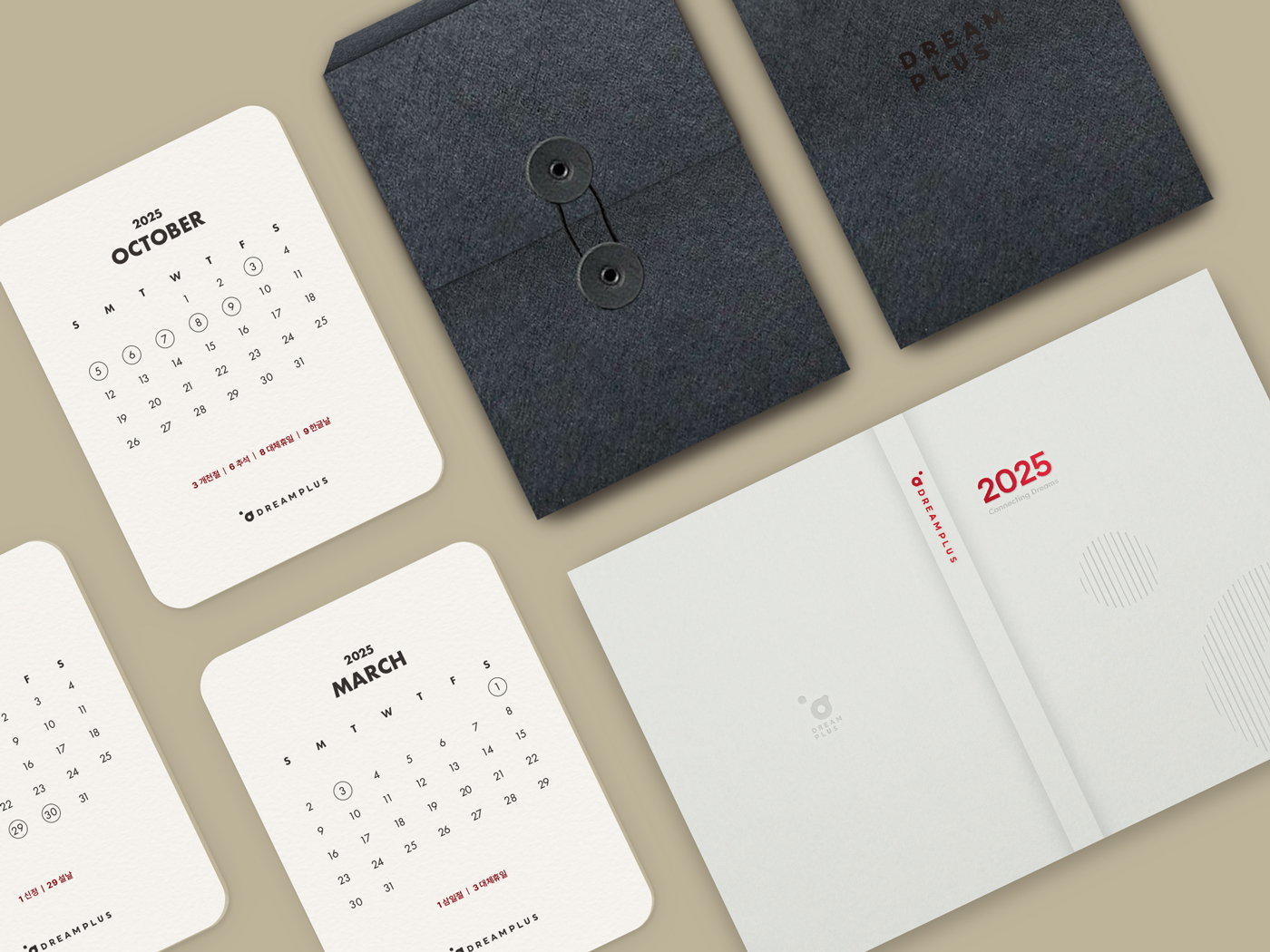 클라이언트 드림플러스 디자인품목 다이어리, 낱장캘린더, 패키지 제작연도 2024 | 톤다운 된 베이지와 블랙을 바탕으로 포인트 컬러인 레드를 활용하여 세련되고 현대적인 느낌을 주는 시즌물 세트입니다. 낱장 캘린더는 숫자판 레이아웃만을 이용해 깔끔하고 정돈된 인상을 주며, 다이어리 표지는 브랜드 심볼 로고 형상을 강조하였습니다.