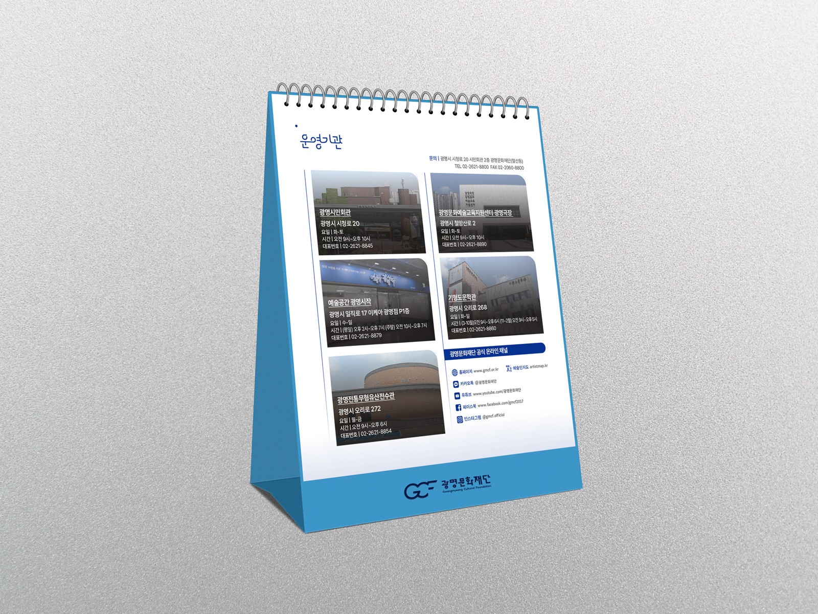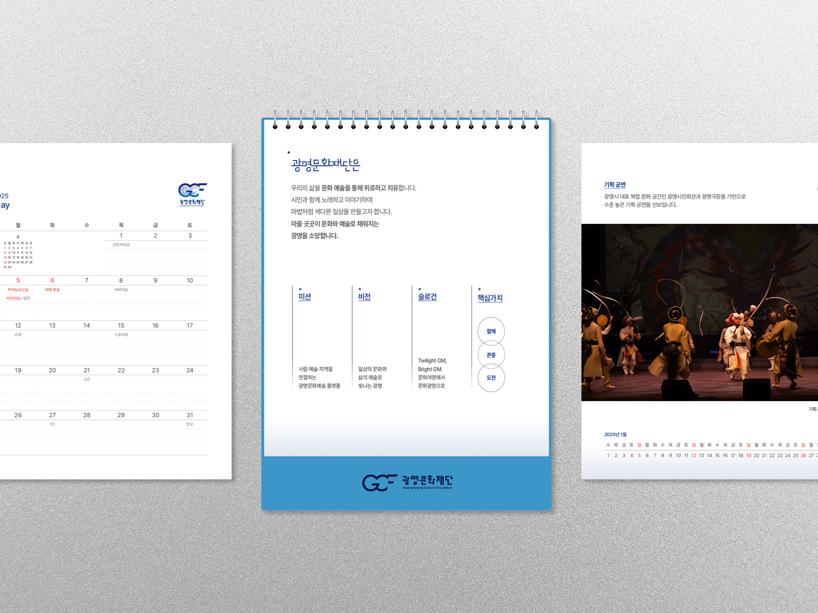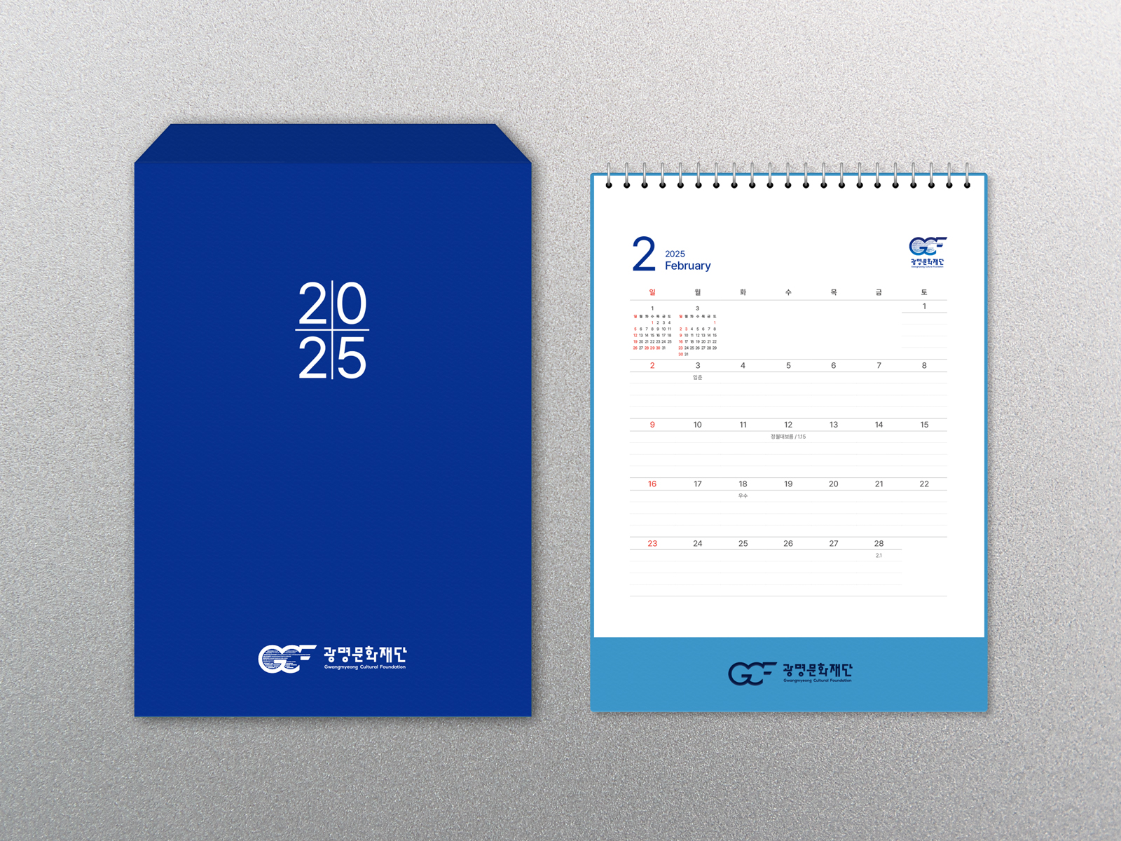 클라이언트 광명문화재단 디자인품목 탁상캘린더, 패키지 제작연도 2024 | 브랜드 심볼 컬러인 블루를 메인으로 심플한 레이아웃을 강조한 캘린더 및 패키지입니다. 그림판 부분은 사진이 돋보일 수 있도록 중앙에 크게 배치하였으며, 월판엔 일자별 칸 안의 구분된 라인을 추가로 활용하여 메모하기 용이하도록 실용성에 중점을 두었습니다.