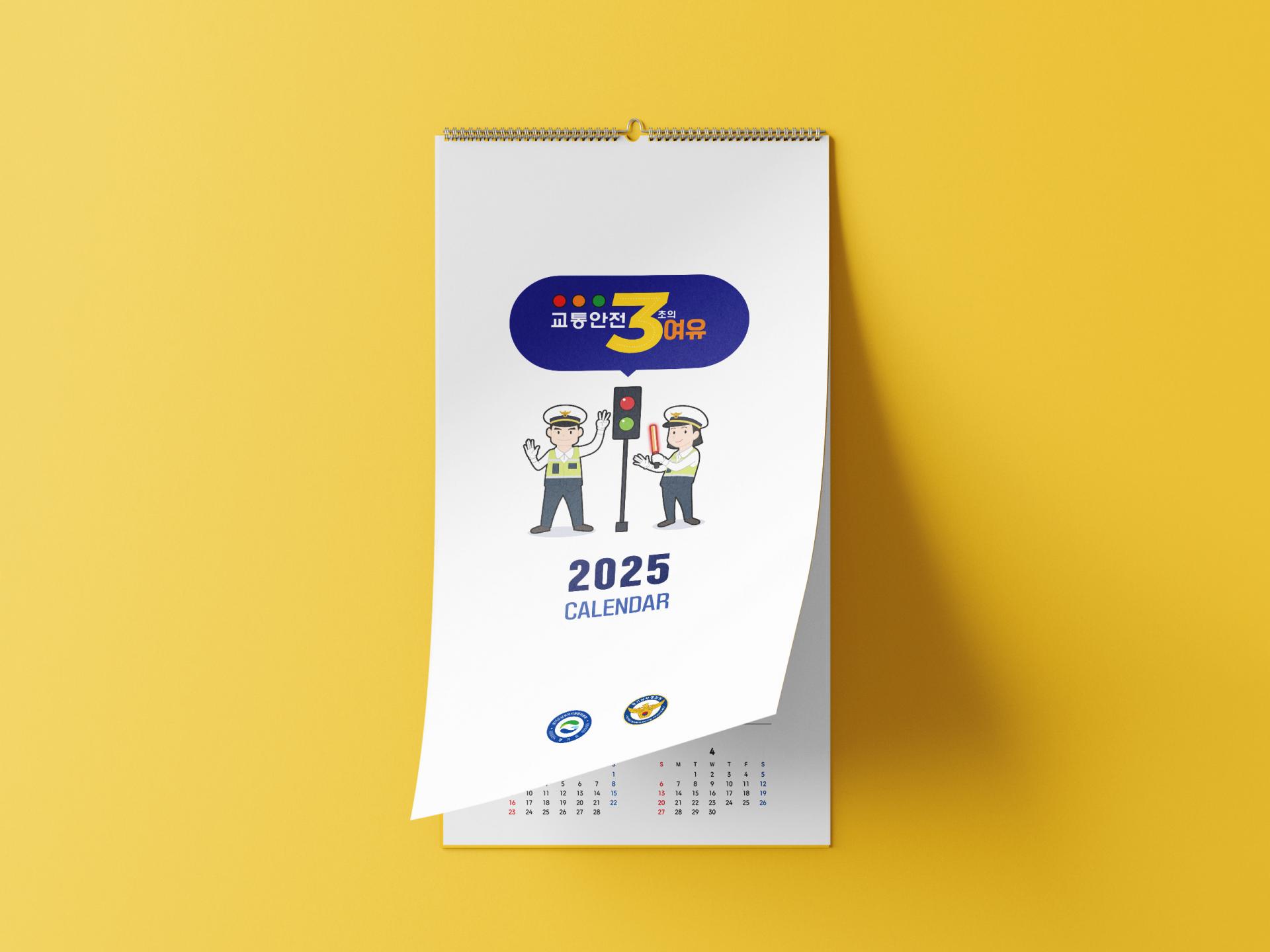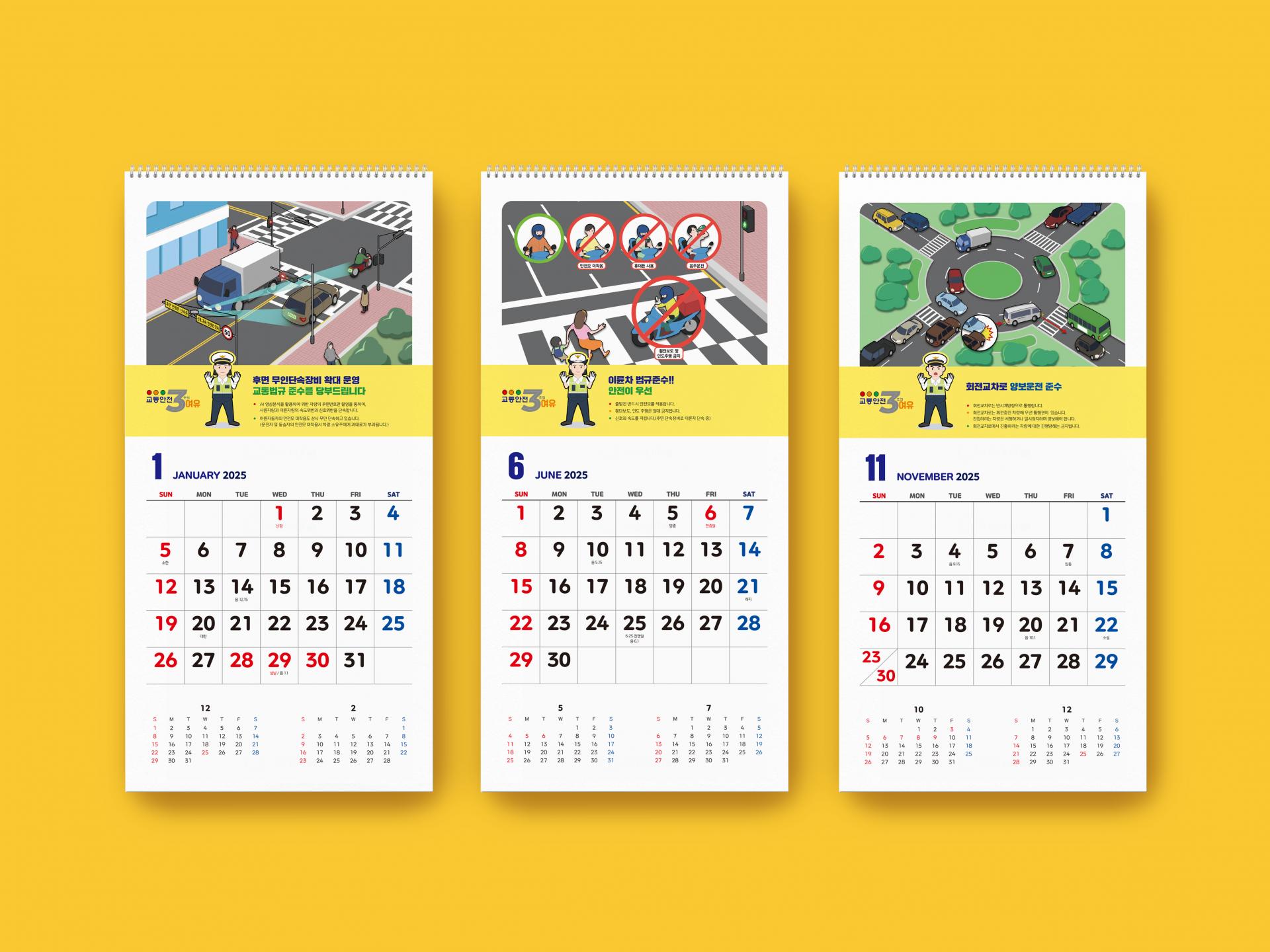 클라이언트 경기도남부 자치경찰위원회 디자인품목 벽걸이 캘린더 제작연도 2024 | 각 월마다 교통안전 관련 컨텐츠를 담은 벽걸이 캘린더입니다. 관공서 제작물에 자주 쓰이는 특유의 볼드하고 직관적인 일러스트로 신뢰감과 이해도를 높였습니다. 월판은 그림체와의 균형을 위해 볼드하면서도 모퉁이가 둥근 경쾌한 느낌의 폰트를 채택해 경고문의 내용이 지나치게 심각해 보이지 않도록 분위기를 조정하는 역할을 합니다.