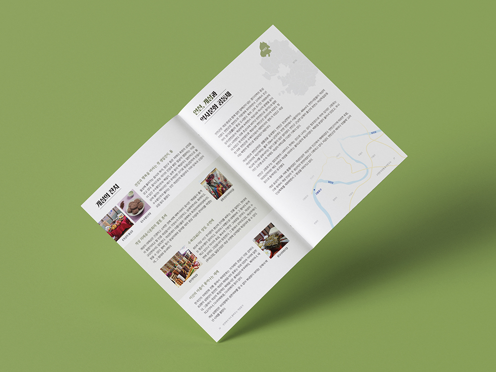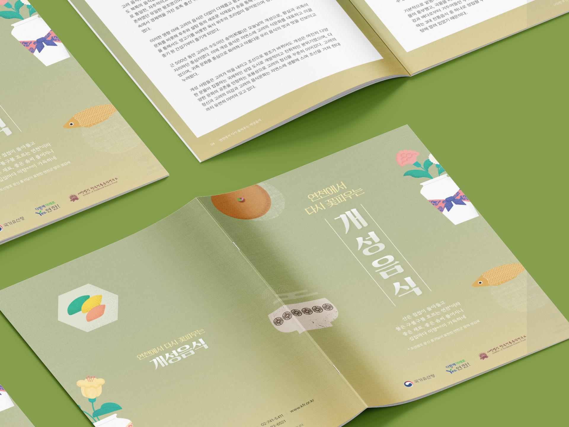 클라이언트 한국전통음식연구소 | 이북(개성)음식의 전통, 연천에서의 계승, 부흥을 소개하는 소책자입니다. 표지는 연한 쑥색+노란색의 따뜻한 그라데이션 배경에 질감을 살린 개성의 전통음식과 꽃 일러스트를 삽입해 '꽃피우는 개성음식'이라는 타이틀을 고전적인 느낌으로 표현했습니다. 내지의 목차와 일부 페이지에는 연천을 흐르는 임진강의 물줄기로 지역의 특색을 반영하고, 계절 밥상 페이지에는 각 계절을 반영한 작은 일러스트를 추가해 내용의 구분과 이해를 돕도록 디자인했습니다. ![]() ![]() ![]() ![]()