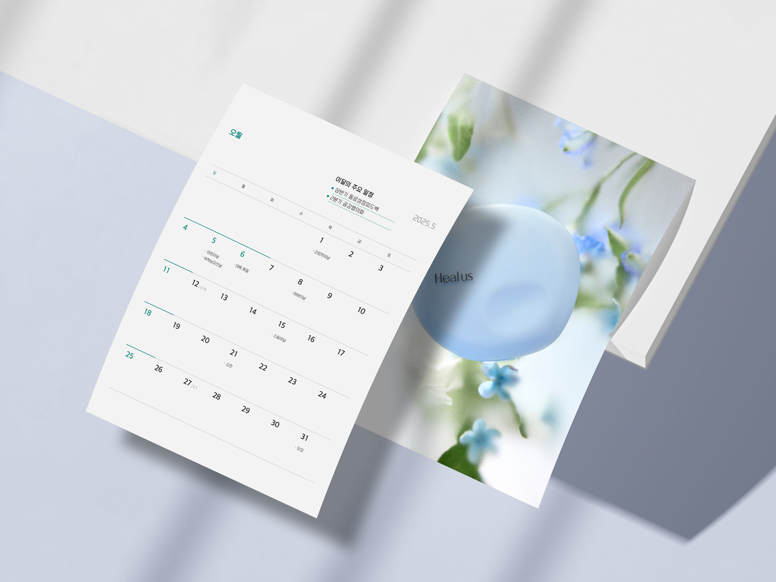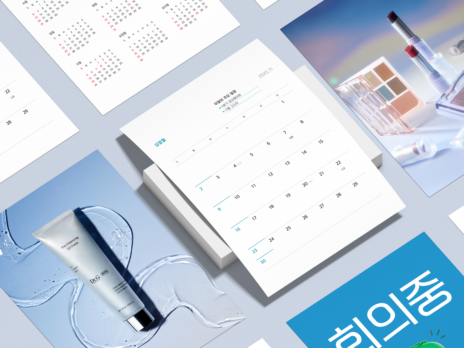 클라이언트 고운세상코스메틱 디자인품목 탁상캘린더 제작연도 2025 | 심플한 레이아웃과 정제된 색감을 활용하여 제품 이미지를 강조한 탁상캘린더 디자인입니다. 각각의 다른 포인트 컬러를 사용하여 월마다 변화를 주었으며, 크게 배치된 뒷면의 이미지는 브랜드 특유의 깔끔하고 청결한 감성을 전달합니다.
