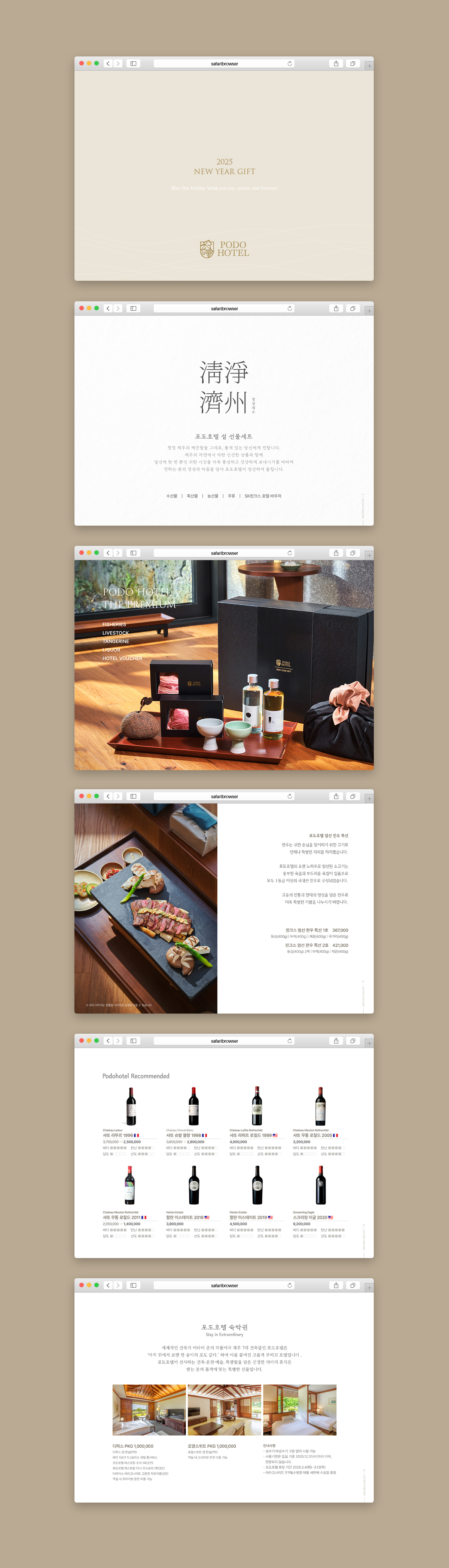 지역 특산물로 구성된 제주 포도호텔의 명절 선물세트 홍보 웹용 브로셔입니다. 불필요한 장식 요소는 모두 배제하고 제품 사진과 정보만을 깔끔하게 배치한 심플하고 고급스러운 디자인입니다.