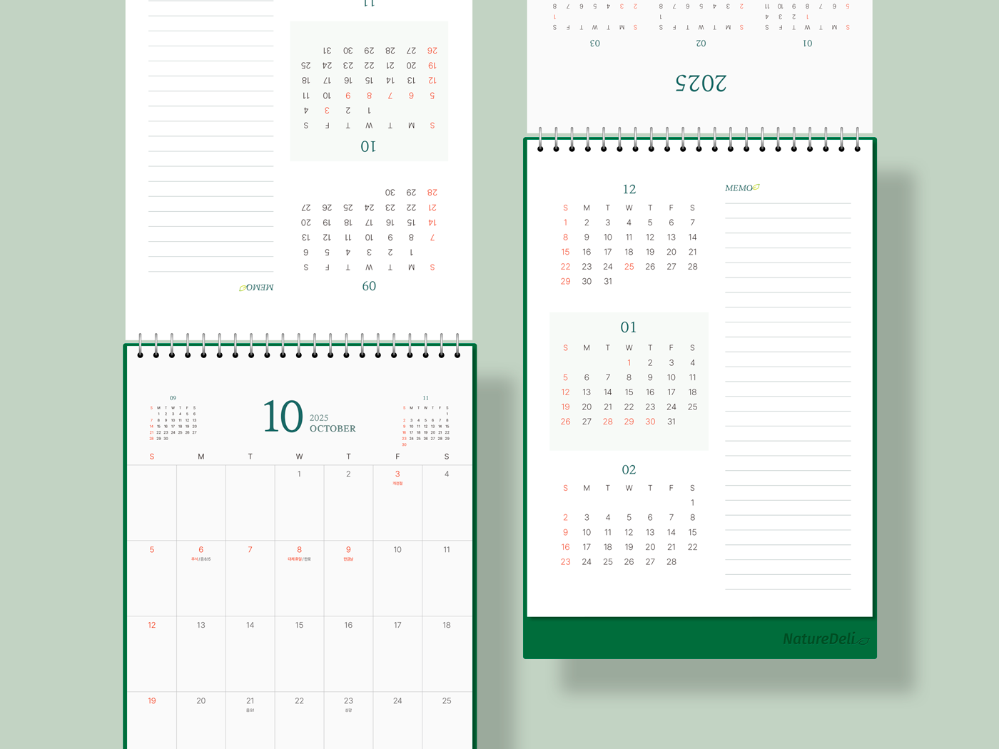 자연을 연상시키는 그린 컬러를 사용하여 간결하고 차분한 느낌을 강조한 탁상캘린더입니다. 각 날짜마다 넉넉한 공간을 제공하는 월판은 메모의 편리함을 더하며, 뒷면에는 3개월 달력을 배치하여 일정 관리와 메모를 동시에 할 수 있도록 실용성을 높였습니다.