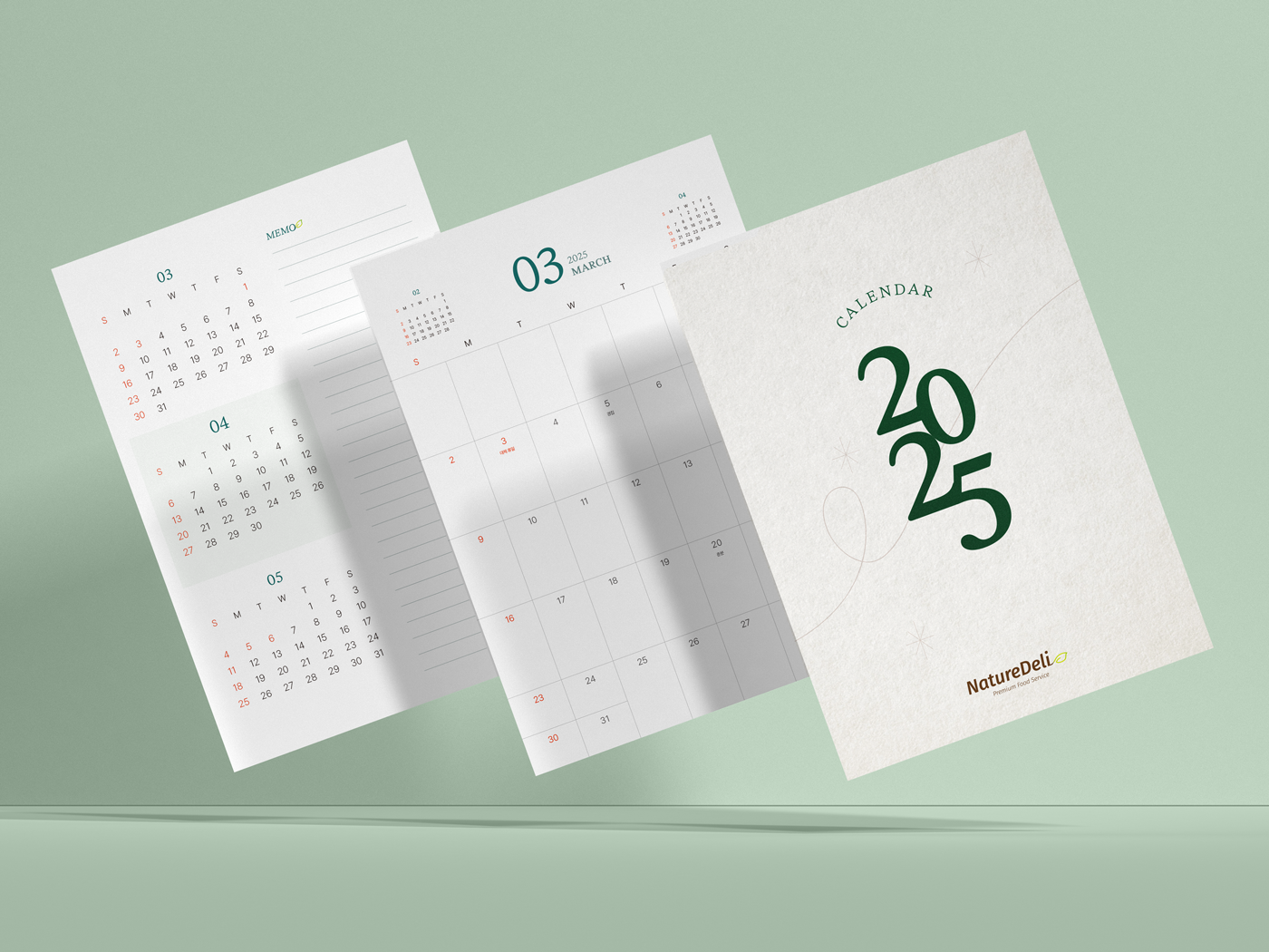 클라이언트 하림네이처델리 디자인품목 탁상캘린더 제작연도 2024 | 자연을 연상시키는 그린 컬러를 사용하여 간결하고 차분한 느낌을 강조한 탁상캘린더입니다. 각 날짜마다 넉넉한 공간을 제공하는 월판은 메모의 편리함을 더하며, 뒷면에는 3개월 달력을 배치하여 일정 관리와 메모를 동시에 할 수 있도록 실용성을 높였습니다.
