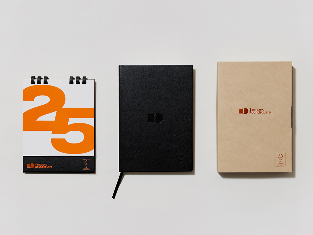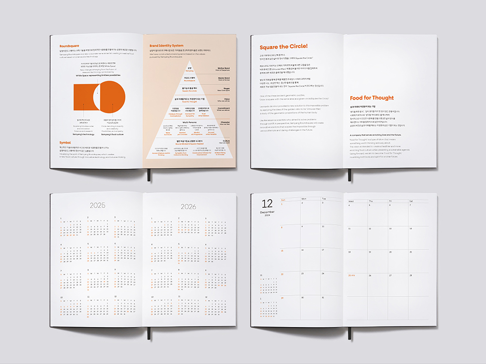 클라이언트 삼양 디자인품목 탁상캘린더, 다이어리 제작연도 2024 | 이미지나 일러스트 없이 숫자만으로 구성된 깔끔한 다이어리와 달력입니다. 삼양의 기념일과 공휴일을 제외한 음력과 절기 정보를 제거하여 간결함을 강조했으며, 삼양 메인 주황/검정 두 가지 색상만 사용하여 브랜드 아이덴티티를 명확하게 드러냈습니다.