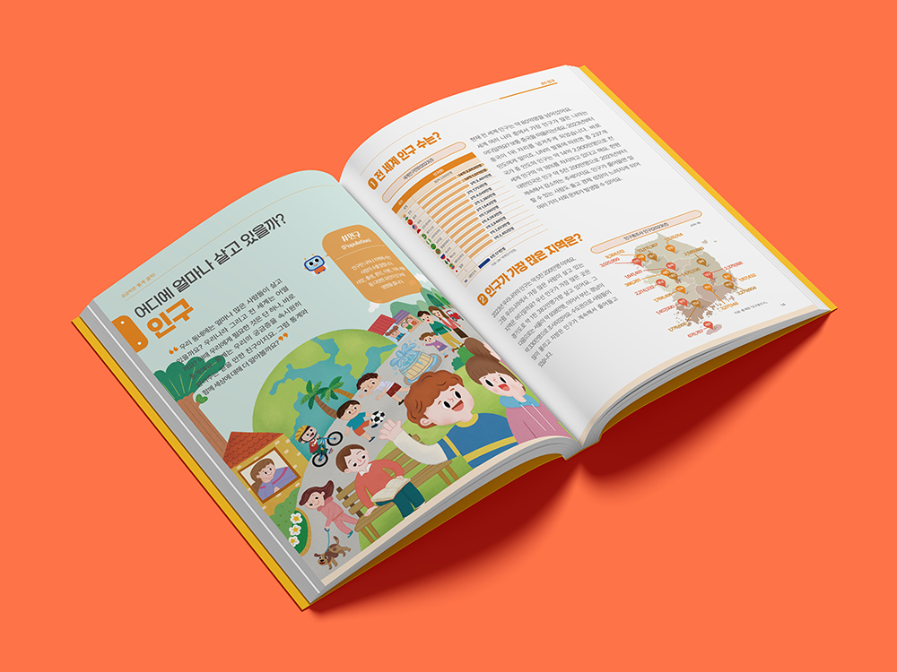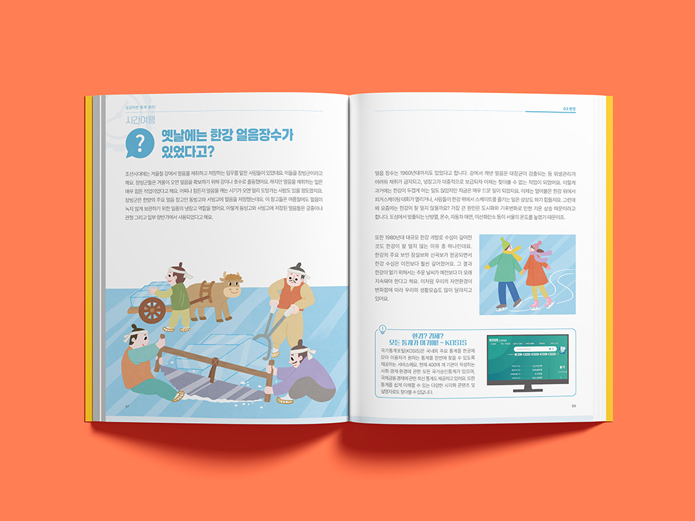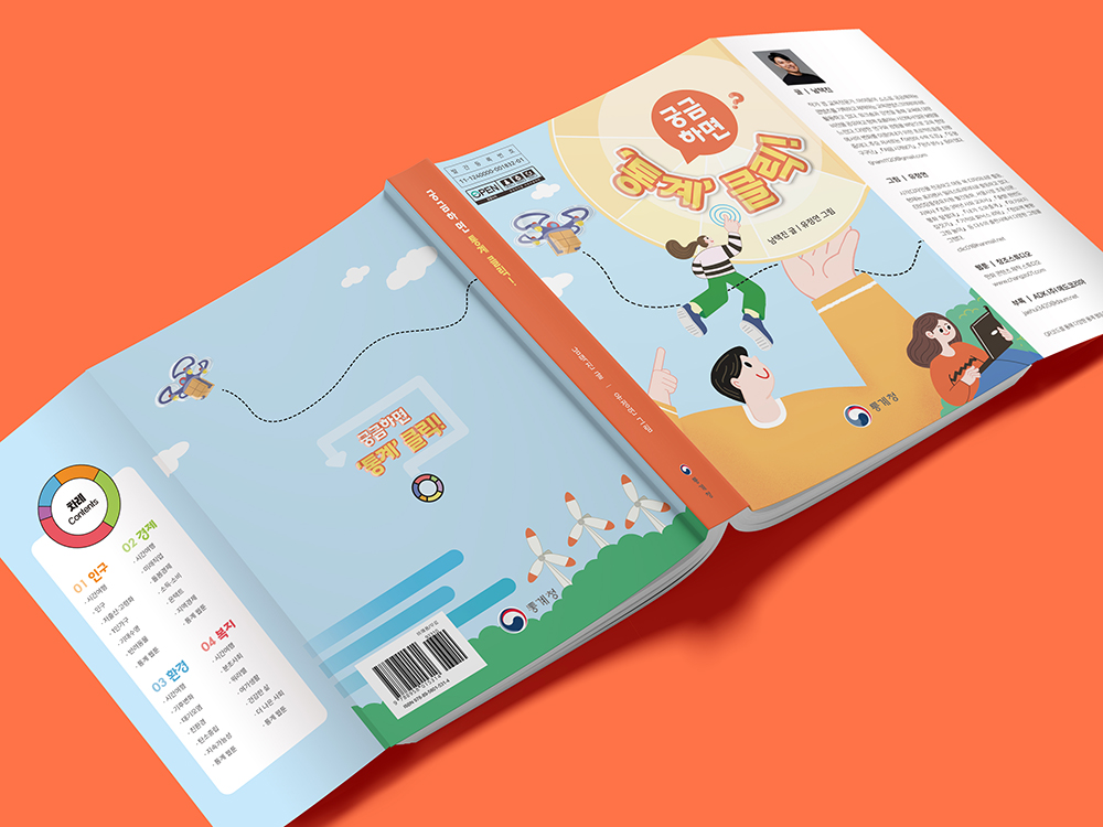 교육 대상인 초등학생의 눈높이에 맞춰 귀엽고 화사한 삽화 자료를 다수 활용한 디자인으로, 고정 레이아웃을 해치지 않는 선에서 다양한 배치를 시도해 가독성과 내지의 일관성을 유지했습니다. 어렵게 느껴지는 통계 분야에 재미있고 쉽게 접근할 수 있는 교육책자입니다.