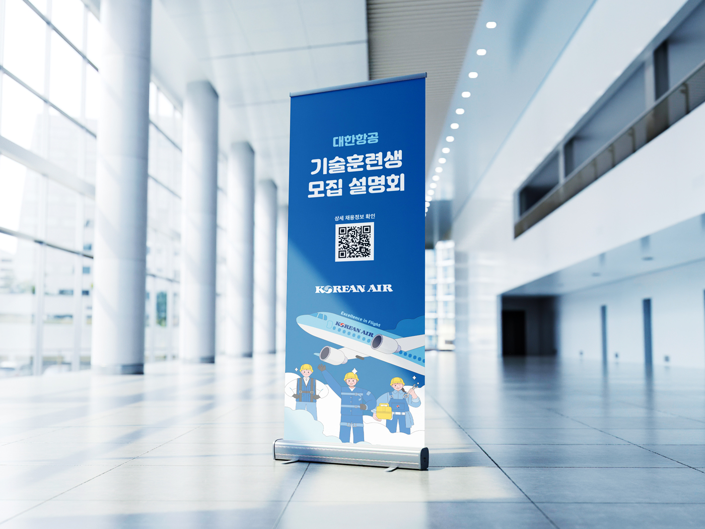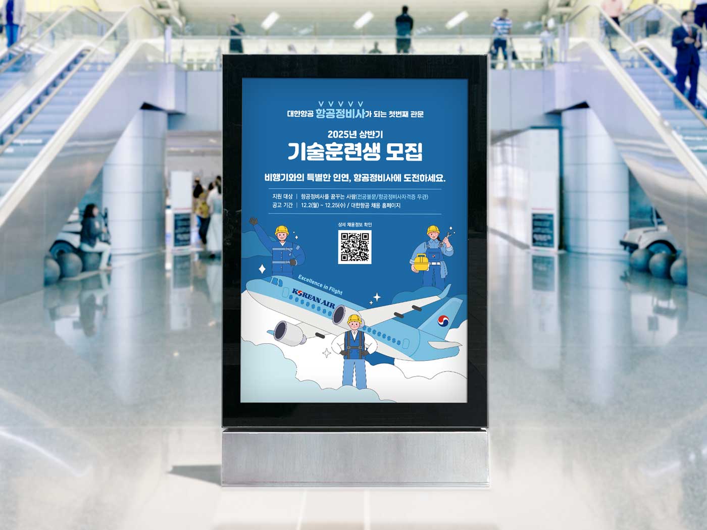 클라이언트 대한항공 | 정비사와 항공기 모습이 담긴 라인 일러스트 키비주얼을 활용하여 직관적으로 내용을 표현한 훈련생 모집 홍보물입니다. 브랜드 메인 컬러인 블루를 주 배경색으로 사용하고, 실제 항공기의 외관과 유사한 비행기 일러스트를 사용해서 포인트를 주었습니다.