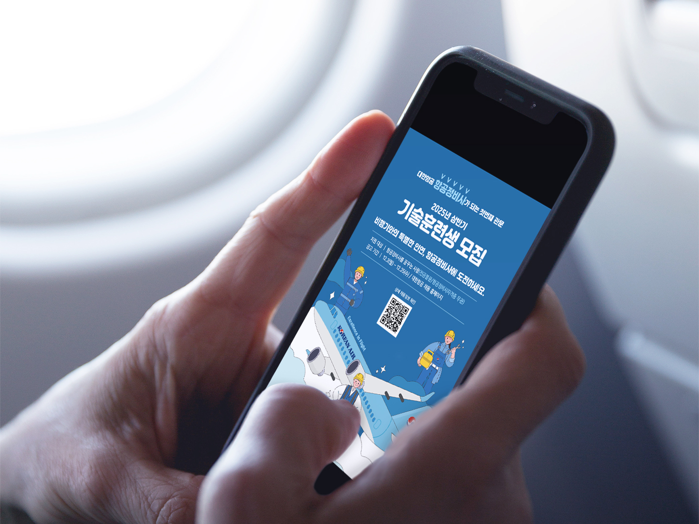 정비사와 항공기 모습이 담긴 라인 일러스트 키비주얼을 활용하여 직관적으로 내용을 표현한 훈련생 모집 홍보물입니다. 브랜드 메인 컬러인 블루를 주 배경색으로 사용하고, 실제 항공기의 외관과 유사한 비행기 일러스트를 사용해서 포인트를 주었습니다.