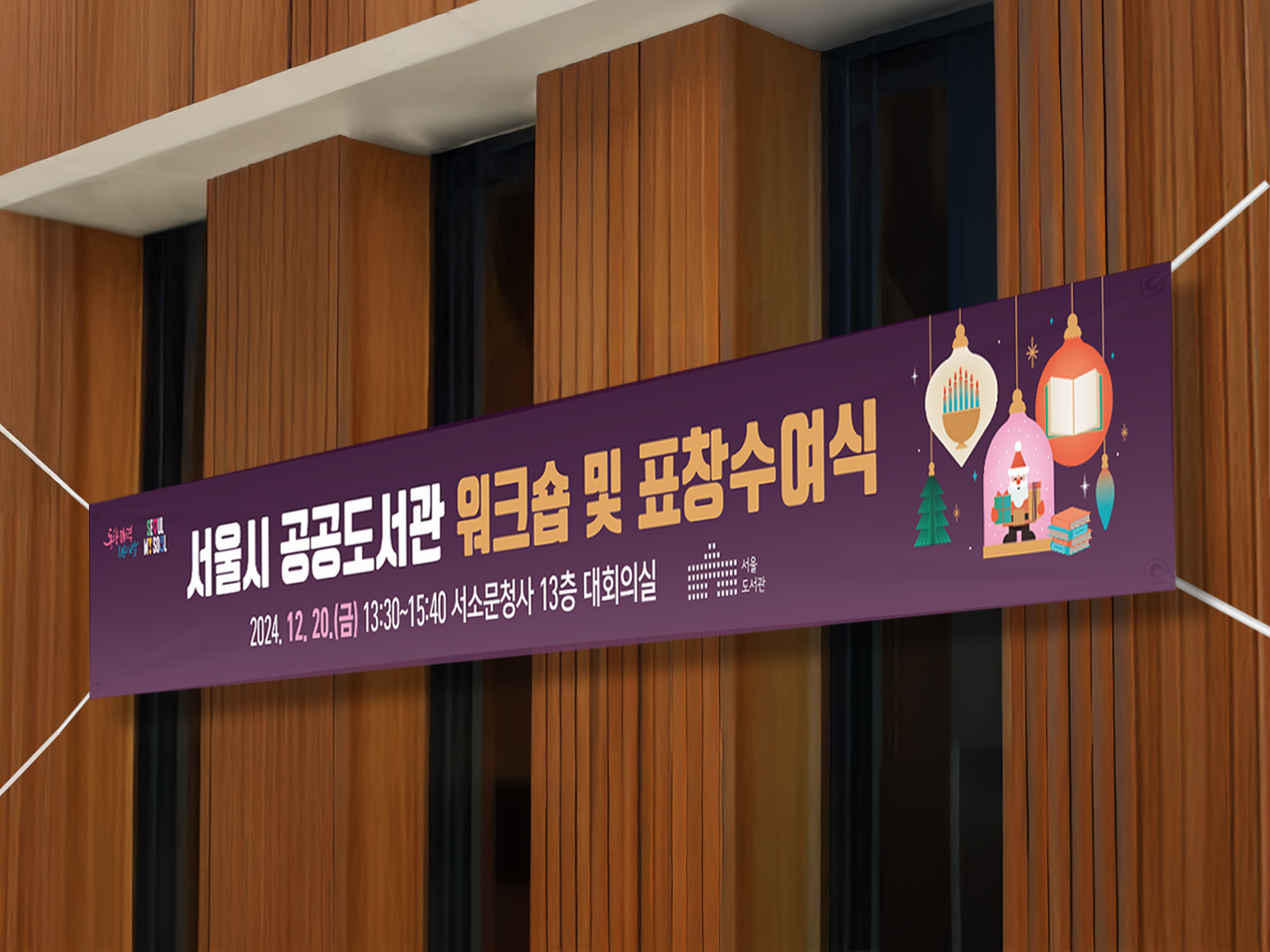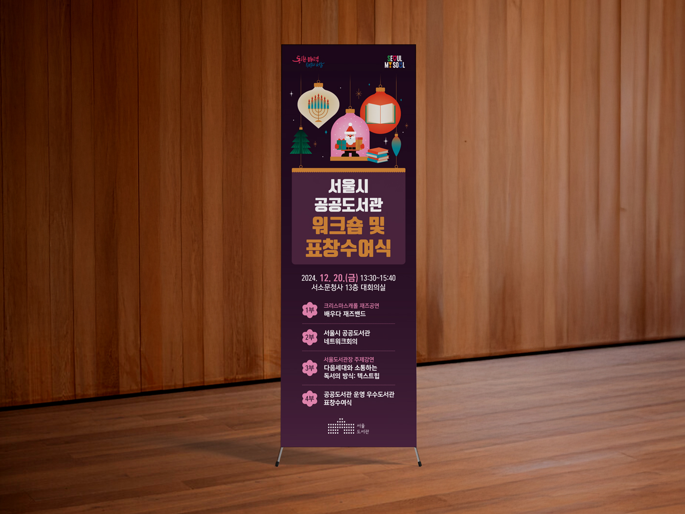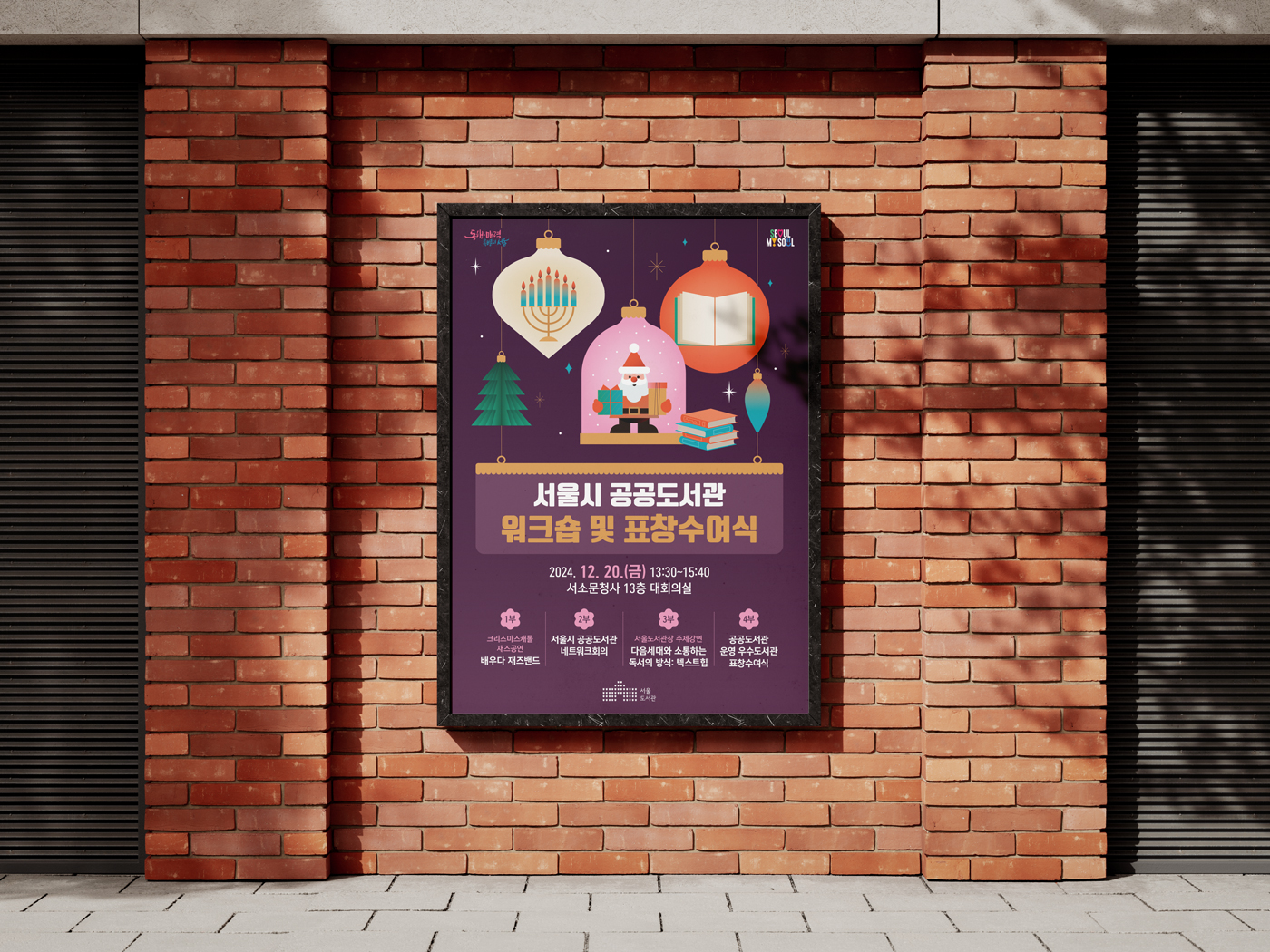 클라이언트 서울도서관 | 일러스트 키비주얼을 중심으로 크리스마스 분위기를 담아낸 행사 홍보물입니다. 촛불, 산타클로스, 크리스마스 트리 소재를 활용하여 연말 감성의 시각적 요소를 강조하였으며, 주목도 높은 메인 비주얼을 다양한 홍보물에 일관되고 통일성있게 적용하였습니다.