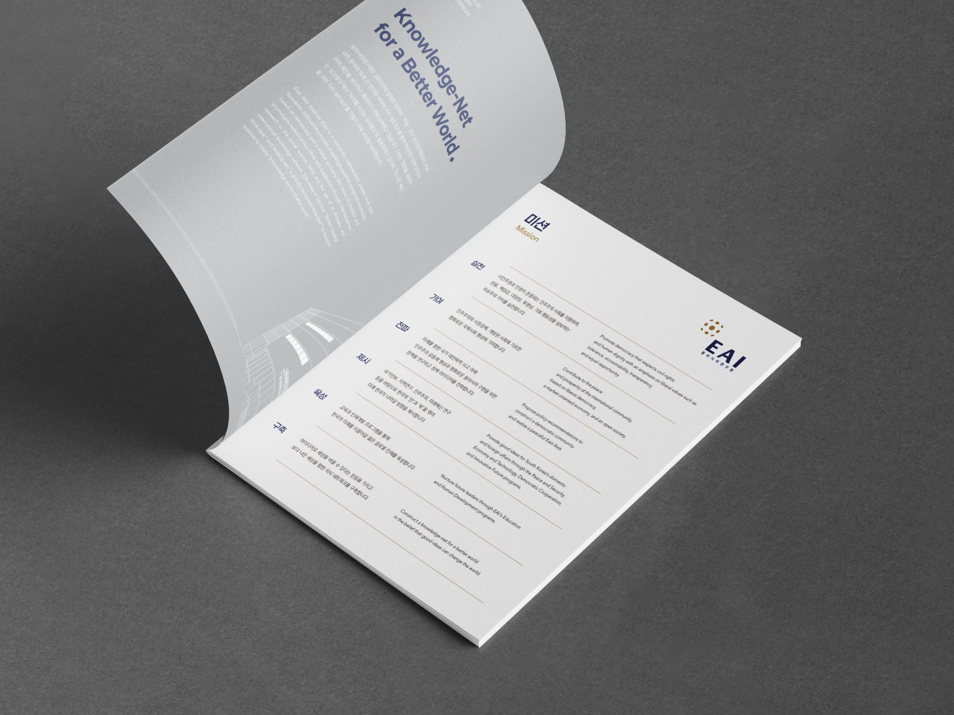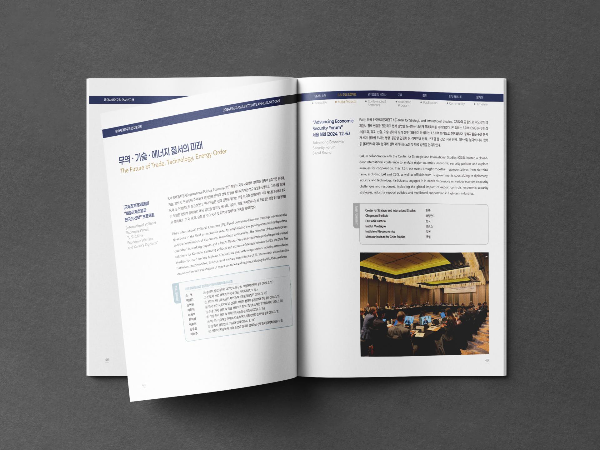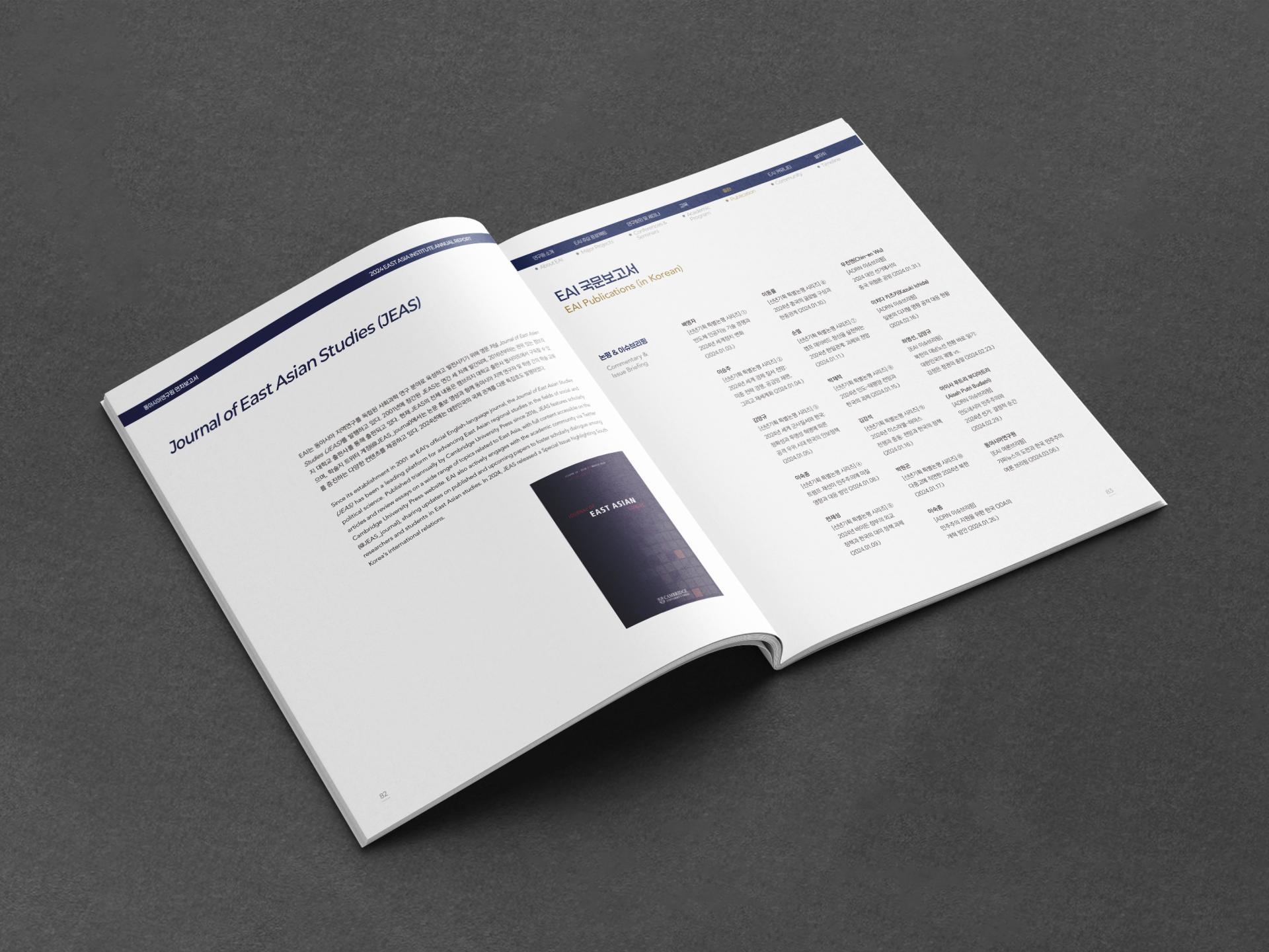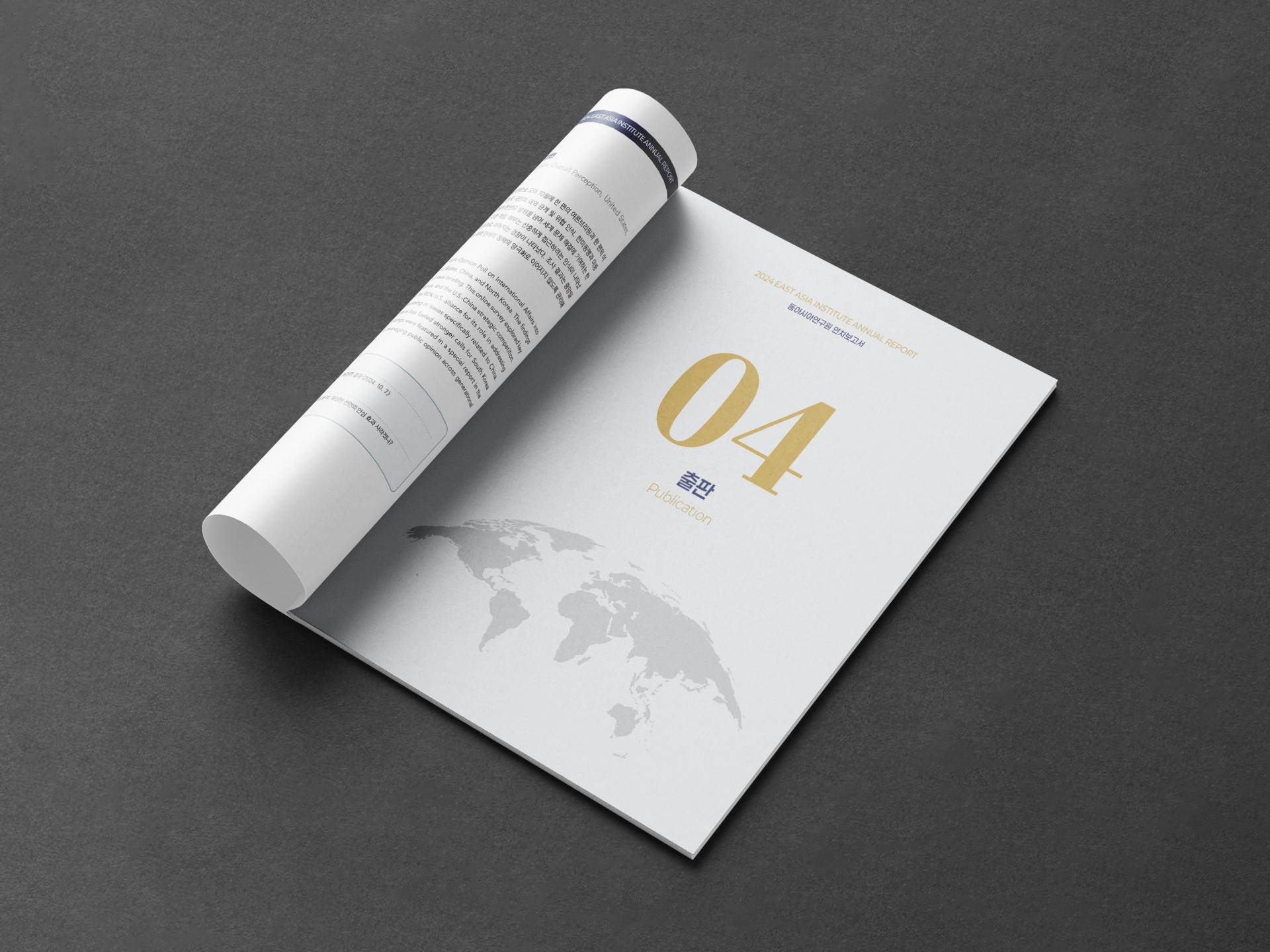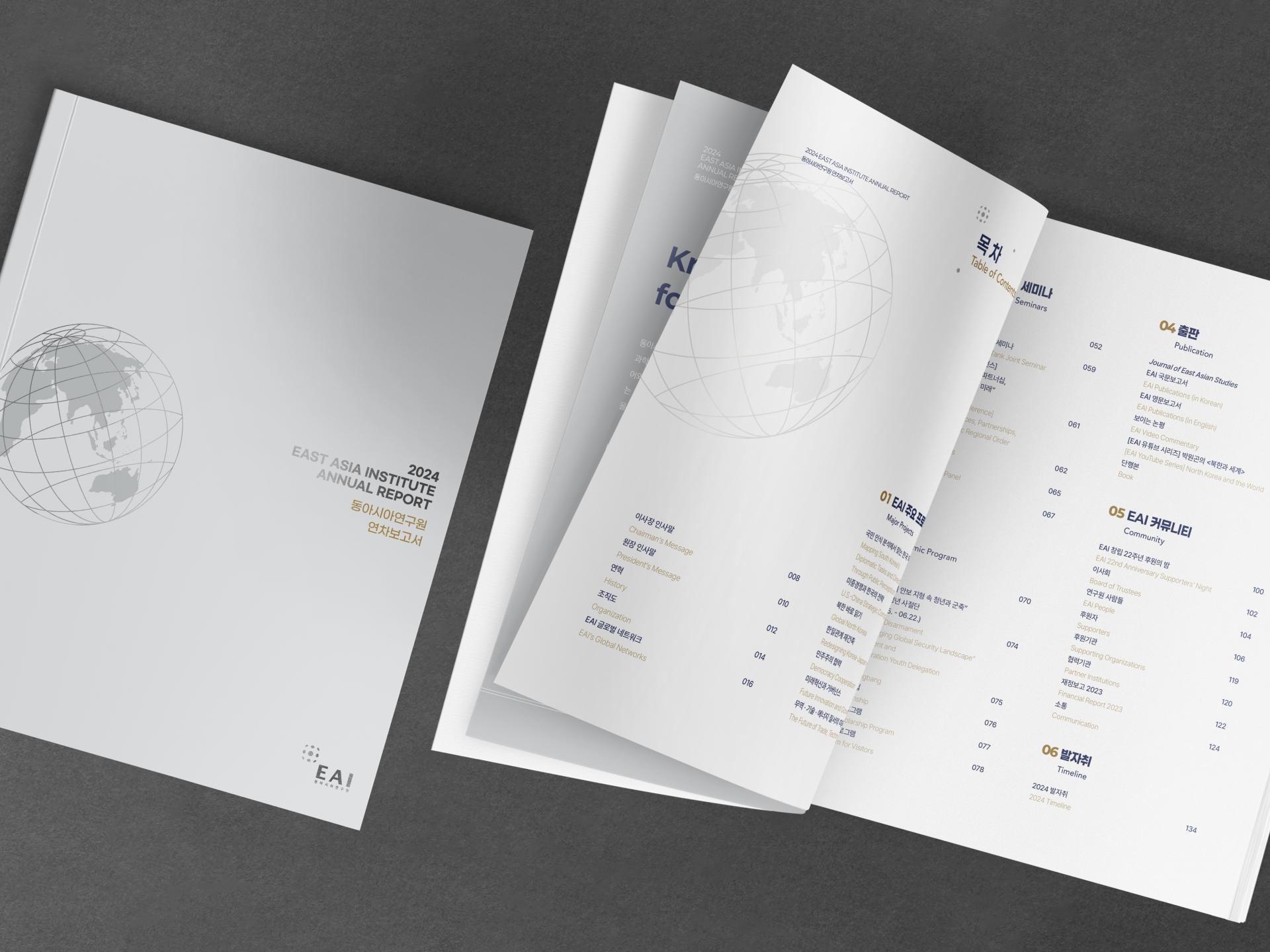 클라이언트 동아시아연구원 | 기관 고유 컬러인 네이비/골드 조합의 포인트 컬러 활용과 그레이톤 배경색으로 차분하고 안정적인 분위기를 연출하여 전문성과 신뢰감을 표현한 연차보고서입니다. 지구 형태의 그래픽을 표지 중앙에 배치하여 글로벌 연구기관의 특성을 강조하고, 내지엔 좌측 여백을 활용한 레이아웃으로 시각적인 정돈감을 높인 깔끔한 보고서 디자인입니다.