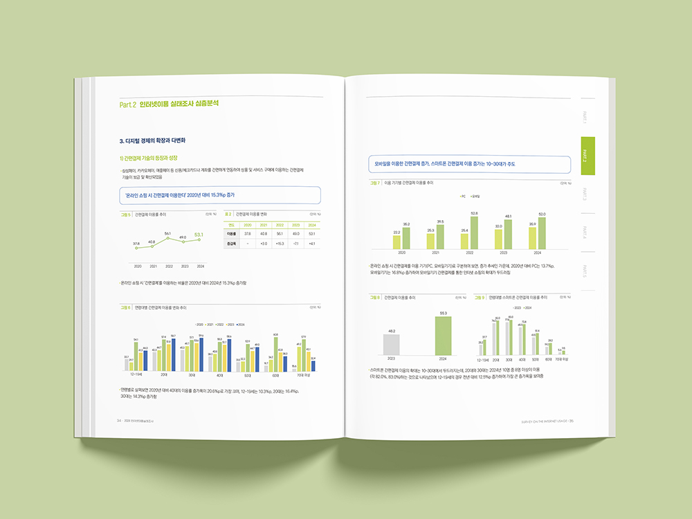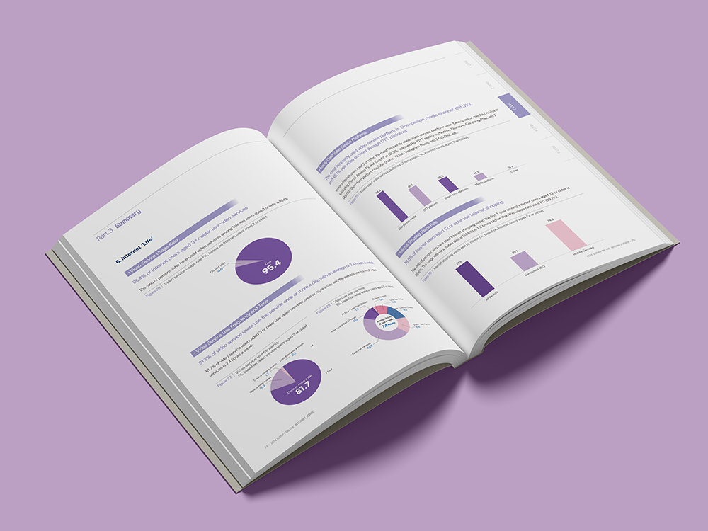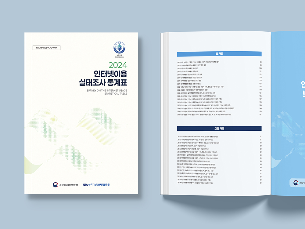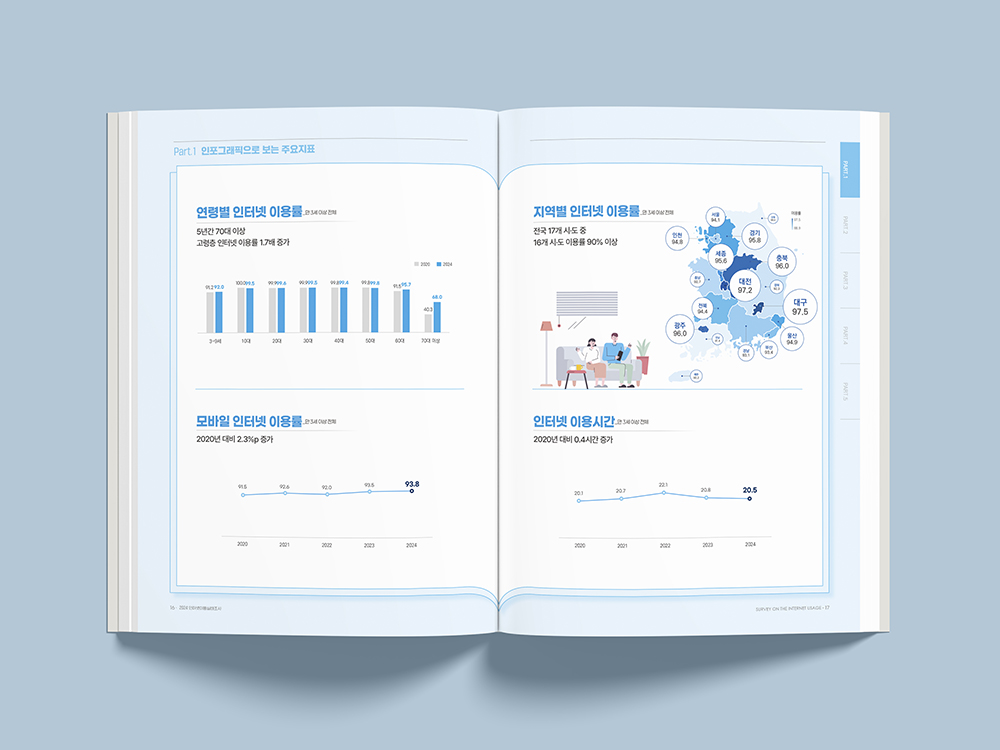 클라이언트 한국갤럽 | 디지털 환경을 상징하는 ‘물결’ 형태 속에 이진법(0과 1) 텍스트를 삽입해 패턴화한 표지 디자인은 심플하면서도 인터넷의 역동적인 특성을 효과적으로 보여 줍니다. 내지 디자인은 정보 전달을 최우선으로 최대한 깔끔하게 구성했으며 챕터별로 색상을 부여해 효과적으로 내용을 분류했습니다. ![]() ![]() ![]() ![]()