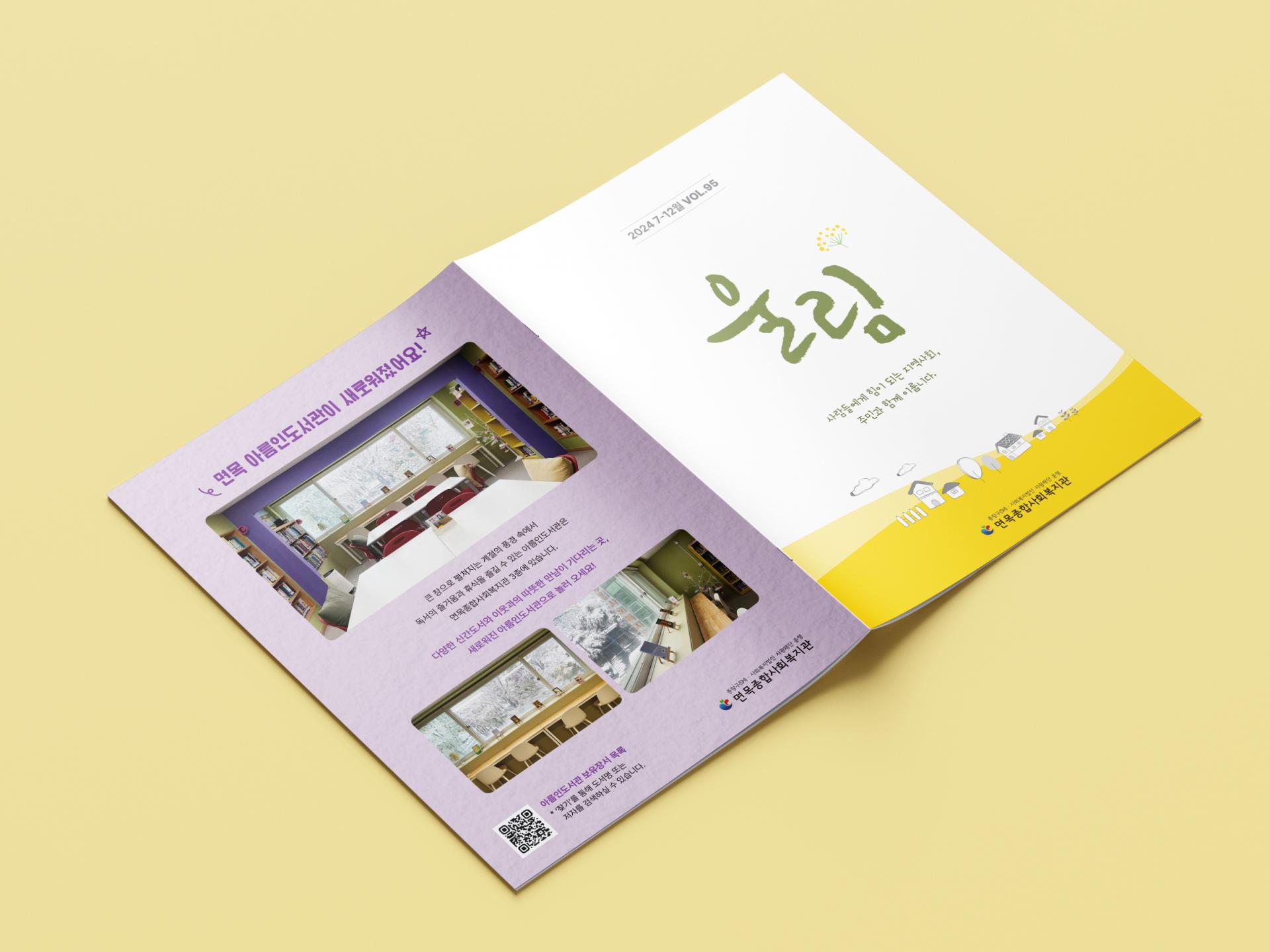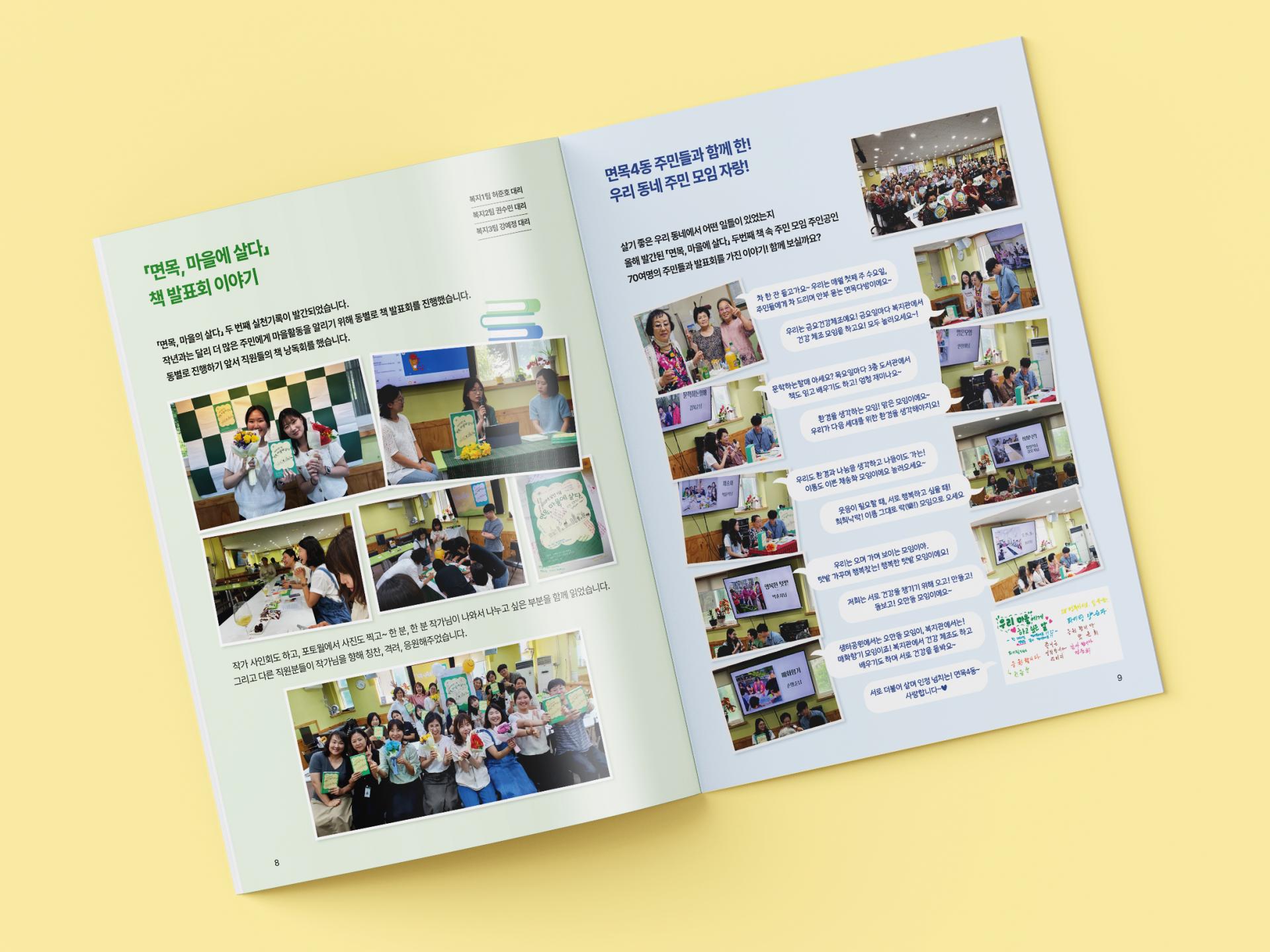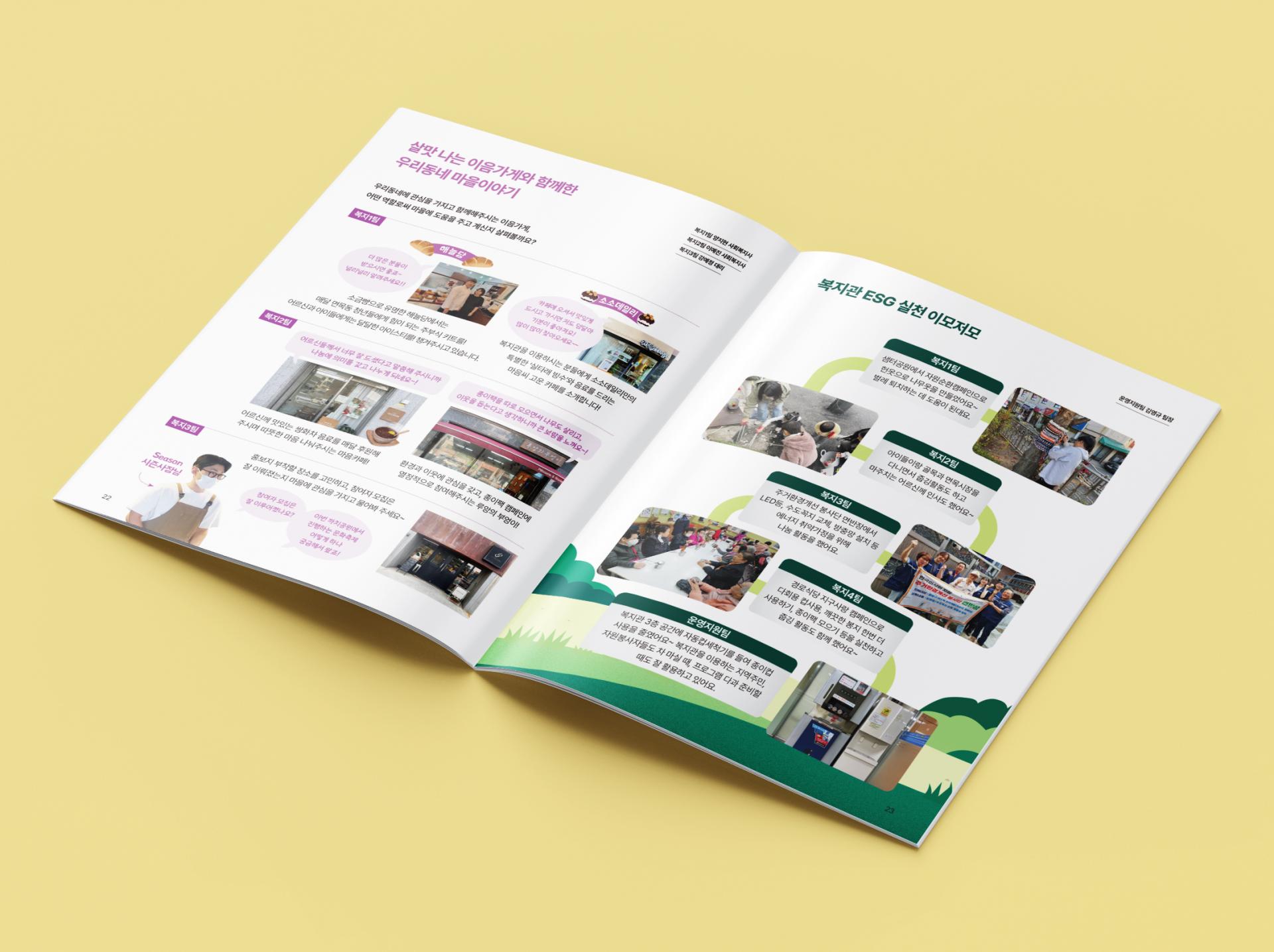 노란 톤 하단 포인트와 마을 일러스트로 소박하면서 따뜻한 분위기를 자아내는 표지는 발행 시기인 봄과 잘 어울립니다. 내지는 다양한 비율과 모양의 사진 프레임, 아기자기하고 친근한 디자인 요소, 잔잔한 파스텔톤 컬러의 사용으로 다정한 복지관의 이야기를 생동감 있게 전달합니다.