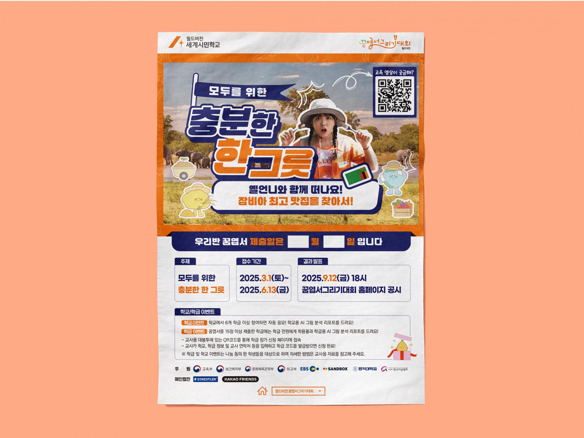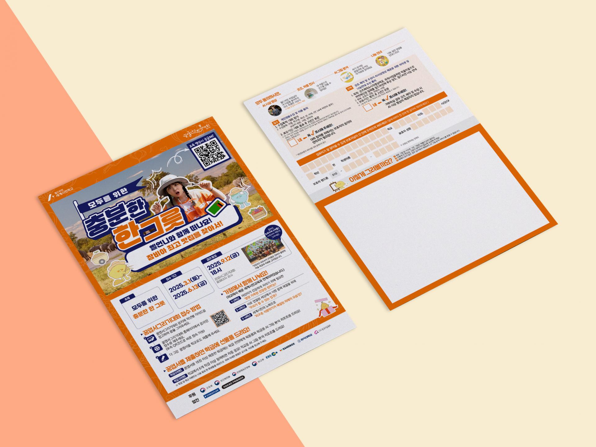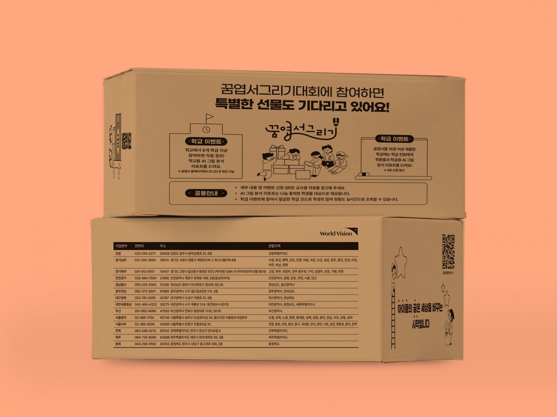기후, 식량 위기에 직면한 개도국 아이들을 돕기 위한 엽서 공모 홍보 제작물 세트입니다. 키비주얼은 프로젝트 기획 의도를 직관적으로 전달하기 위해 인플루언서가 등장하는 영상 컨텐츠 썸네일을 활용했습니다. 월드비전의 메인 주황 컬러와 대비를 주고, 각종 서브 그래픽과 호흡이 긴 내용들을 안정적인 레이아웃으로 정리했습니다. 제작물을 담는 배송용 카톤박스에도 각종 정보를 이미지화해 삽입, 프로젝트의 접근성을 높이고 배송 시에도 주의할 수 있도록 디자인했습니다. 제작 후 전국 초등학교에 배포되어 교사들에게 프로젝트의 의미를 알리고 아이들의 참여를 독려했습니다.