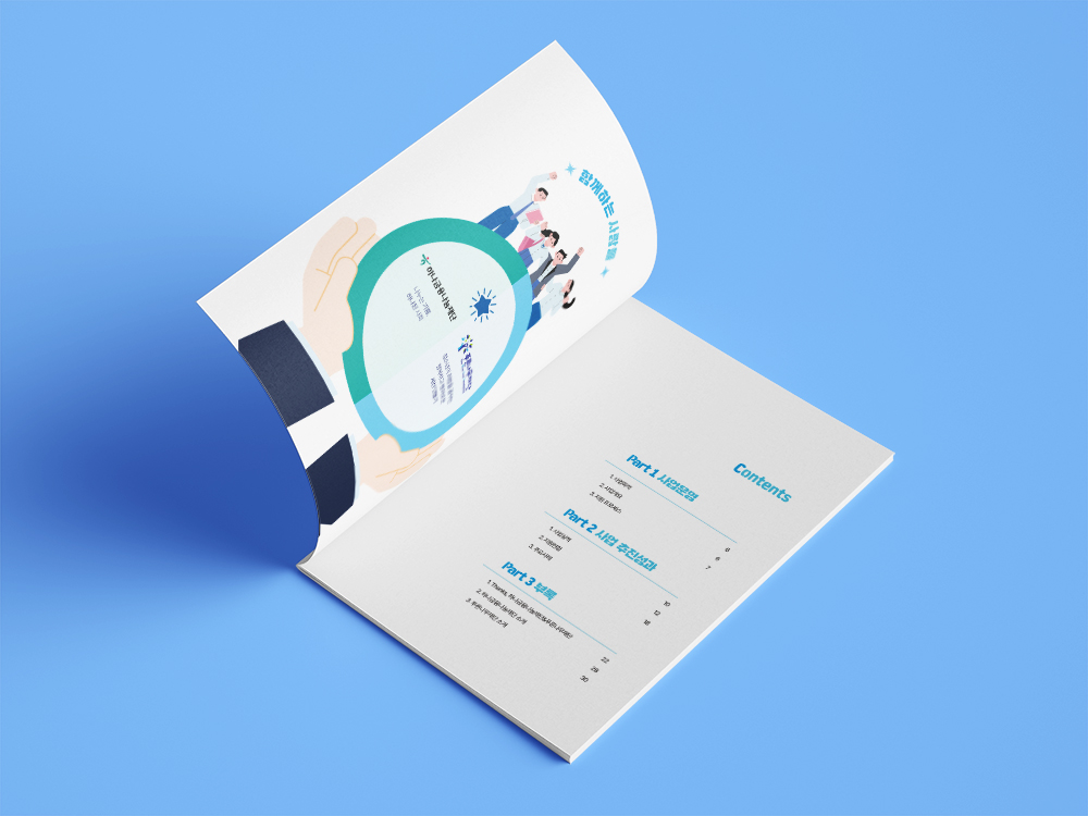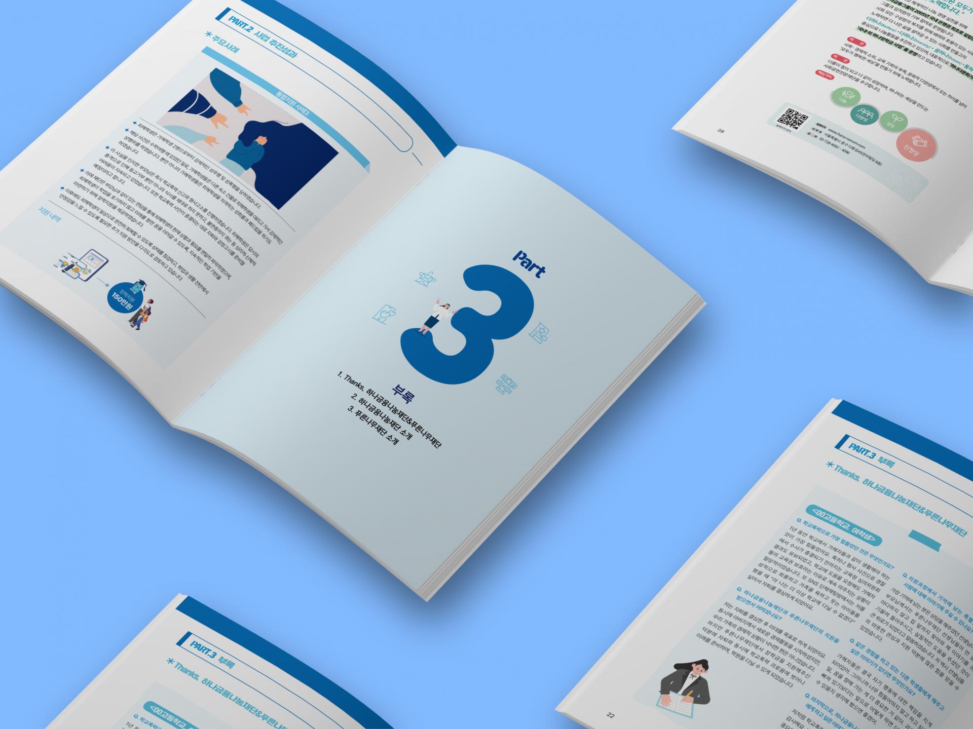 슬로건과의 연결성을 고려해 블루계열의 색상을 활용한 보고서 디자인입니다. 표지에는 스텐실 형태의 폰트로 슬로건을 크게 배치함으로써 재단의 정체성을 강조함과 동시에 디자인의 포인트 역할을 하도록 했습니다. 내지는 내용을 중심으로 구성하되, 다수의 표와 그래프, 사례 문항들을 통일된 톤으로 정리해 깔끔하고 정돈되어 보이도록 편집했습니다.