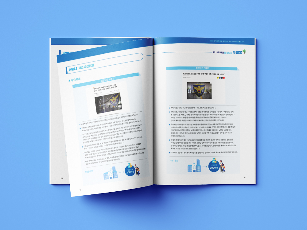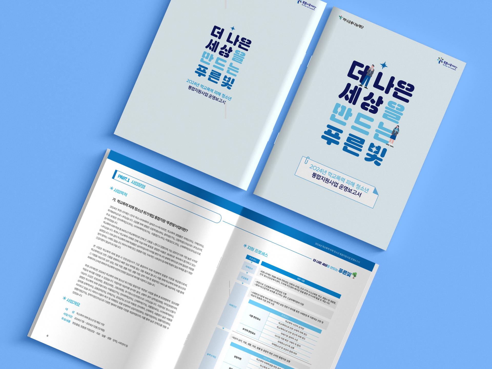 클라이언트 푸른나무재단 | 슬로건과의 연결성을 고려해 블루계열의 색상을 활용한 보고서 디자인입니다. 표지에는 스텐실 형태의 폰트로 슬로건을 크게 배치함으로써 재단의 정체성을 강조함과 동시에 디자인의 포인트 역할을 하도록 했습니다. 내지는 내용을 중심으로 구성하되, 다수의 표와 그래프, 사례 문항들을 통일된 톤으로 정리해 깔끔하고 정돈되어 보이도록 편집했습니다.