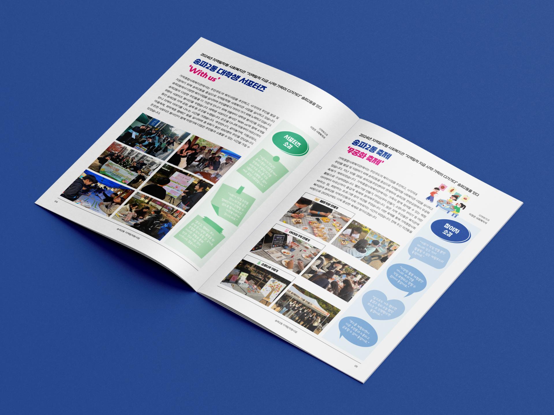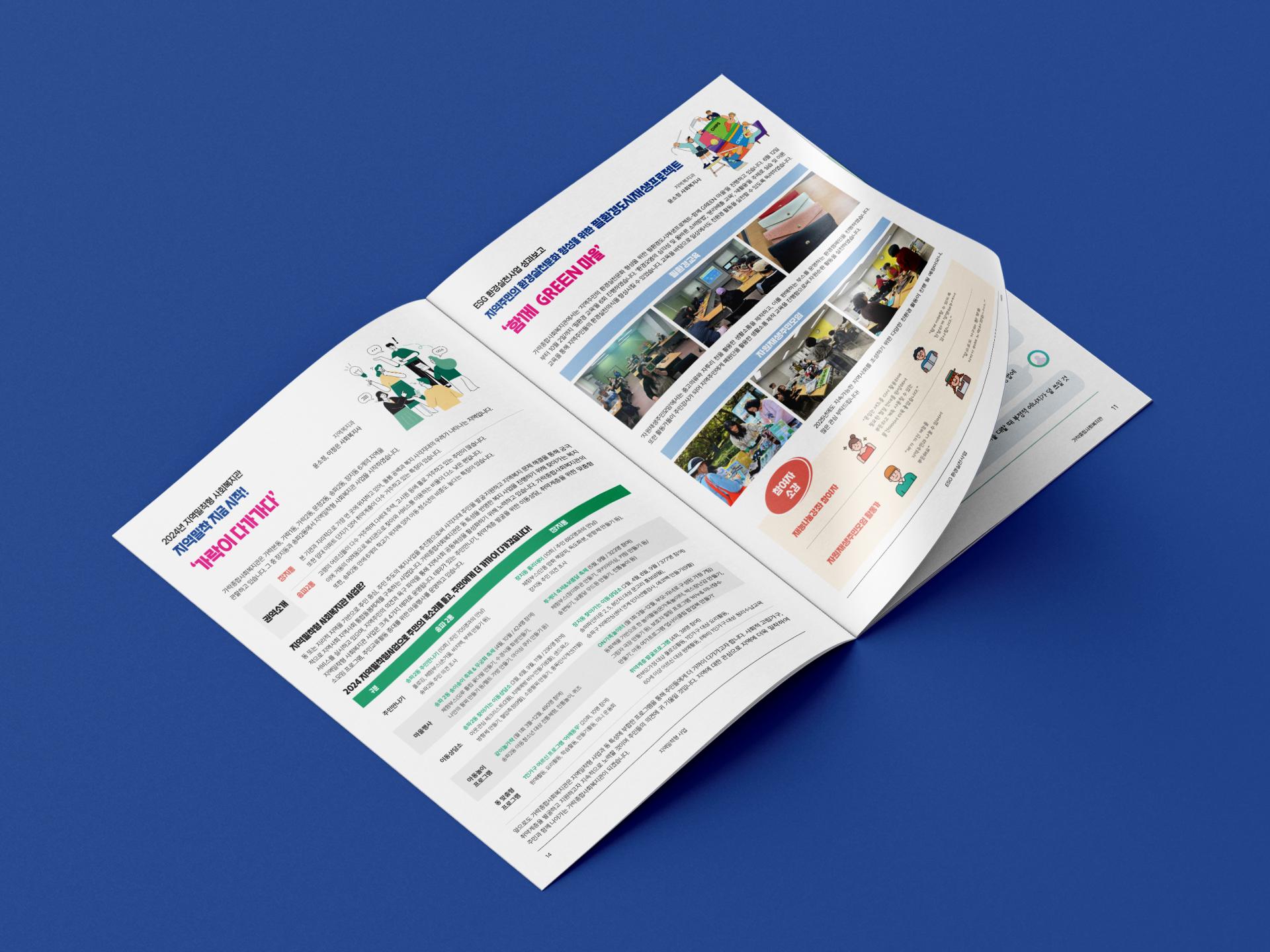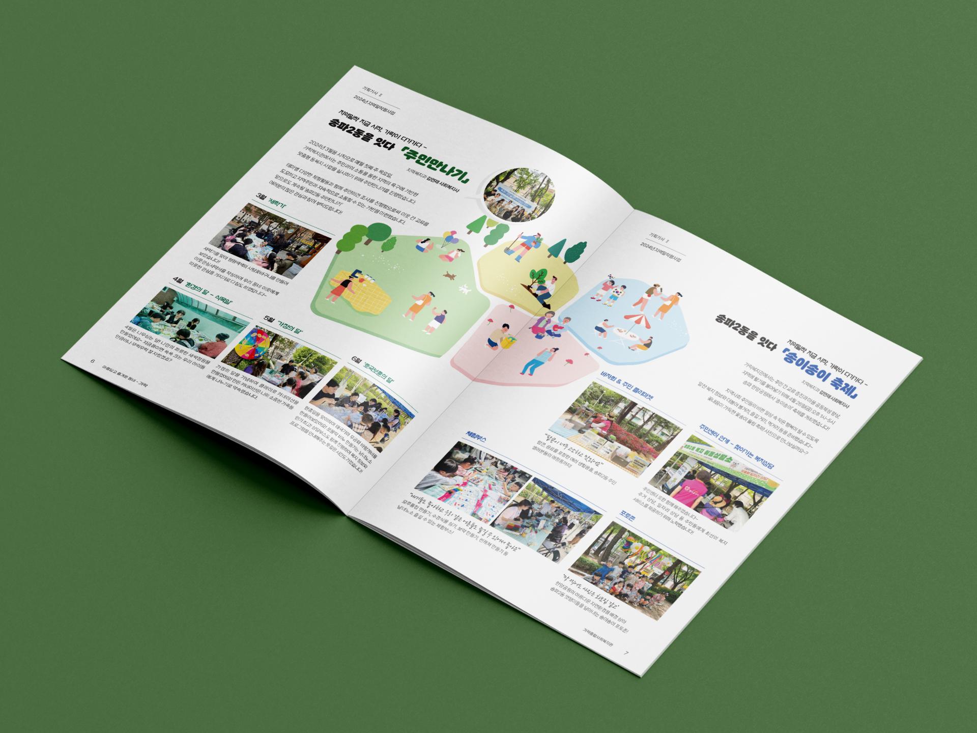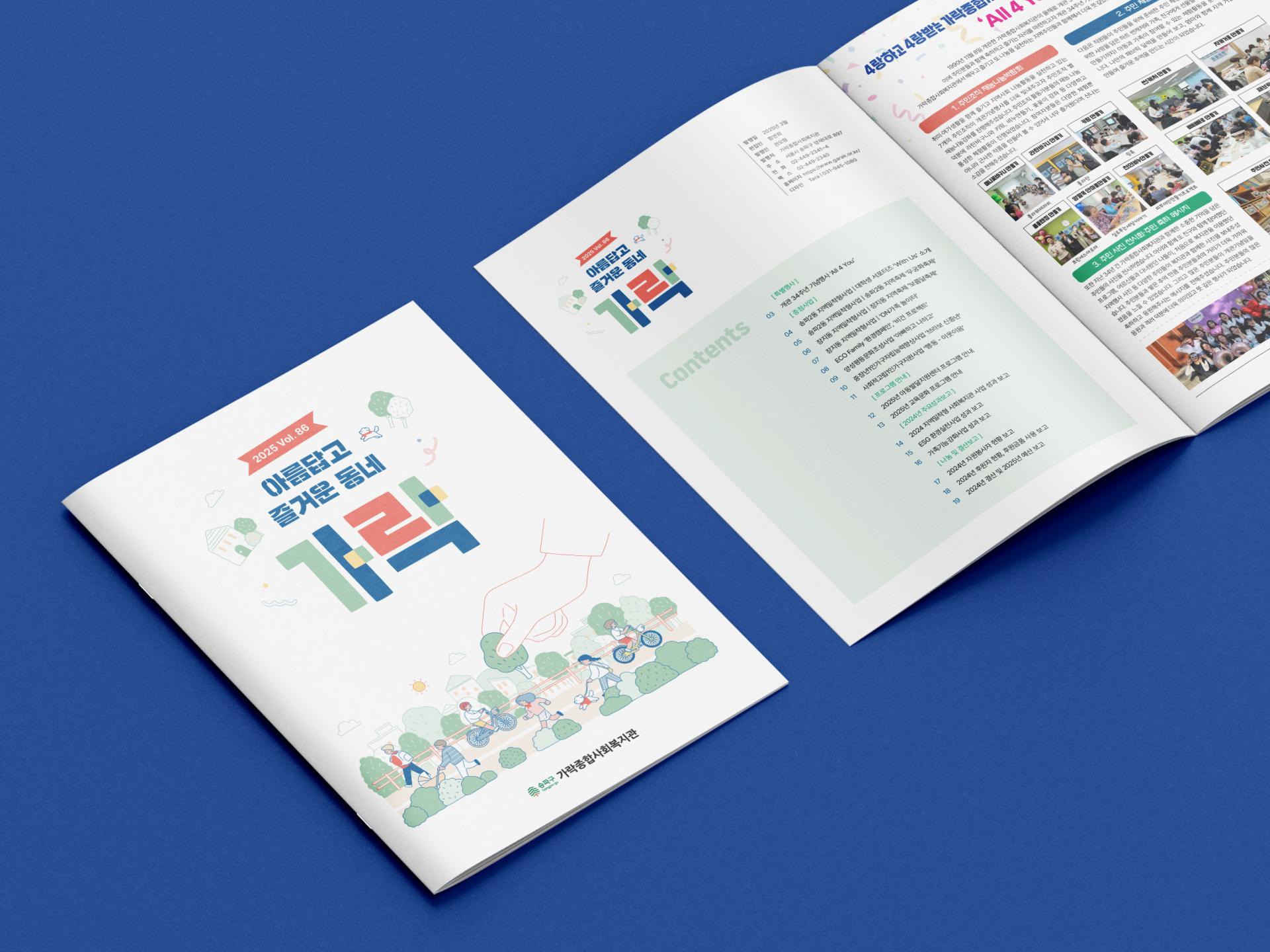 주민들의 생생한 일상을 귀엽고 친근한 일러스트로 담아낸 정기소식지 디자인입니다. 밝고 화사한 컬러를 활용해 경쾌하고 활기찬 분위기를 연출하였으며, 사진/글/일러스트를 다양한 구도의 내지 레이아웃으로 조화롭게 배치하여 정보 전달의 효율성과 함께 독자들이 부담없이 즐겁게 읽을 수 있도록 시각적인 즐거움을 주었습니다.