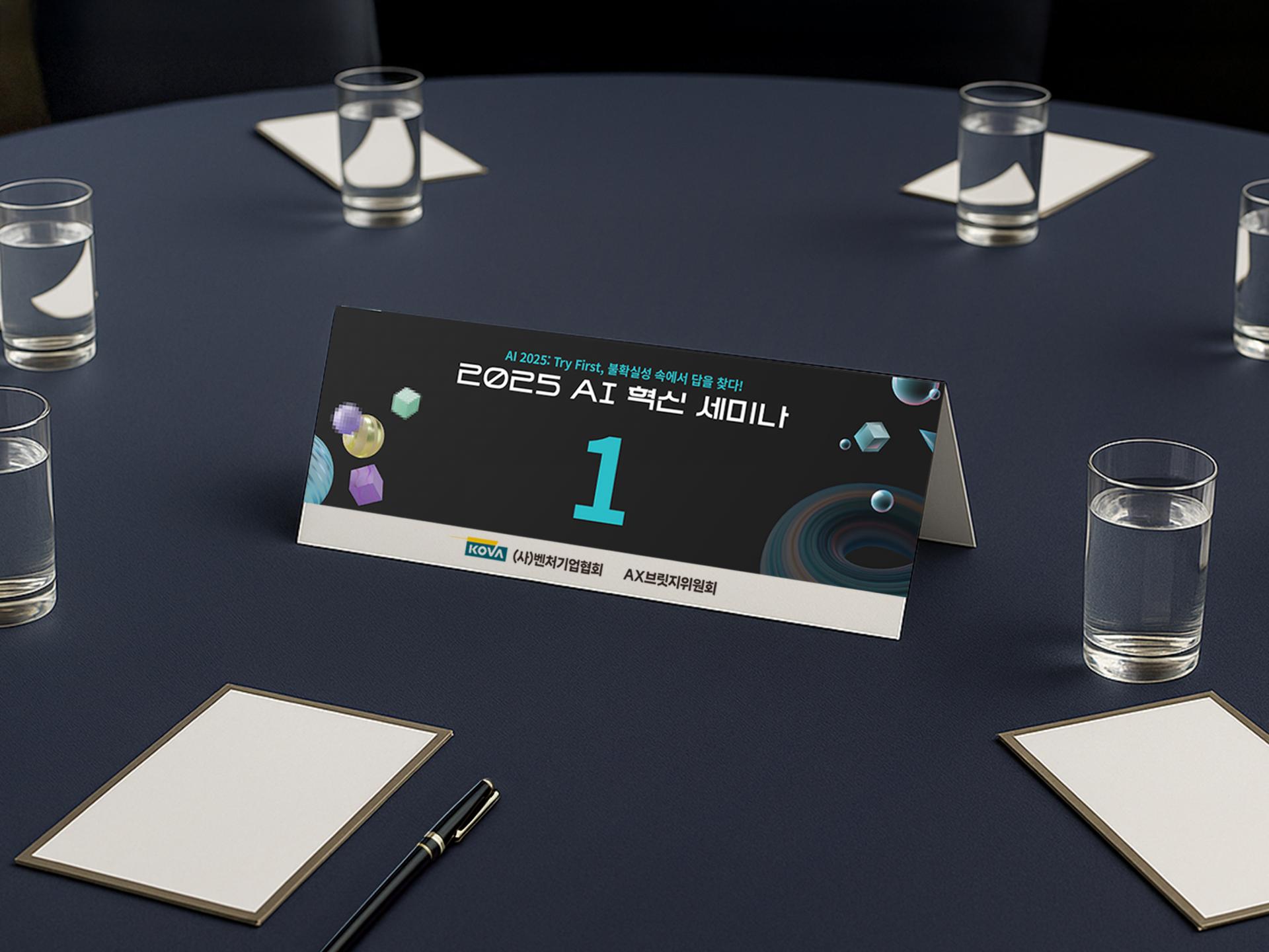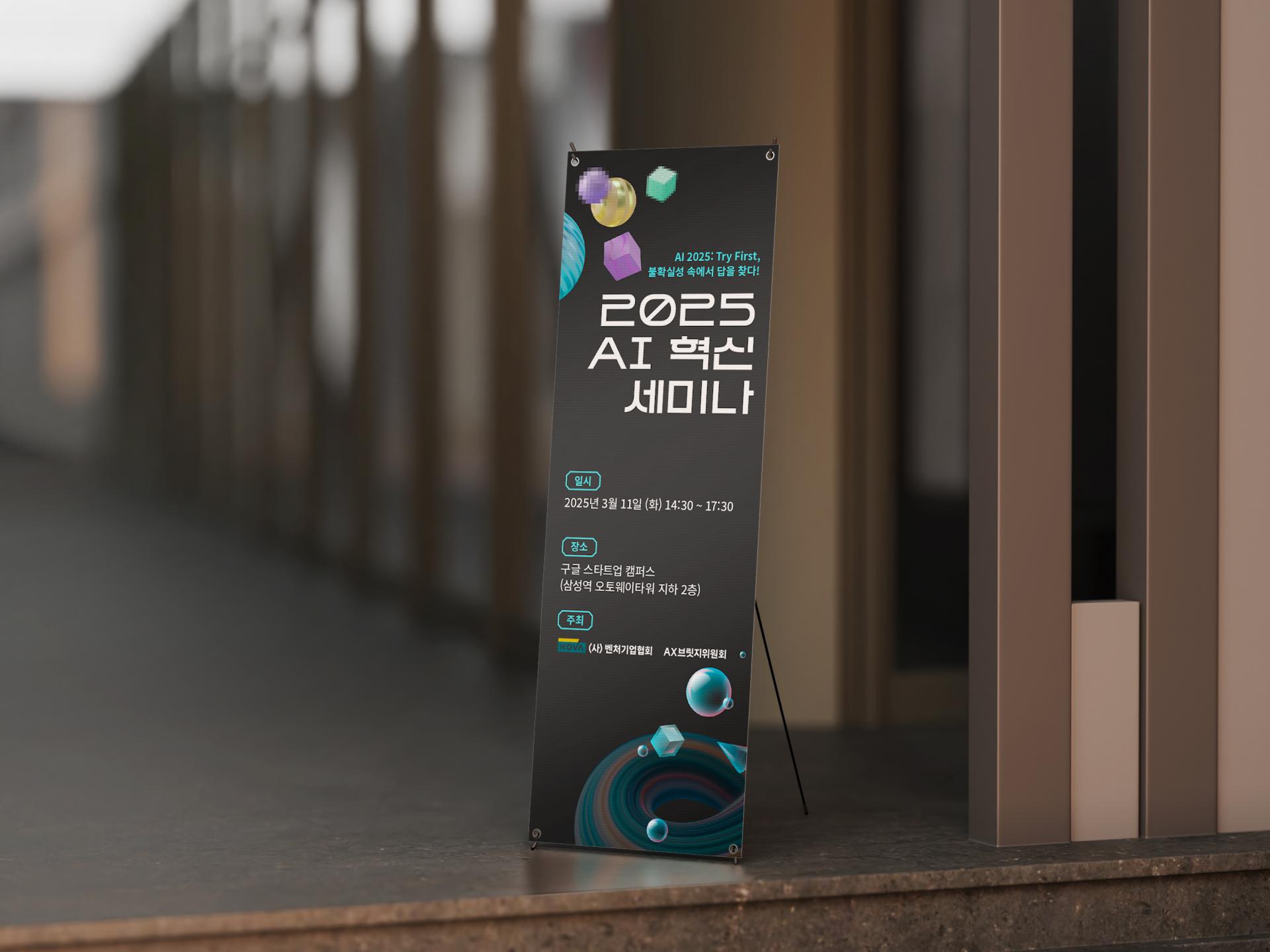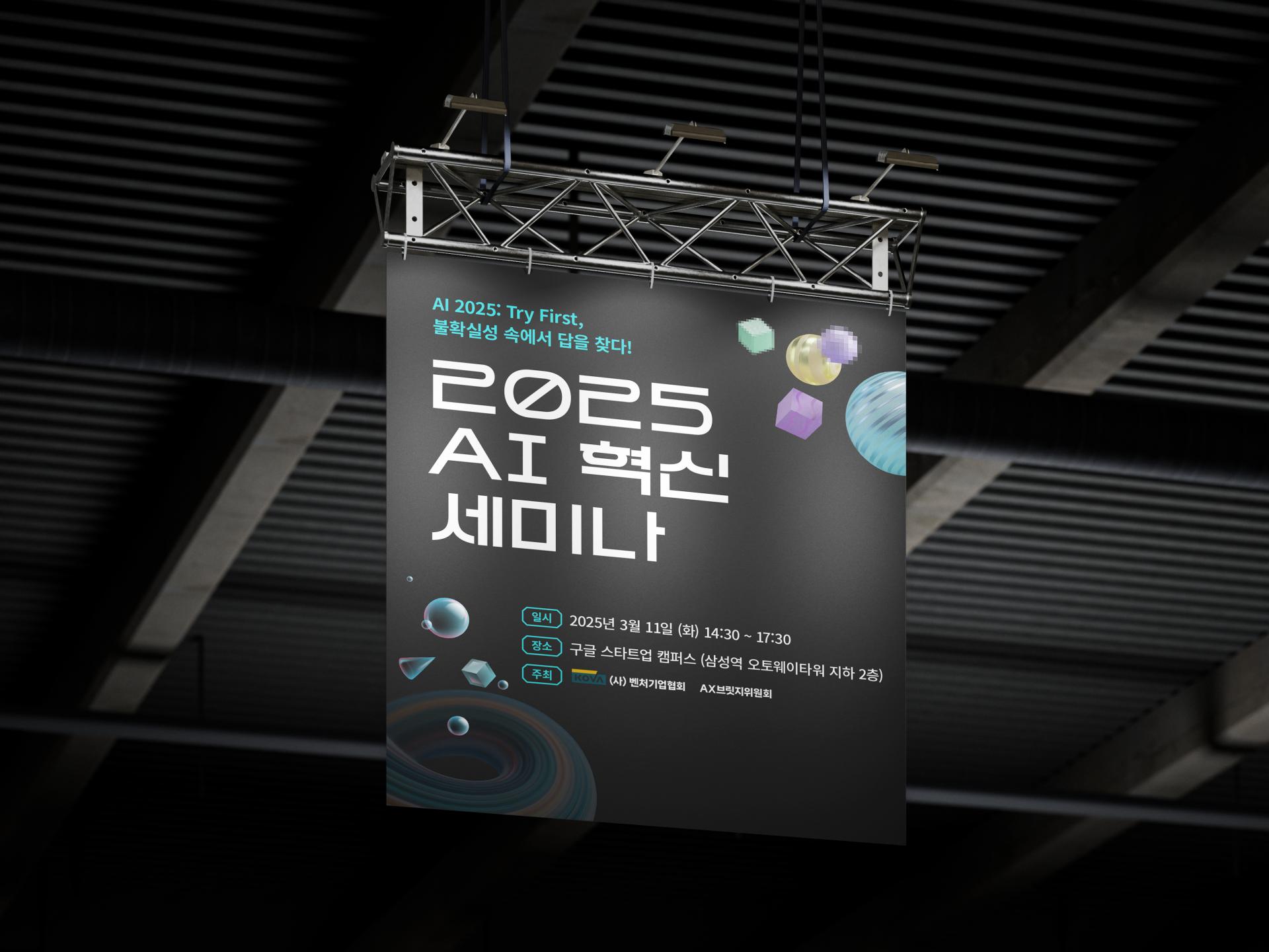 클라이언트 벤처기업협회 | 다채로운 질감의 3D 도형을 키비주얼로 활용하여 AI의 미래지향적 특성을 강조한 세미나 행사 홍보물 디자인입니다. 블랙 단색 배경에 공간감있는 오브제를 배치하여 혁신적인 분위기를 연출하였으며, 고딕계열의 타이틀로 현대적인 느낌과 가독성을 향상시켰습니다. ![]() ![]() ![]()