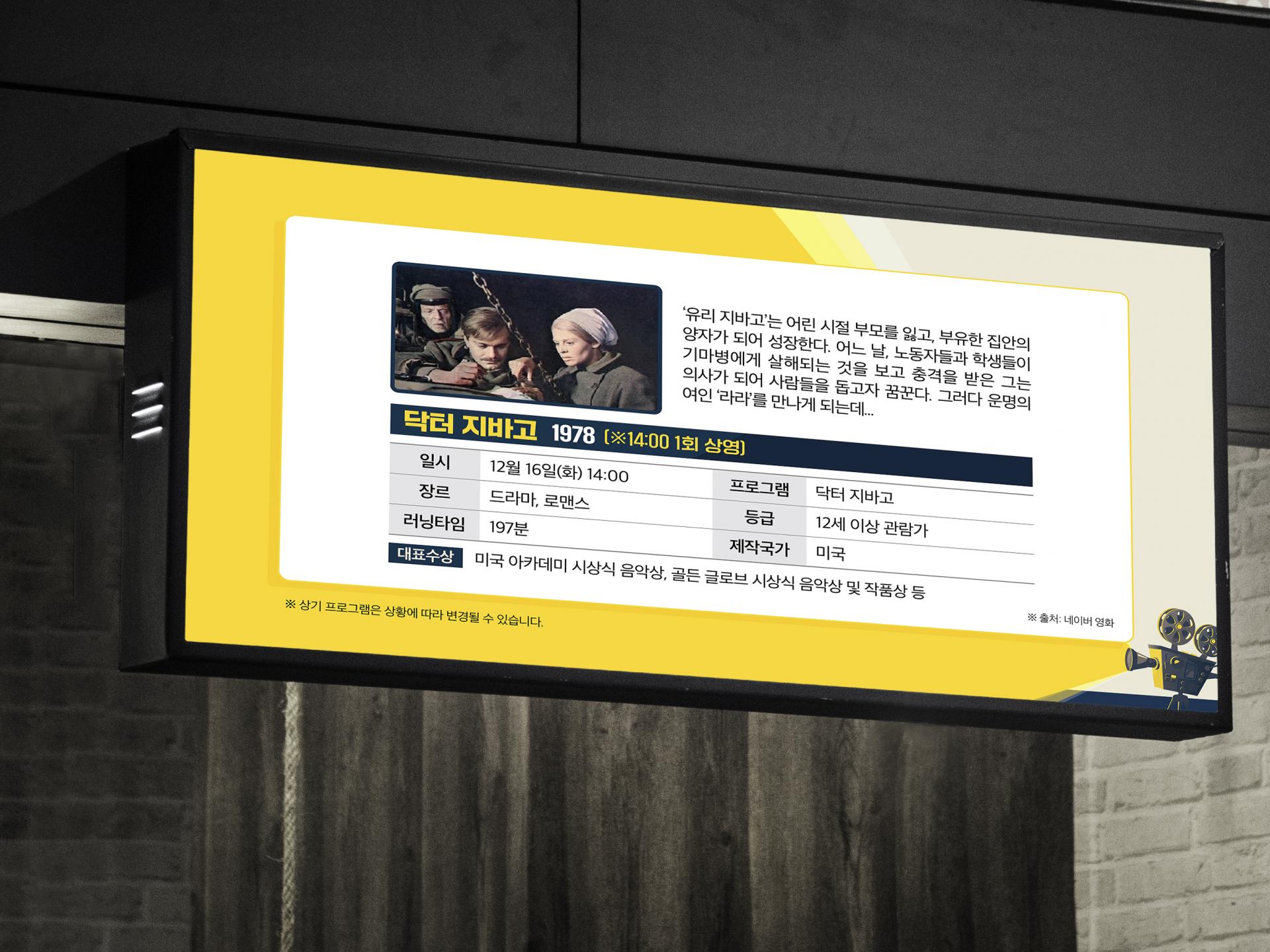 클라이언트 서초문화재단 디자인품목 포스터, 리플렛, 배너, 카드뉴스, 키오스크 제작연도 2025 | 음악상을 수상한 명작 영화들을 선별해 특별 상영하는 ‘2025 심산영화관’ 키비주얼입니다. 클래식한 영화 필름과 영사기를 활용한 그래픽으로 영화관의 감성을 표현했고, 노란색 빛줄기를 따라 배치된 프로그램 정보는 ‘음악이 흐르는 영화관’이라는 콘셉트를 강조합니다. 각 상영작의 대표 포스터를 나열해 프로그램의 다양성과 기대감을 시각적으로 전달하며, 전체적인 레이아웃은 직관적이고 안정감 있게 구성되어 관람 정보를 쉽게 파악할 수 있도록 했습니다. ![]() ![]() ![]() ![]() ![]() |
