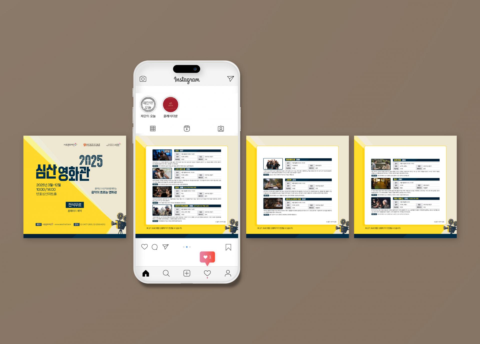 음악상을 수상한 명작 영화들을 선별해 특별 상영하는 ‘2025 심산영화관’ 키비주얼입니다. 클래식한 영화 필름과 영사기를 활용한 그래픽으로 영화관의 감성을 표현했고, 노란색 빛줄기를 따라 배치된 프로그램 정보는 ‘음악이 흐르는 영화관’이라는 콘셉트를 강조합니다. 각 상영작의 대표 포스터를 나열해 프로그램의 다양성과 기대감을 시각적으로 전달하며, 전체적인 레이아웃은 직관적이고 안정감 있게 구성되어 관람 정보를 쉽게 파악할 수 있도록 했습니다.