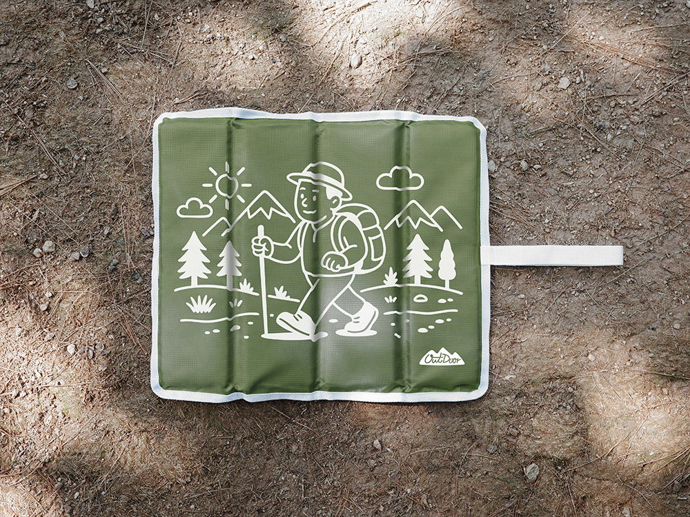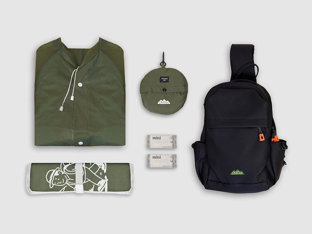 생활방수 기능 굿즈와 위생용품을 결합해 실용성과 활용도를 높인 야외활동 보조 키트입니다. 전체적인 구성은 노지 캠핑과 자연을 연상시키는 카키 컬러 중심으로 통일감을 주며, 브랜드 심볼은 손글씨 느낌의 로고와 산 모양을 조합해 자유롭고 귀여운 감성을 전합니다. 와펜처럼 보이는 심볼은 기능성과 감성의 균형을 이뤄, 일상 속에서도 가볍게 아웃도어 무드를 즐길 수 있게 해줍니다.