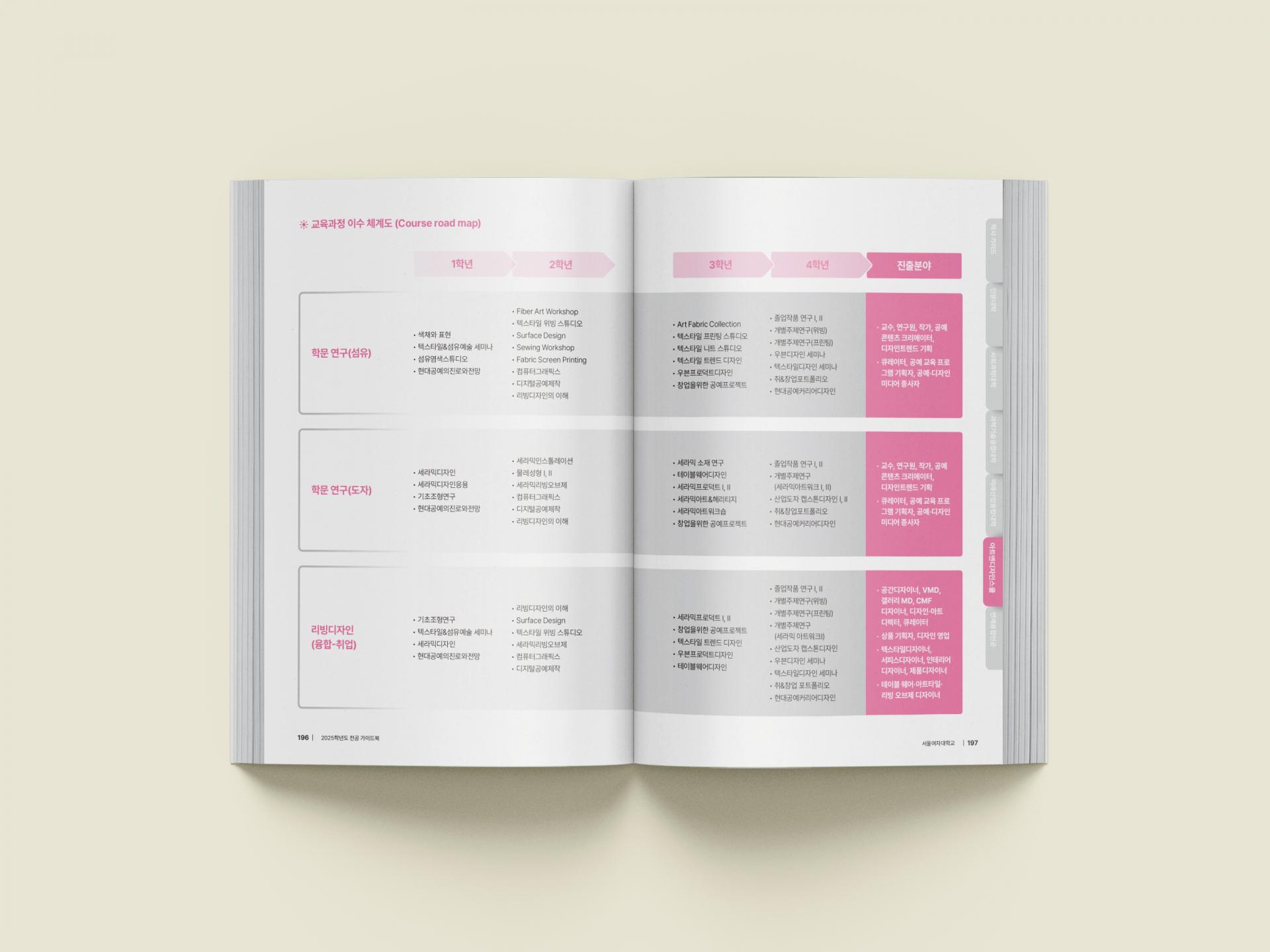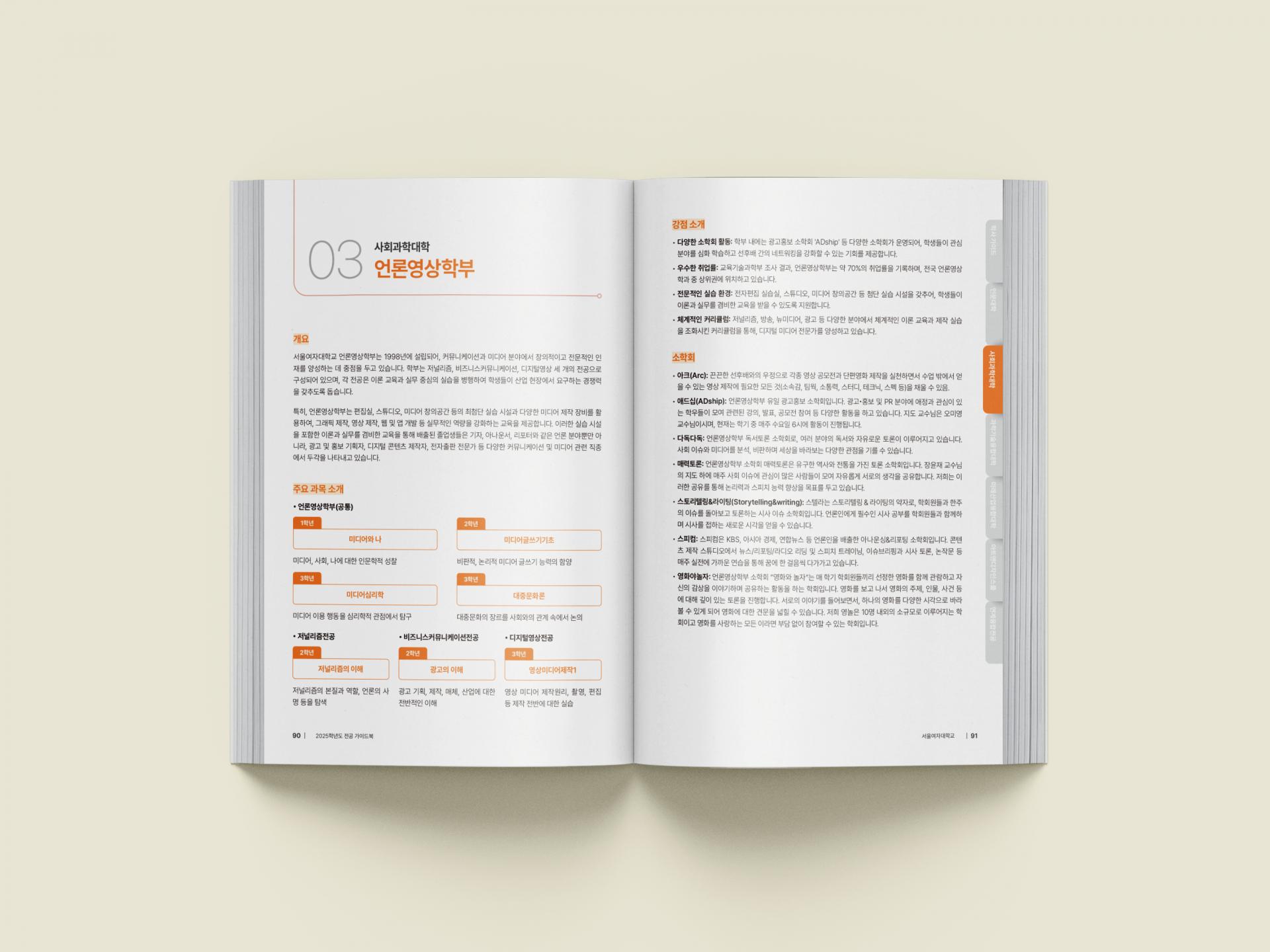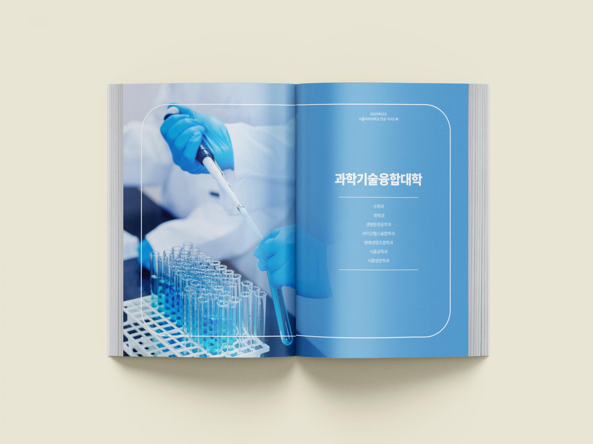 클라이언트 서울여자대학교 | 기관의 대표 캐릭터들이 배를 타고 항해를 하는 일러스트 표지로 새로운 학문의 여정에 대한 설레임을 표현한 대학 전공 가이드북입니다. 내지엔 전공 별 대표 컬러를 지정하여 페이지를 직관적으로 구분할 수 있으며, 우측 사이즈에 위치한 탭 디자인은 네비게이션 역할의 실용적 기능을 담고 있습니다.