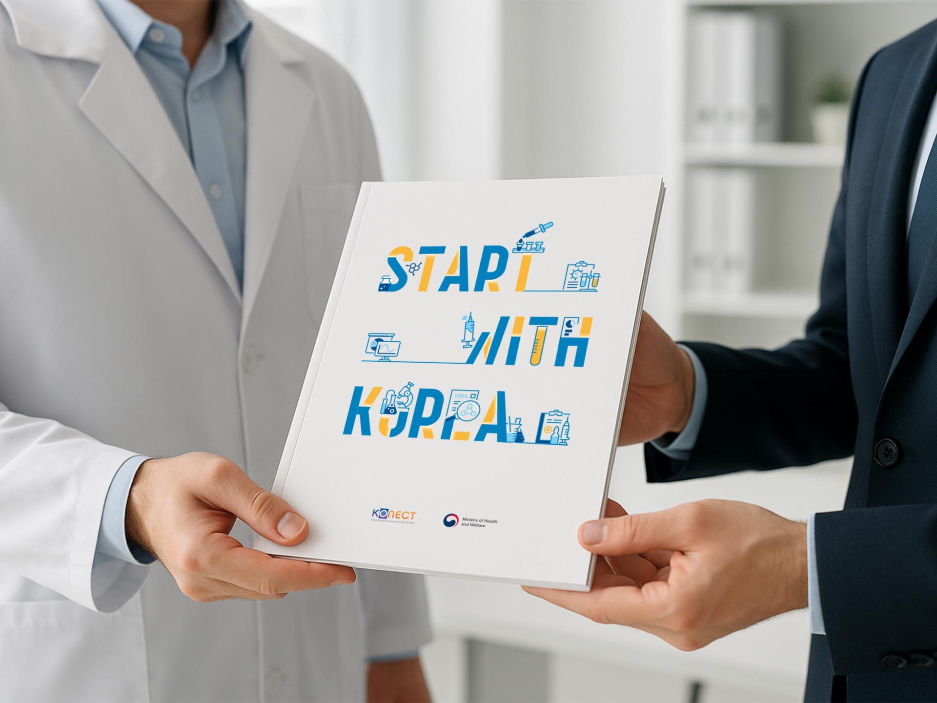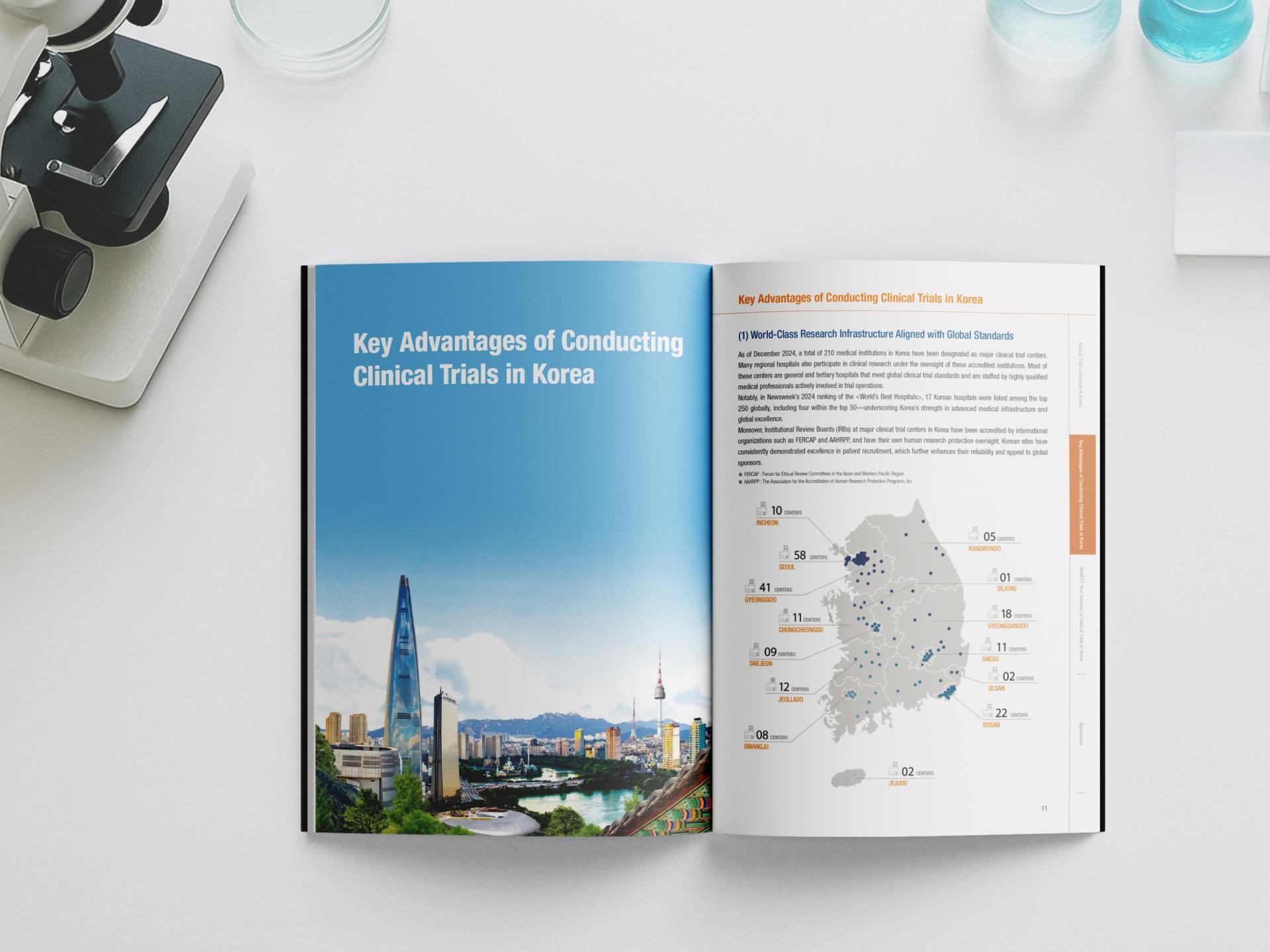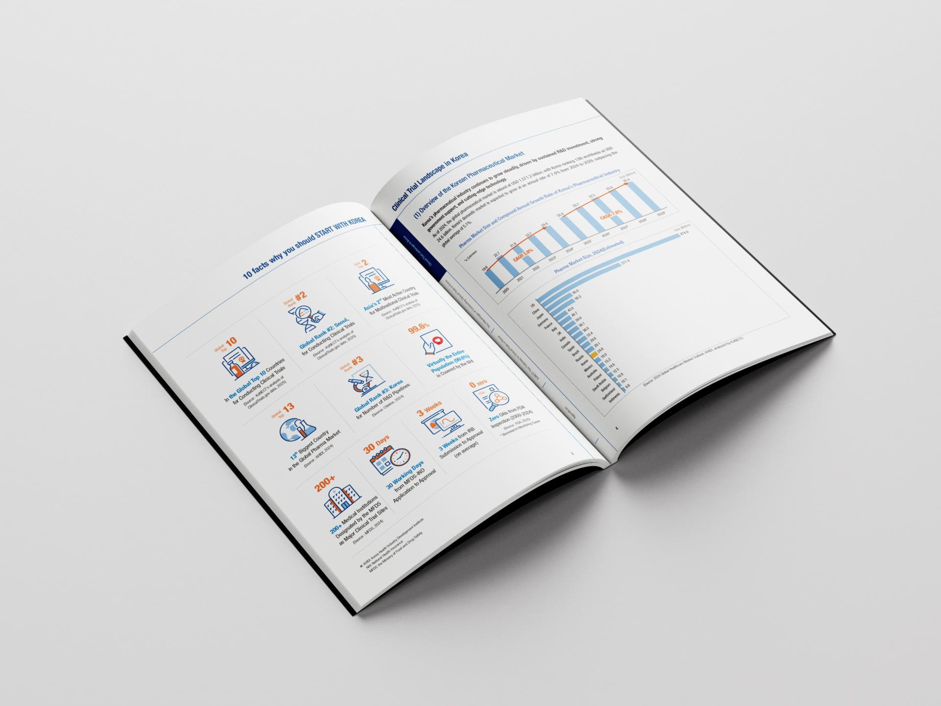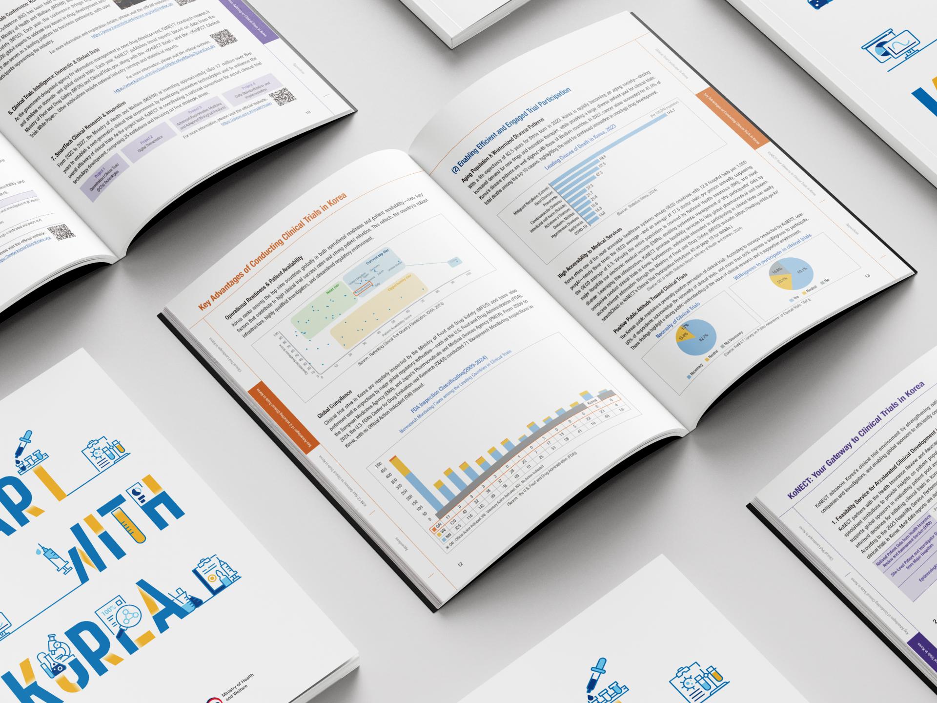 한국의 임상 실험 강점을 효과적으로 알리기 위해 각종 도표와 인포그래픽으로 가독성과 전문성에 중점을 둔 브로슈어 디자인입니다. 'START WITH KOREA'라는 핵심 메시지를 바이오 산업 관련 아이콘과 함께 표지에 활용하였으며, 내지는 양 사이드의 수직형 인덱스로 구분하여 정보를 시각적으로 분류하였습니다.